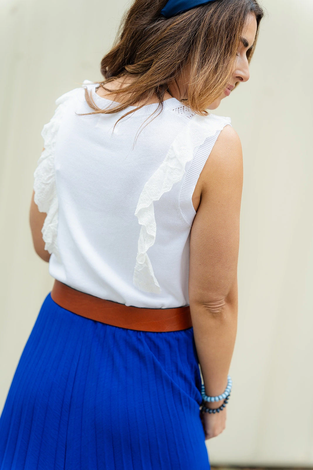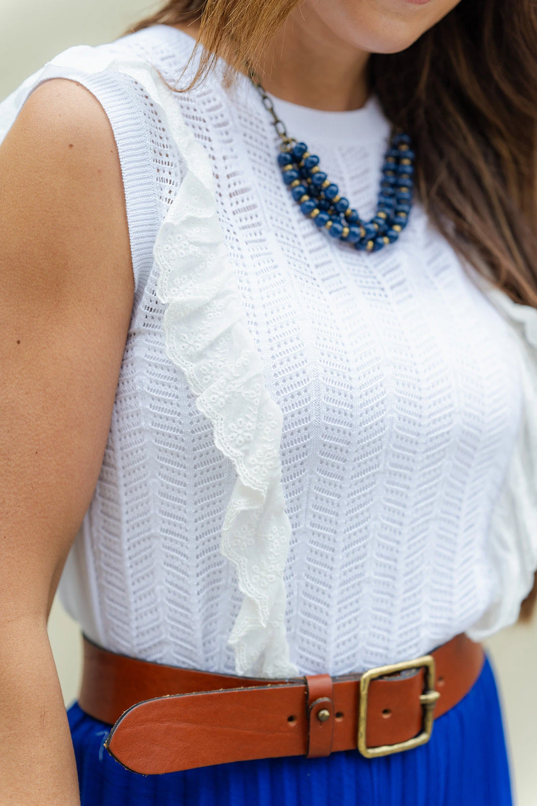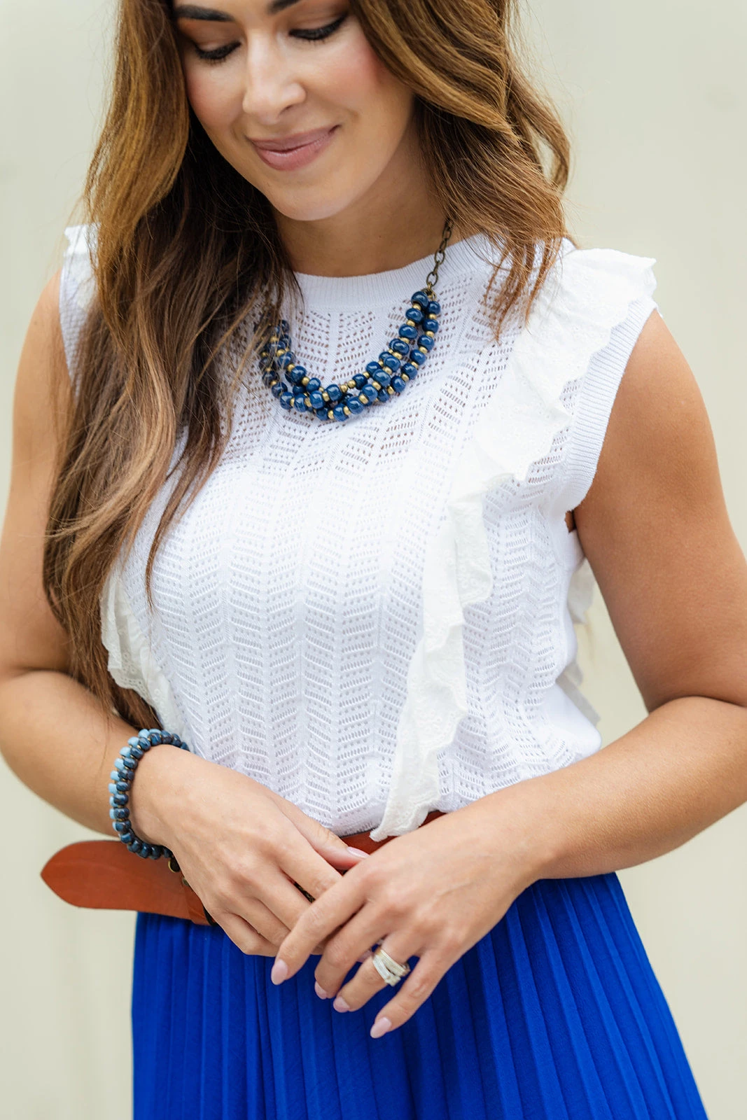 So many things to love about this tank! The knit pattern with the eyelet ruffle accents really sets this apart from the rest! This is easy to pair with shorts or a skirt in the warmer months or to layer with a cardigan, blazer, or jacket in the cooler ones! We love that this can be dressed up or down for everyday wear.