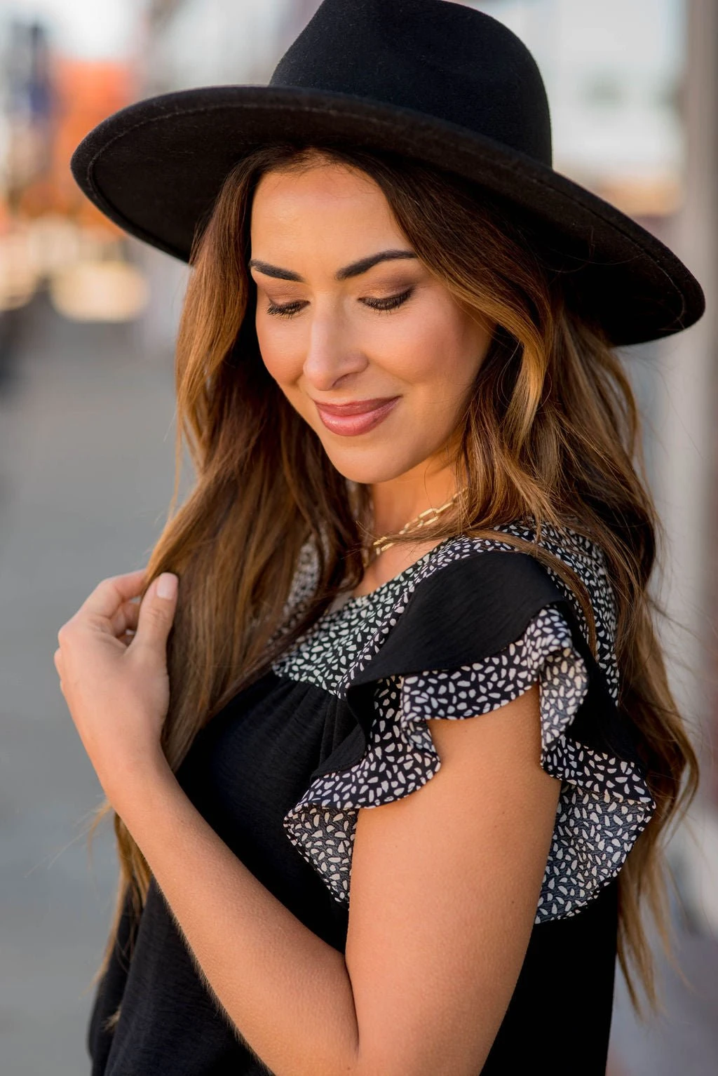 We’re loving this speckled print and the ruffle trim of this tee! The bib style makes it ideal for any body shape or size, and this tee can easily be dressed up or down for wherever the day takes you! Pair with a denim jacket or cardigan for the cooler months too.
