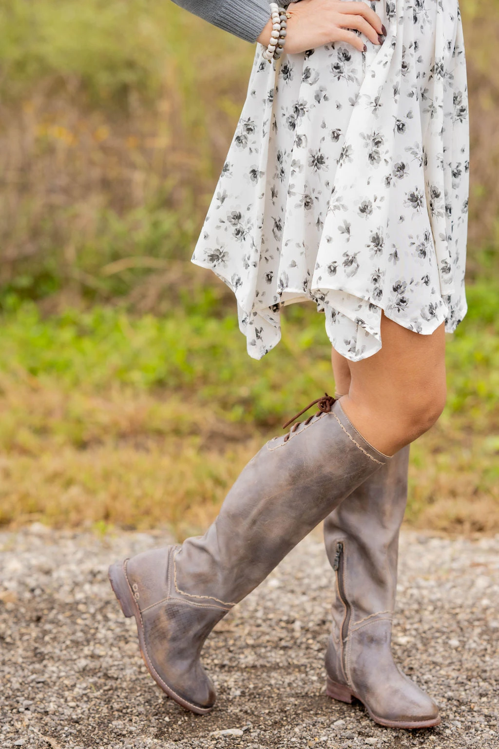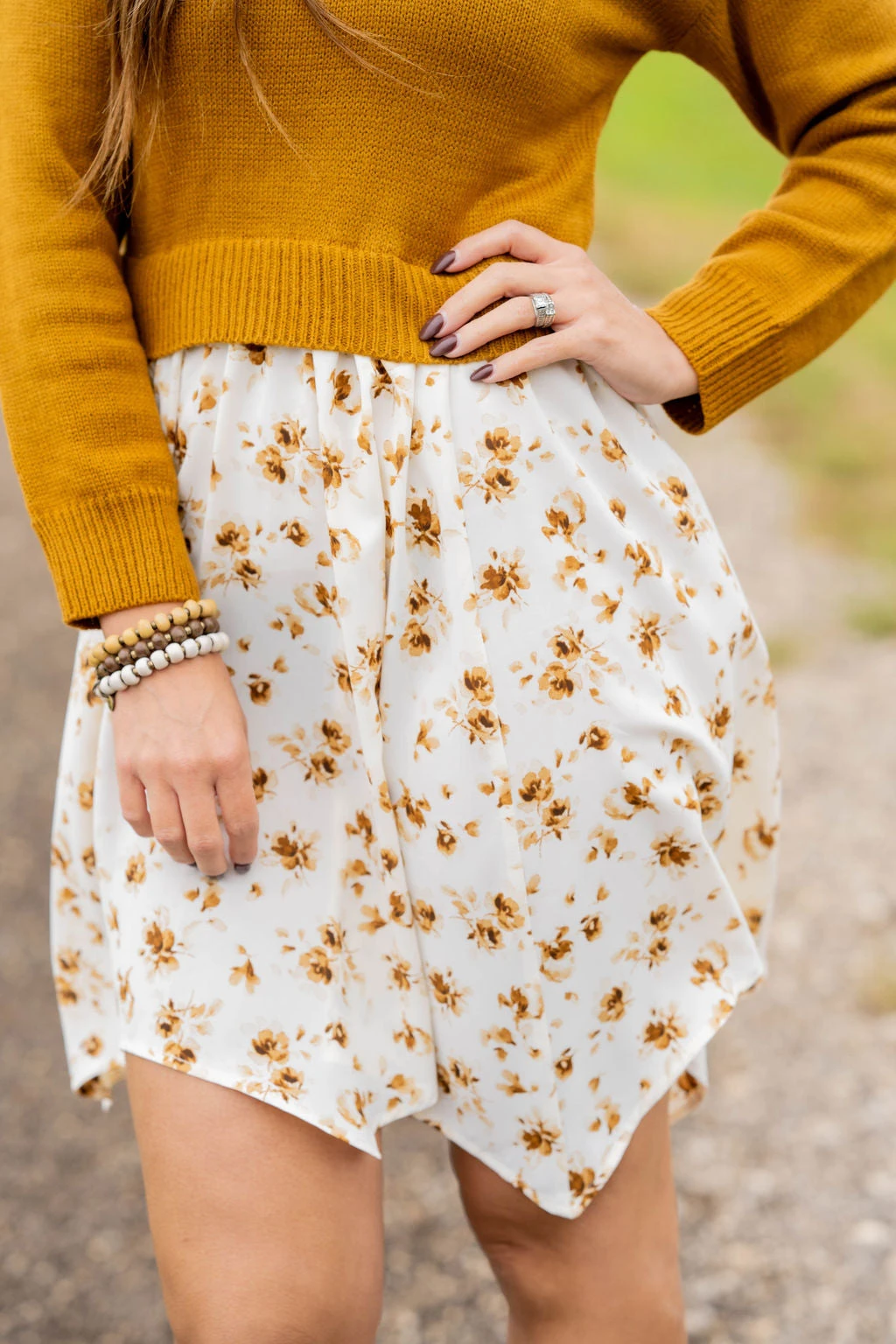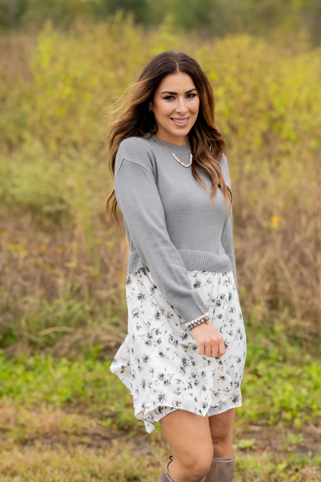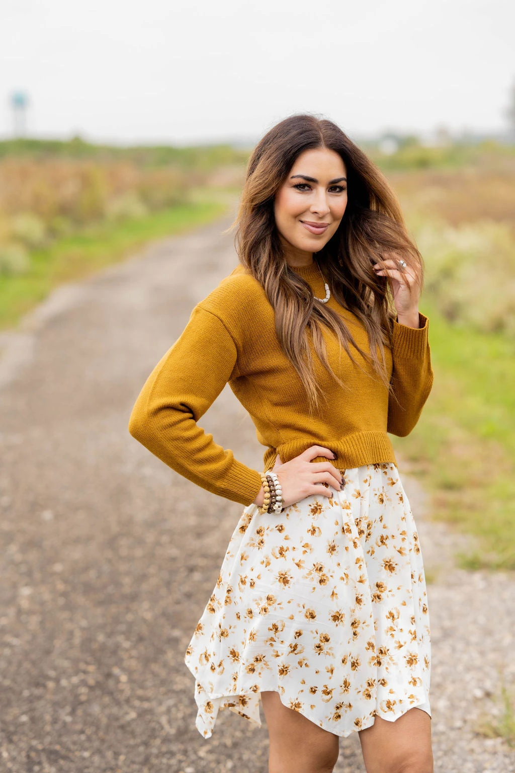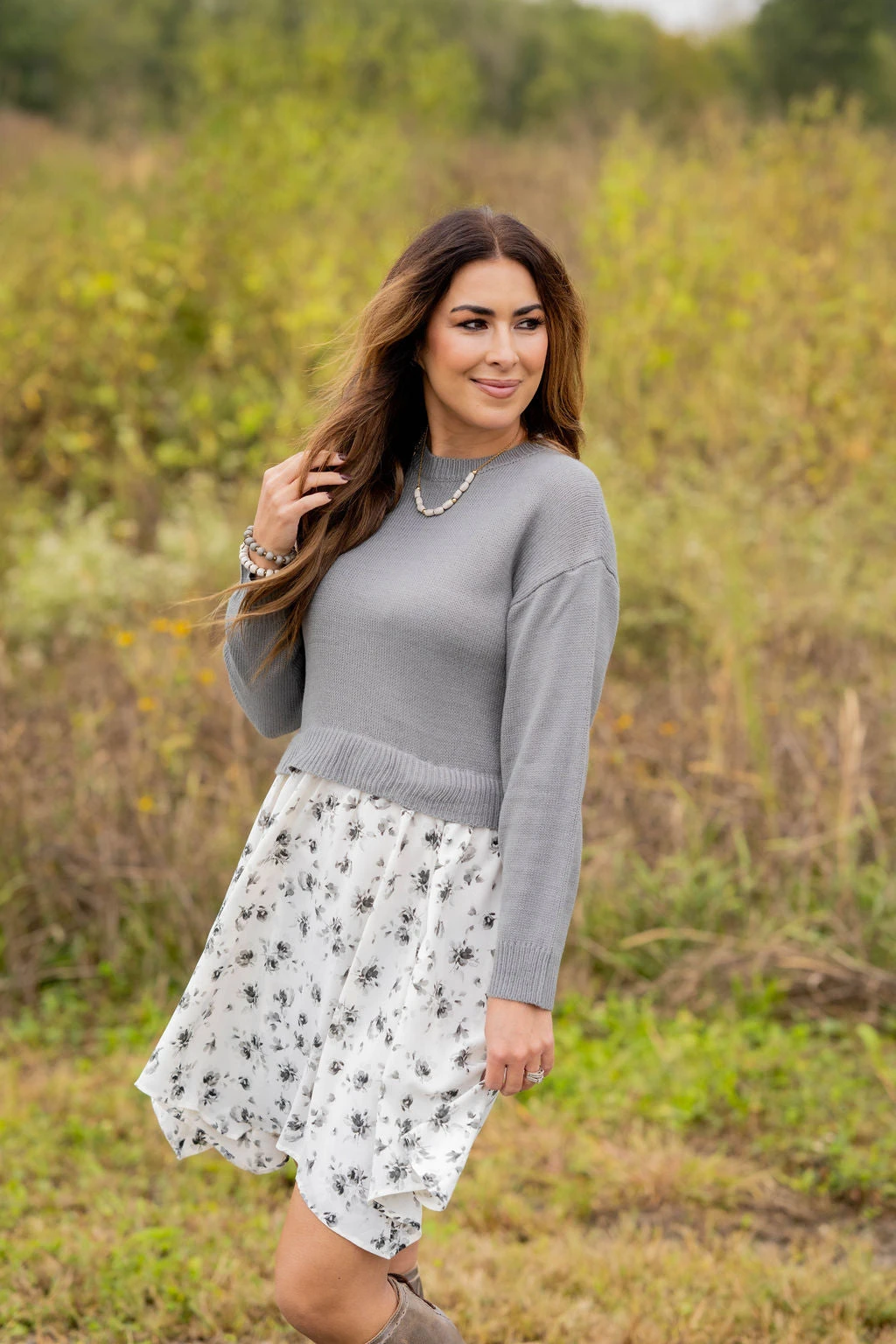 This dress is so fun and unique that you’re going to want it in every color! With a sweater-like top and a flowy floral printed bottom that resembles a sweater and skirt combo! This works perfect for the office or classroom, a wedding, church, family pictures, the holidays, or date night on the town! We suggest pairing with a pair of boots or fun heels and your favorite accessories for a complete Betsey’s look!