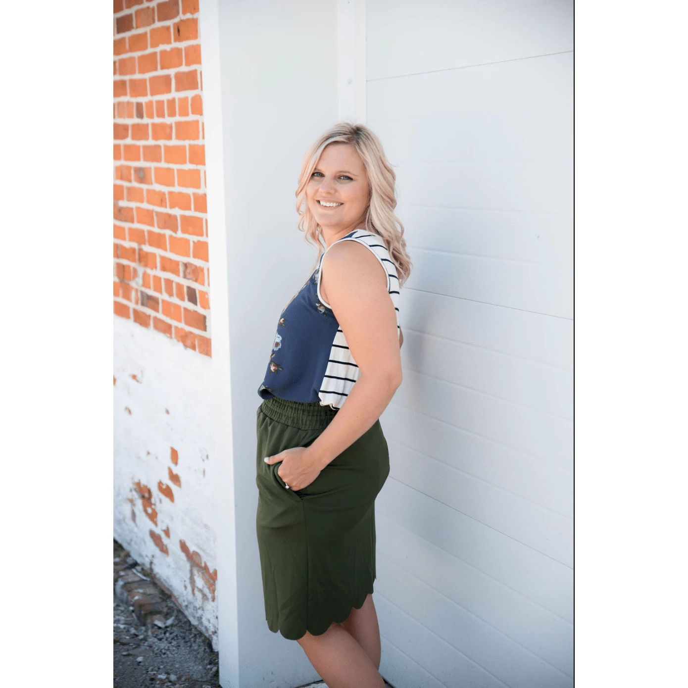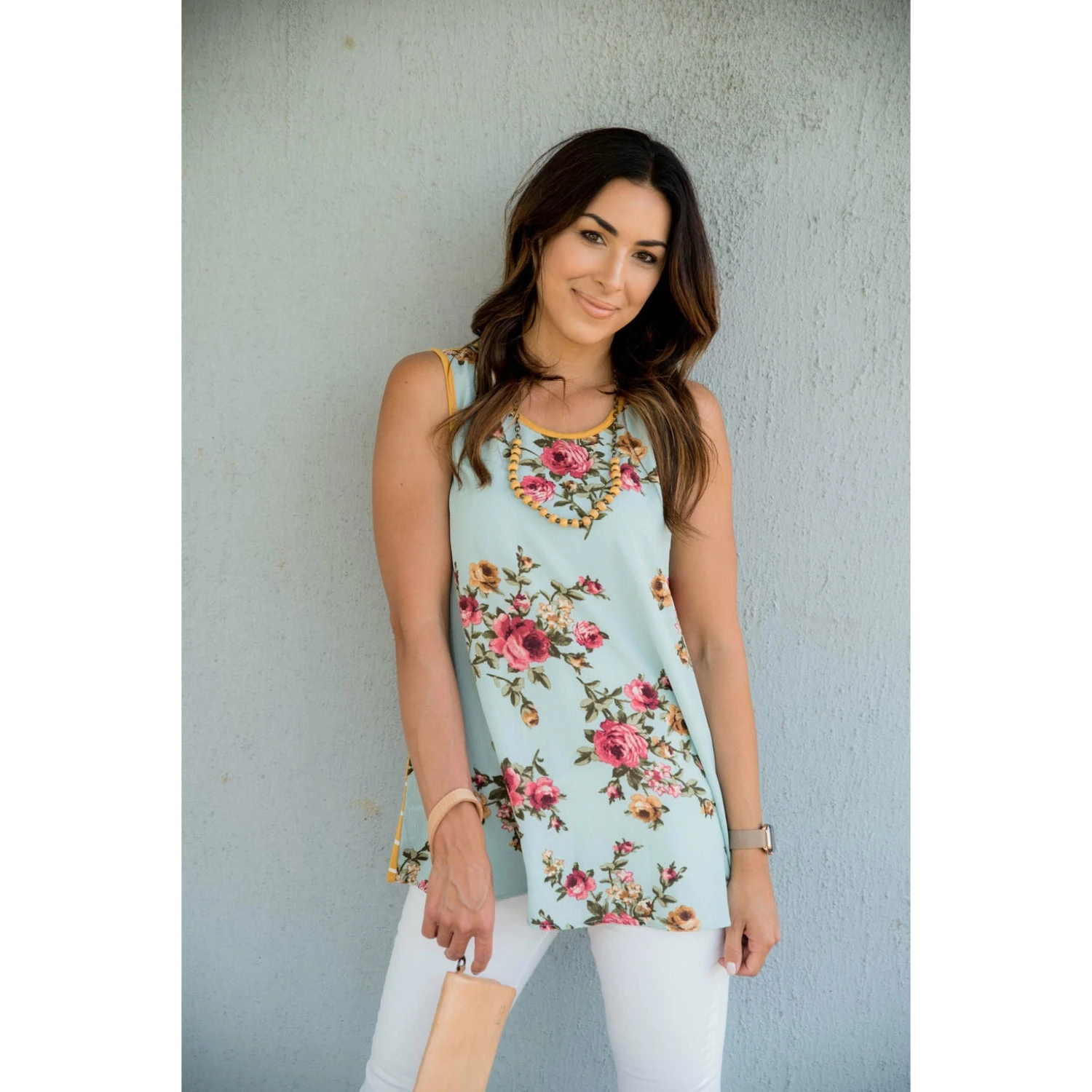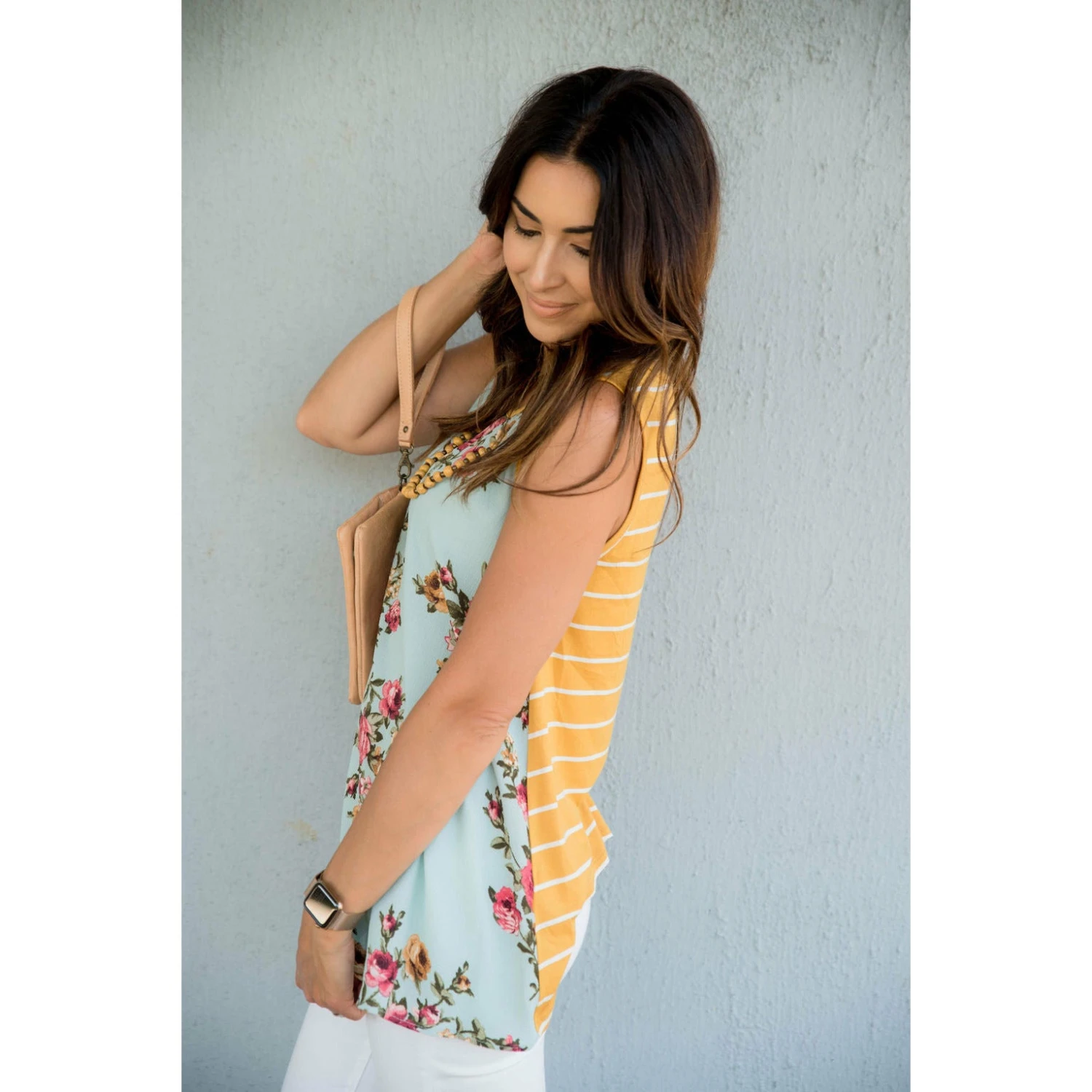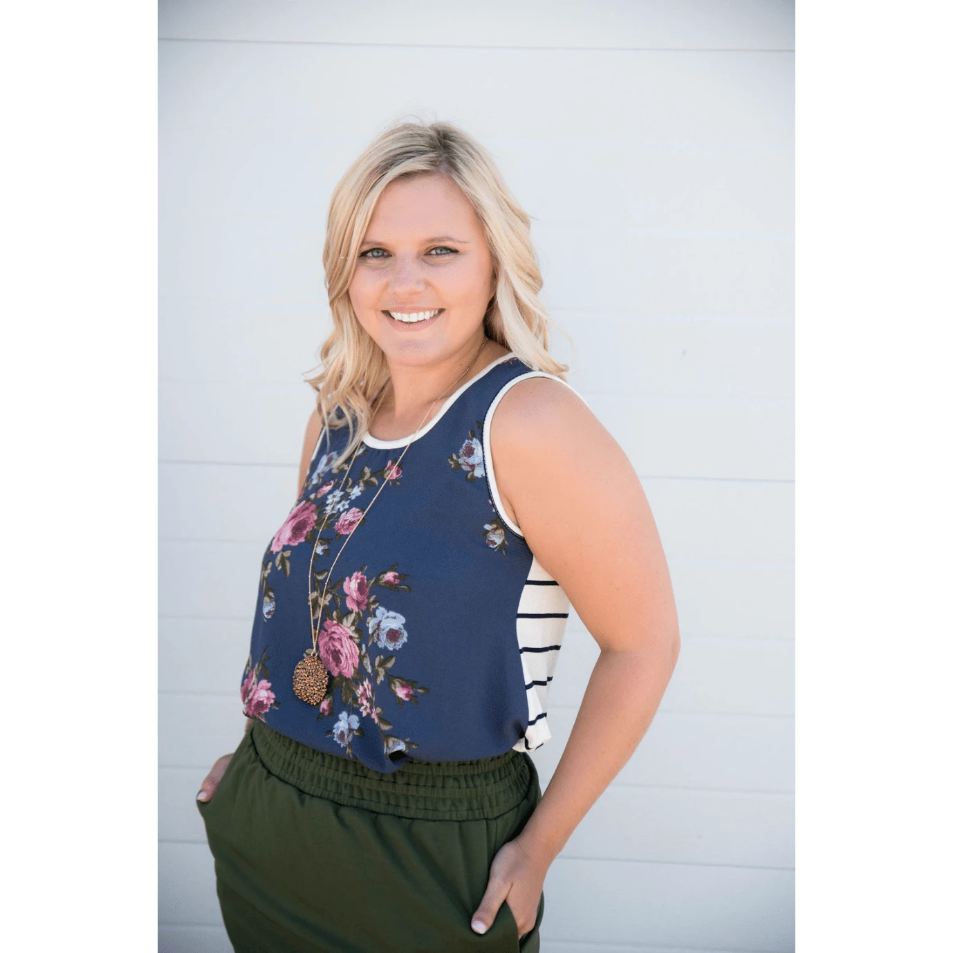 Pattern mixing is an art and this tank is a masterpiece! The front is a floral print blouse material, and the back is navy and ivory striped in a soft tee material. We love this paired with a bloom necklace and either a solid colored skirt, or even just your favorite pair of denim!