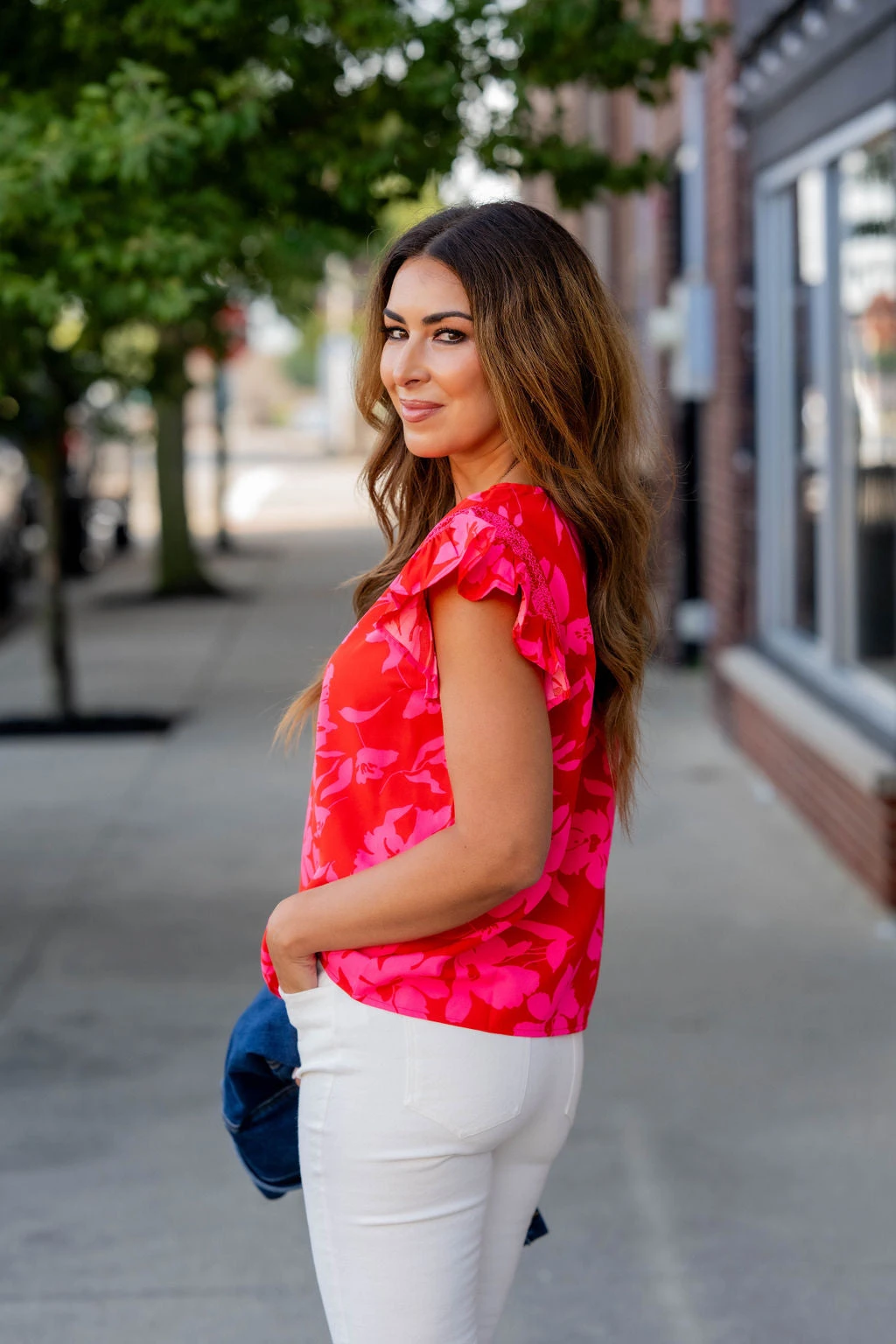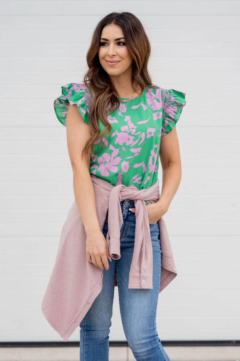 The ruffle trim, ruched accents, and floral print on this blouse sets it apart from the rest! The lightweight and breathable material makes this ideal for any season! Pair with your favorite denim, a bold colored pair of our Betsey’s Jeggings, or even just some leggings for a unique look!