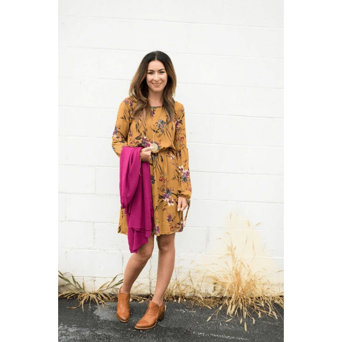 We’re loving this rich floral print with the ruffle accents on the shoulders and the cinched waist! The sleeves create a slimming look and the tie bottom sleeves!