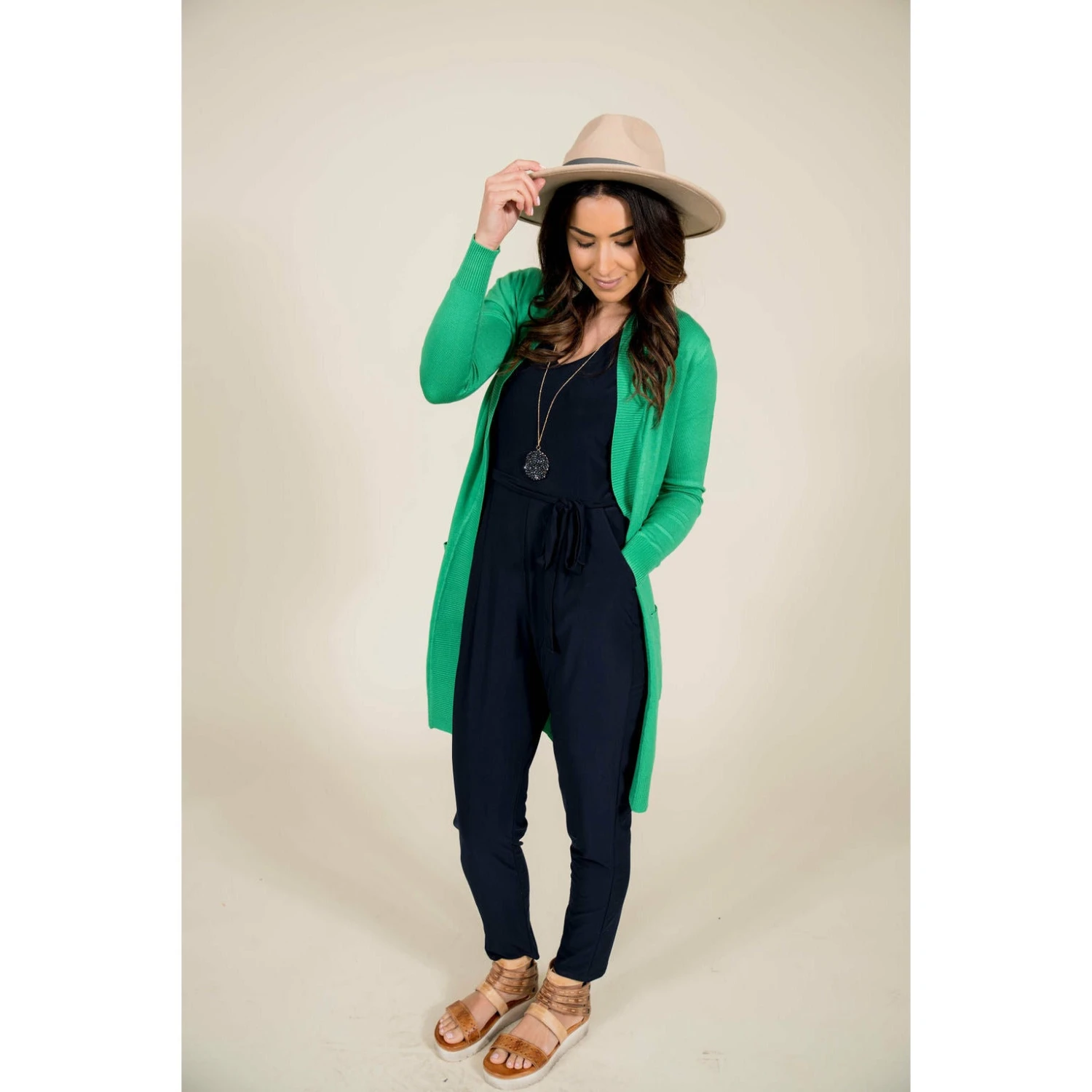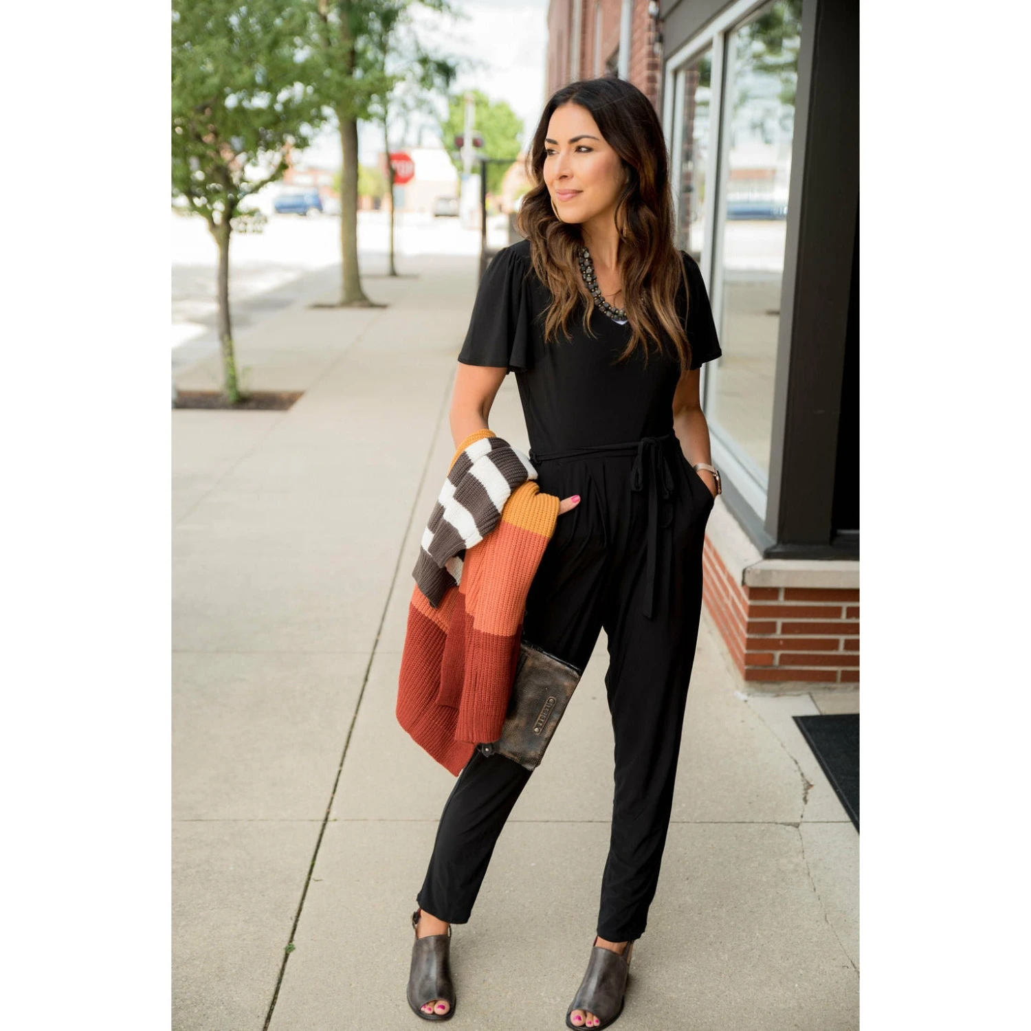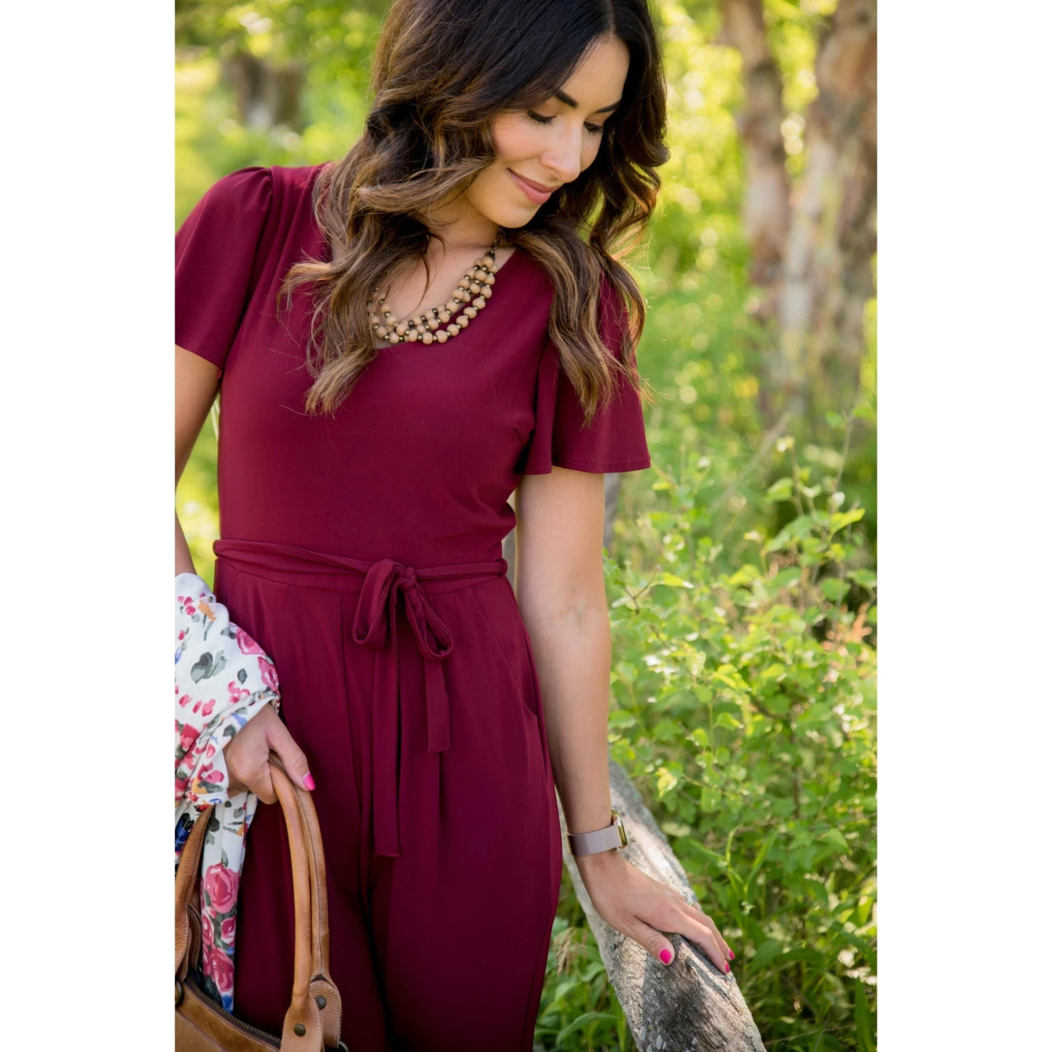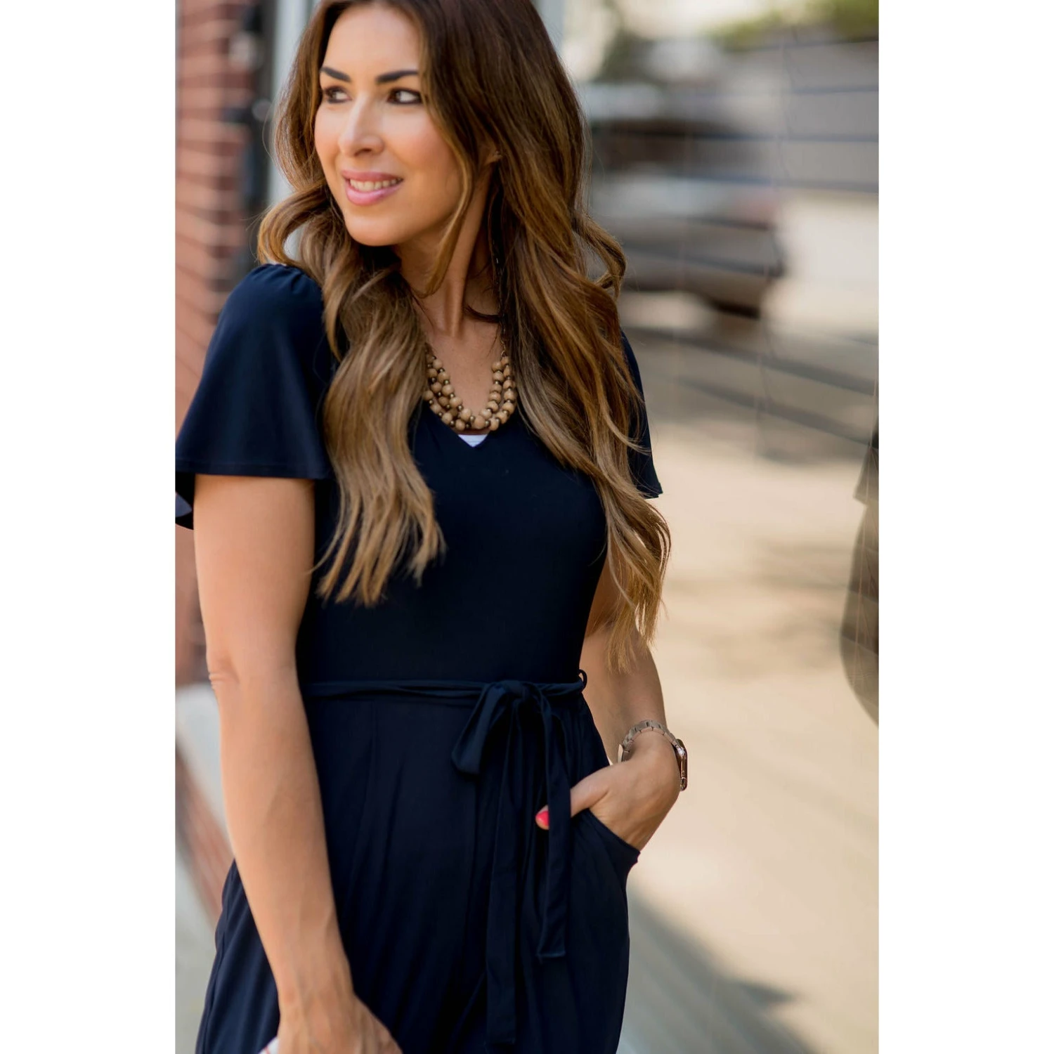 This jumpsuit has a very classy look to it! It features short flutter sleeves, a keyhole back, a tie around the waist and pockets! Dress to impress with this jumpsuit!