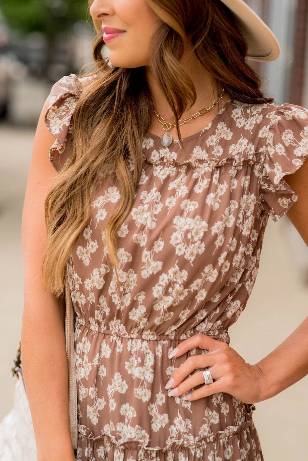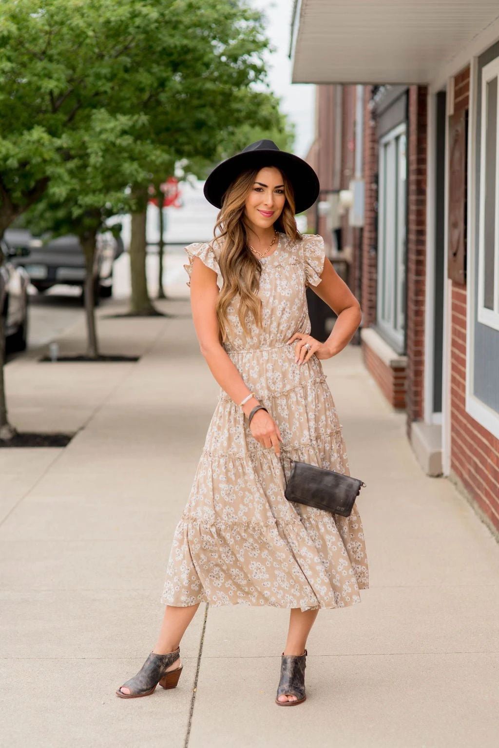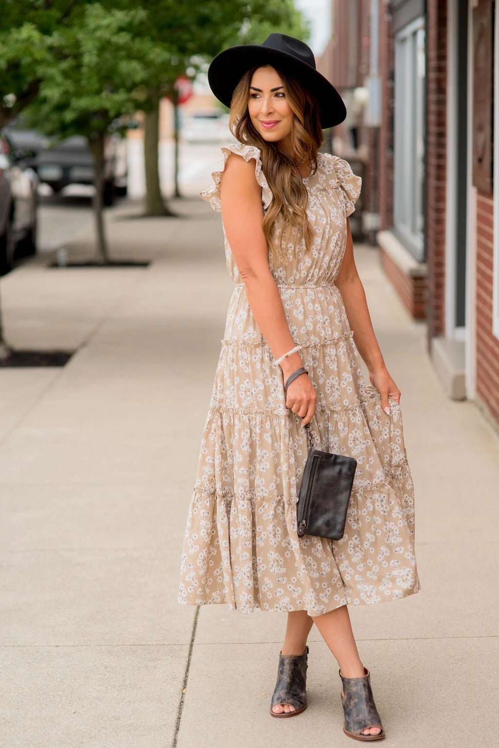 This midi dress is a must-have! From the neutral colored floral print, to the tiered style fit, and the ruffle trim accents, this dress is going to set you apart from the rest! Wear alone with your favorite sandals or wedges in the warmer months or pair with a denim jacket or cardigan and booties for the cooler ones!