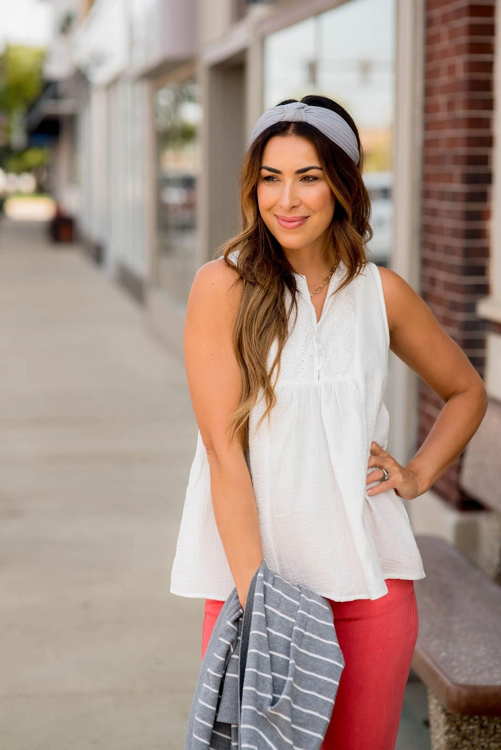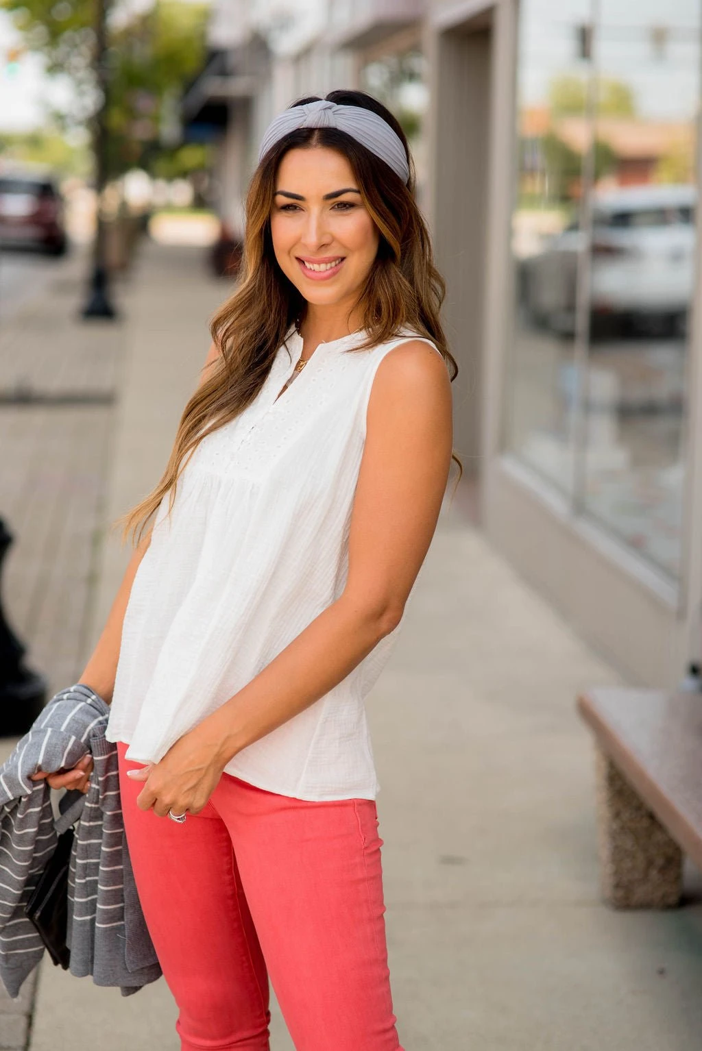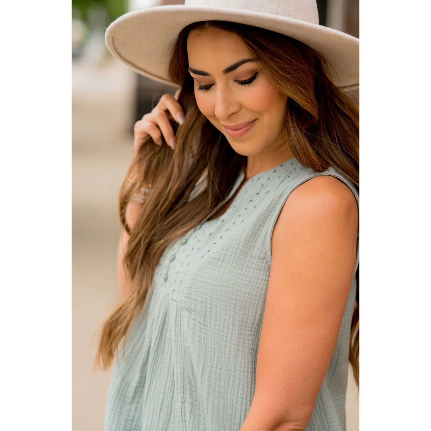 The gauze texture mixed with the hint of eyelet really sets this tank apart from the rest! We’re loving how easy this tank is to style and dress up or down for wherever the day takes you!