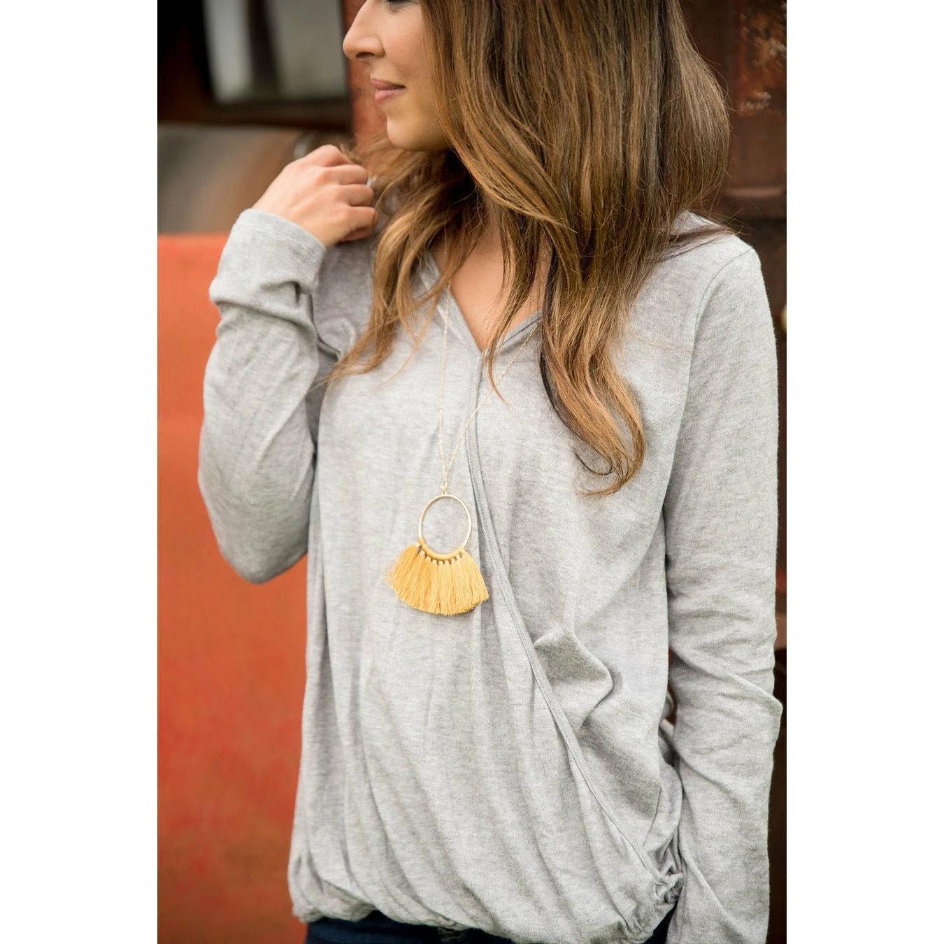 A lightweight sweater that has a cinched bottom. You will love the casual feel of this top!