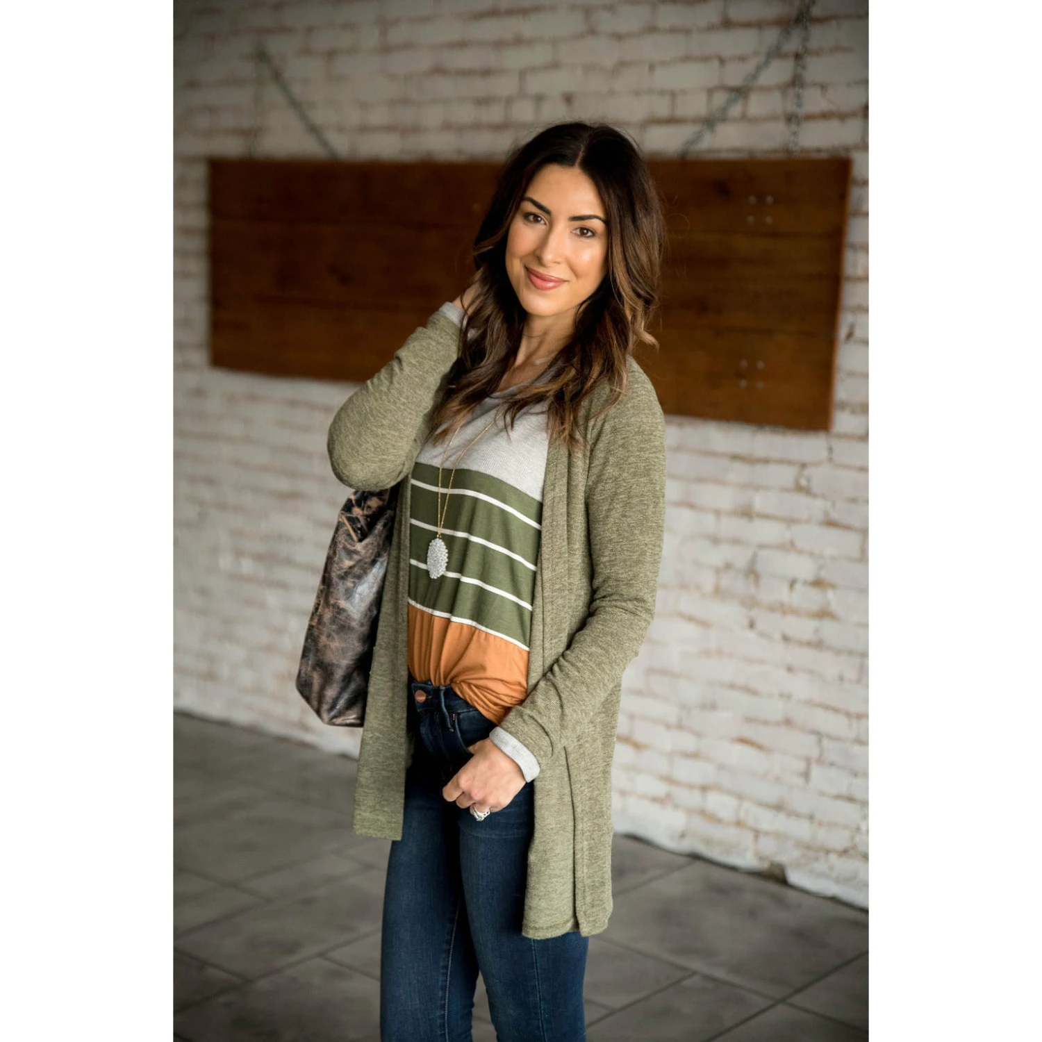 This tee is so comfortable! You can wear it alone with some of our jeans or even put a cardigan over it! The blocked colors give this shirt a cute design!