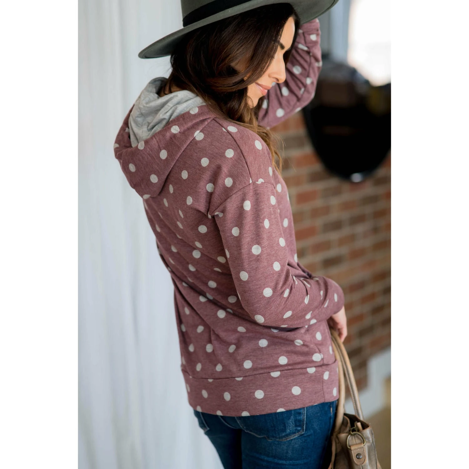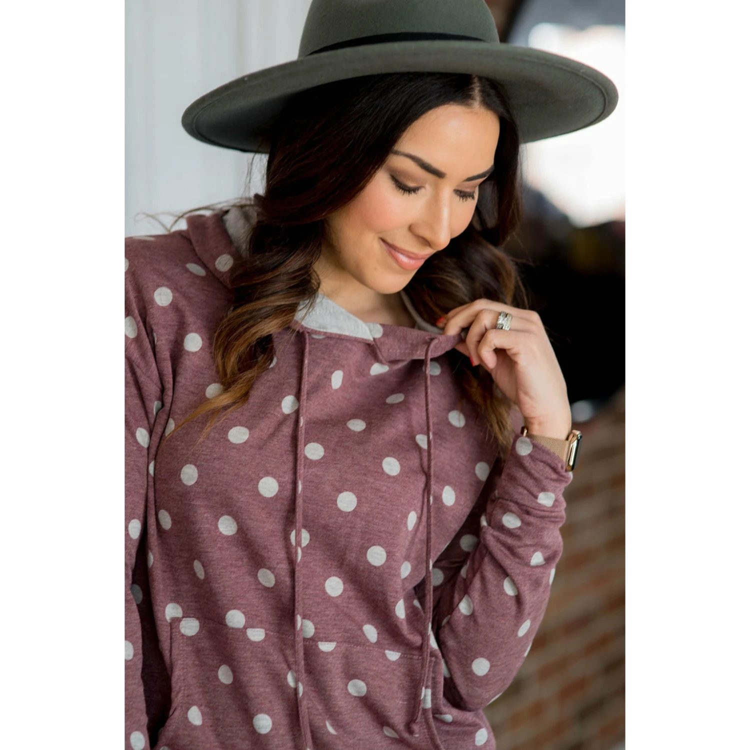 It is impossible to have too many hoodies! So comfy and perfect for those busy on the go days! This particular hoodie is lightweight, making it ideal to transition you between seasons, and features a cute polka dot print, setting it apart from the rest! Just add your favorite jeans or leggings for a quick and comfy look!