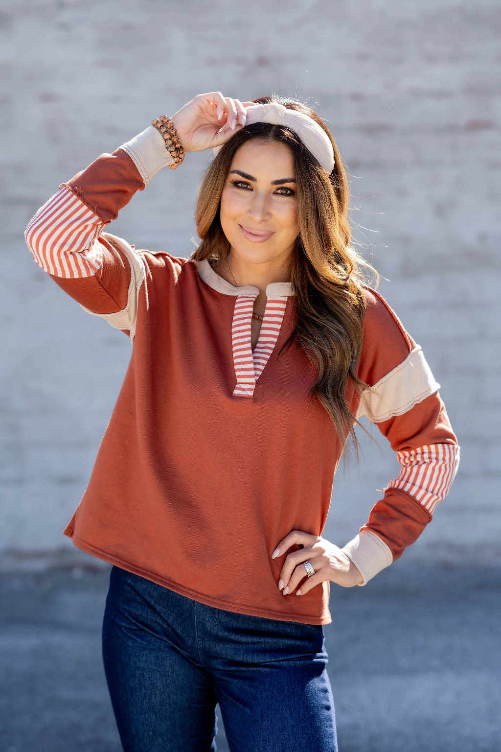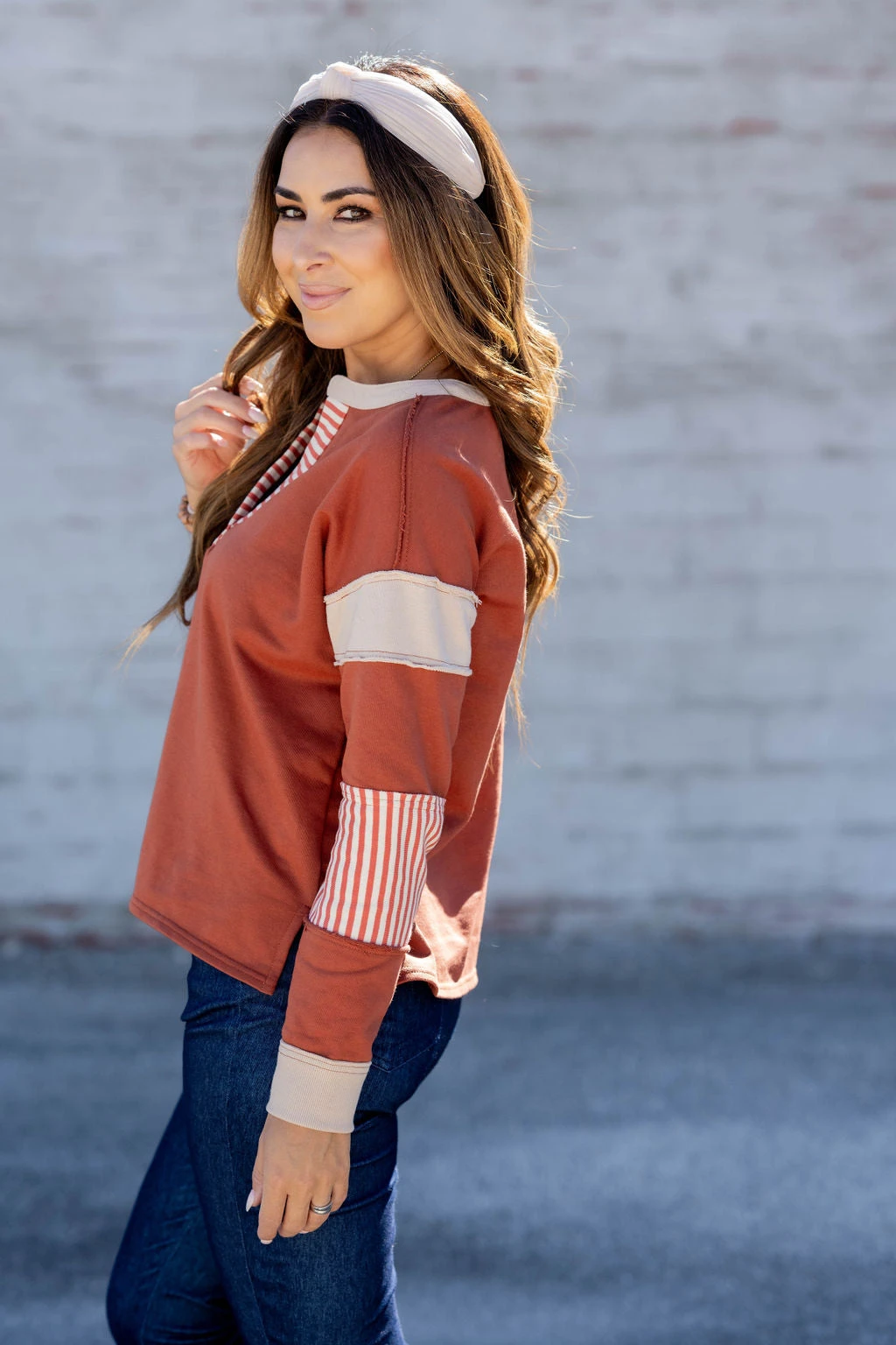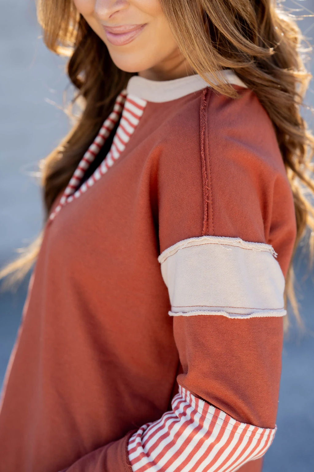 This is such a fun and unique tee! The raw stitched accents with the pop of stripes gives this an edgy look! Pair with shorts in the warmer months or with your favorite denim, joggers, or leggings in the cooler ones! This can be worn more casually or dressed up with your favorite accessories!