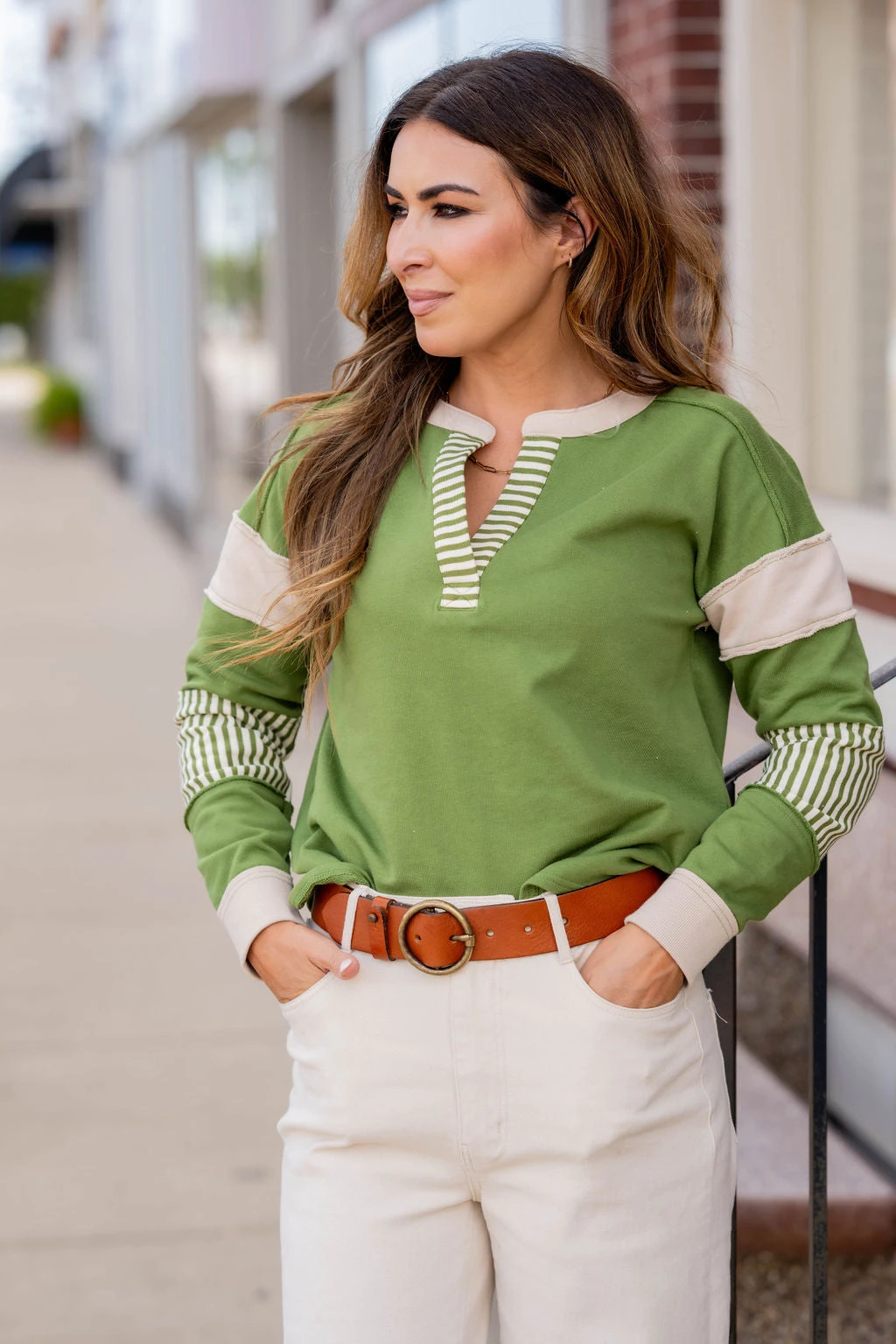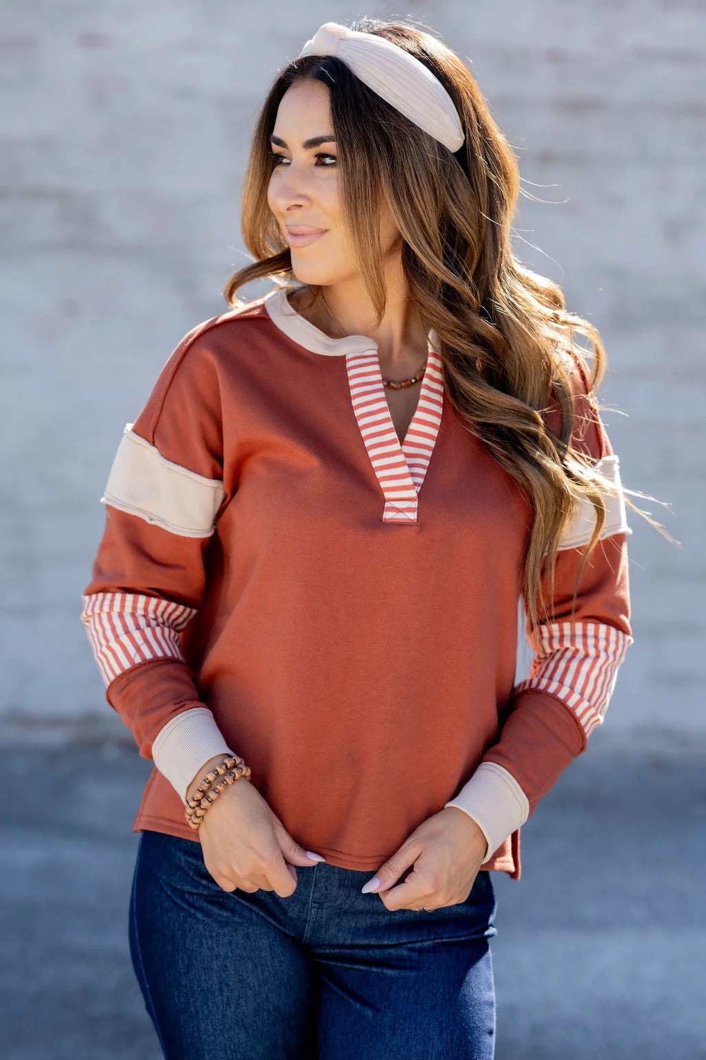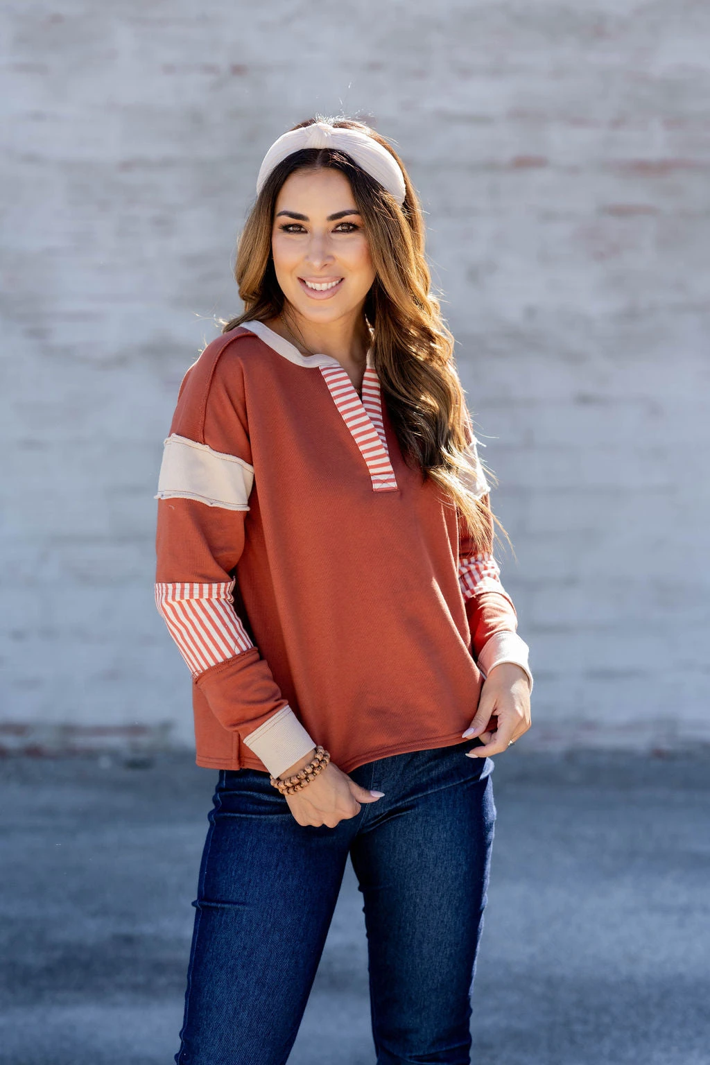 This is such a fun and unique tee! The raw stitched accents with the pop of stripes gives this an edgy look! Pair with shorts in the warmer months or with your favorite denim, joggers, or leggings in the cooler ones! This can be worn more casually or dressed up with your favorite accessories!