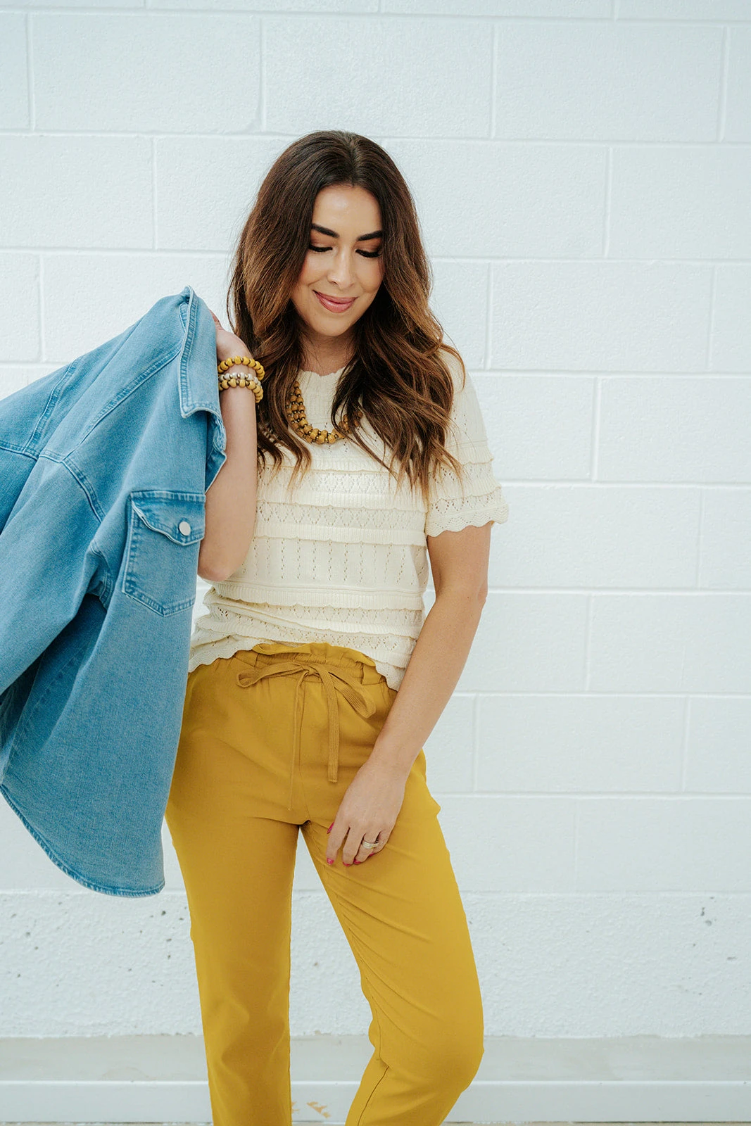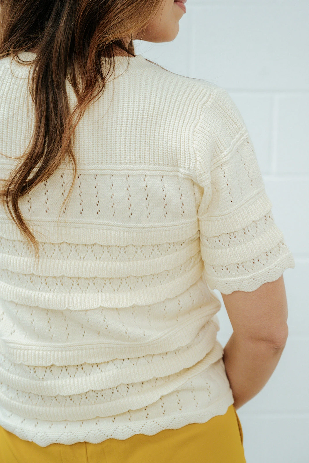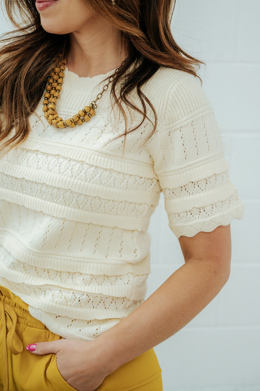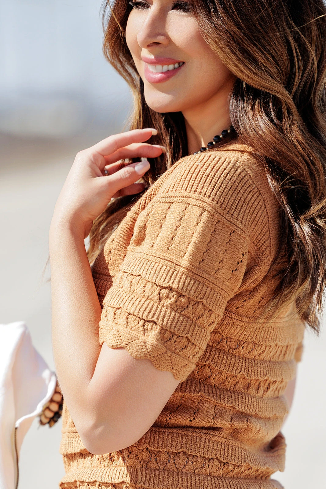 Knit sweaters aren’t just for the cooler months! This tee can easily be paired with shorts or a skirt for the warmer ones too! We love the detailed mixed knit patterns of this tee! Add a cardigan, blazer, or jacket for the cooler months.