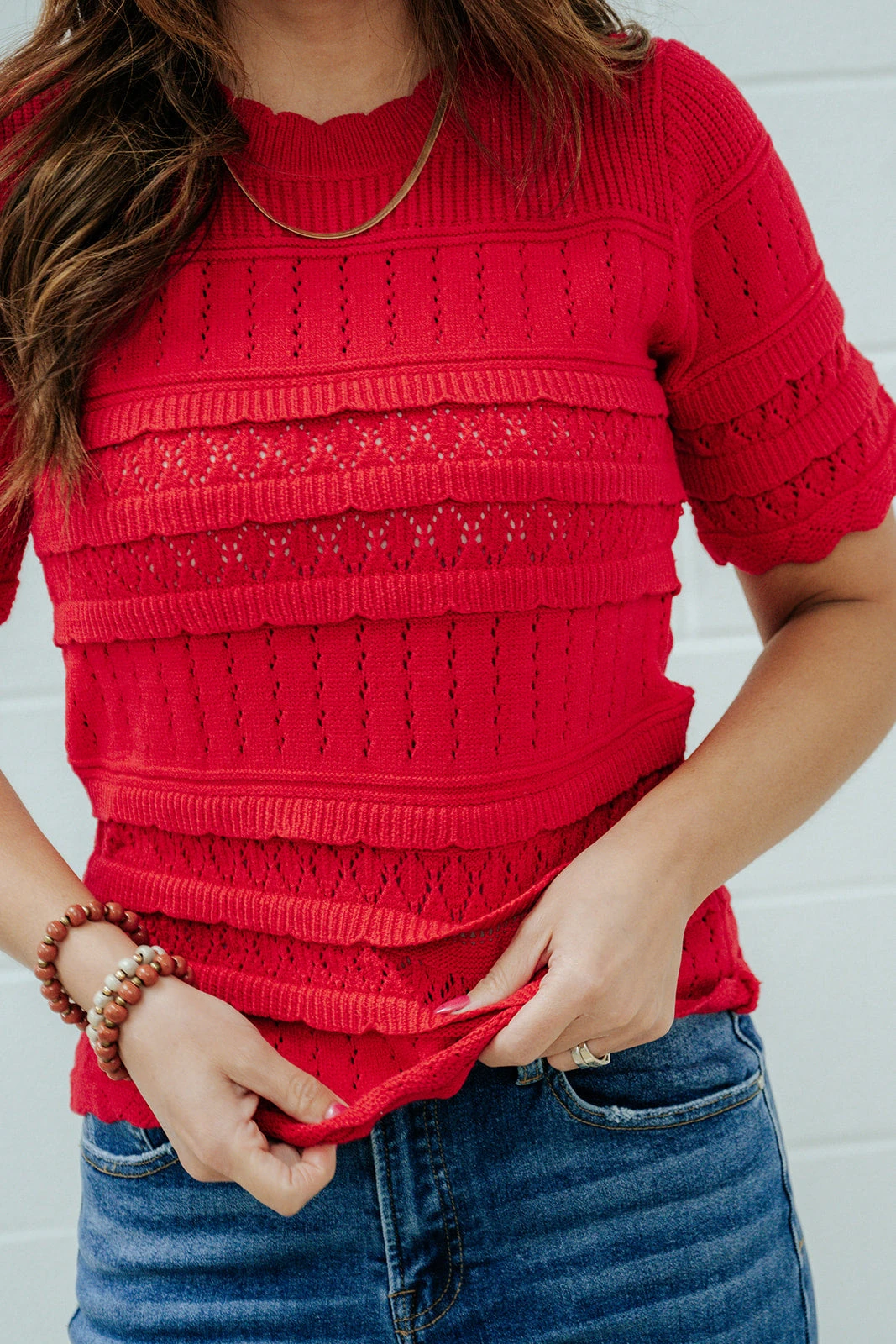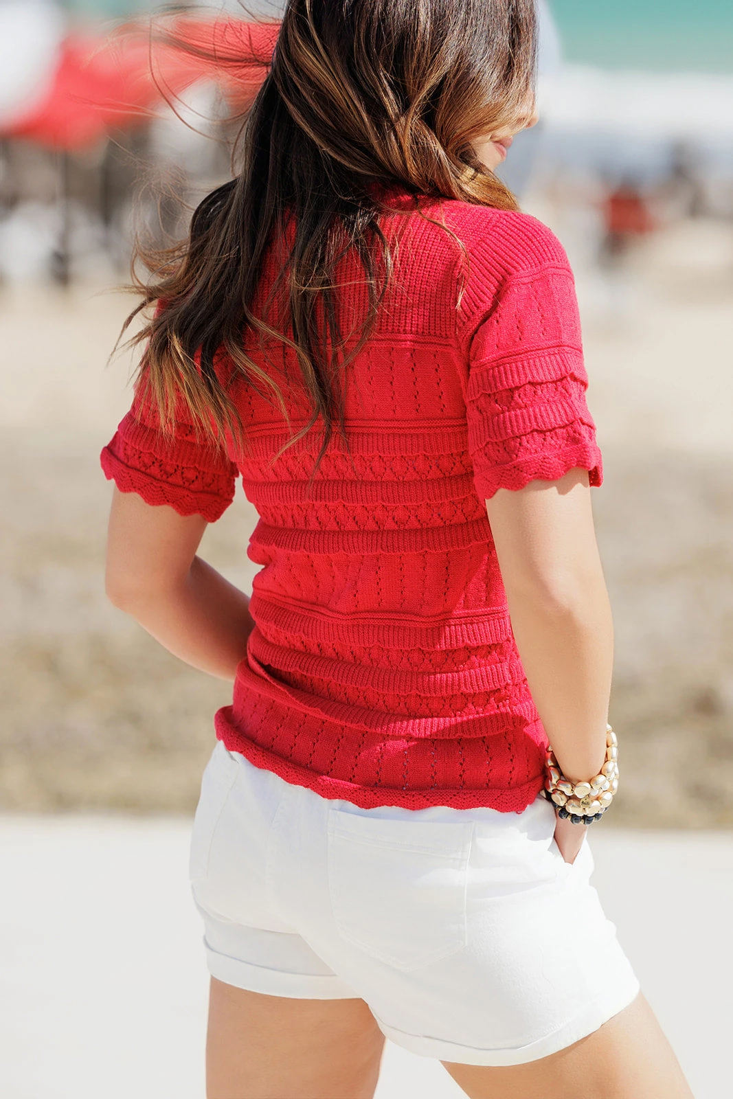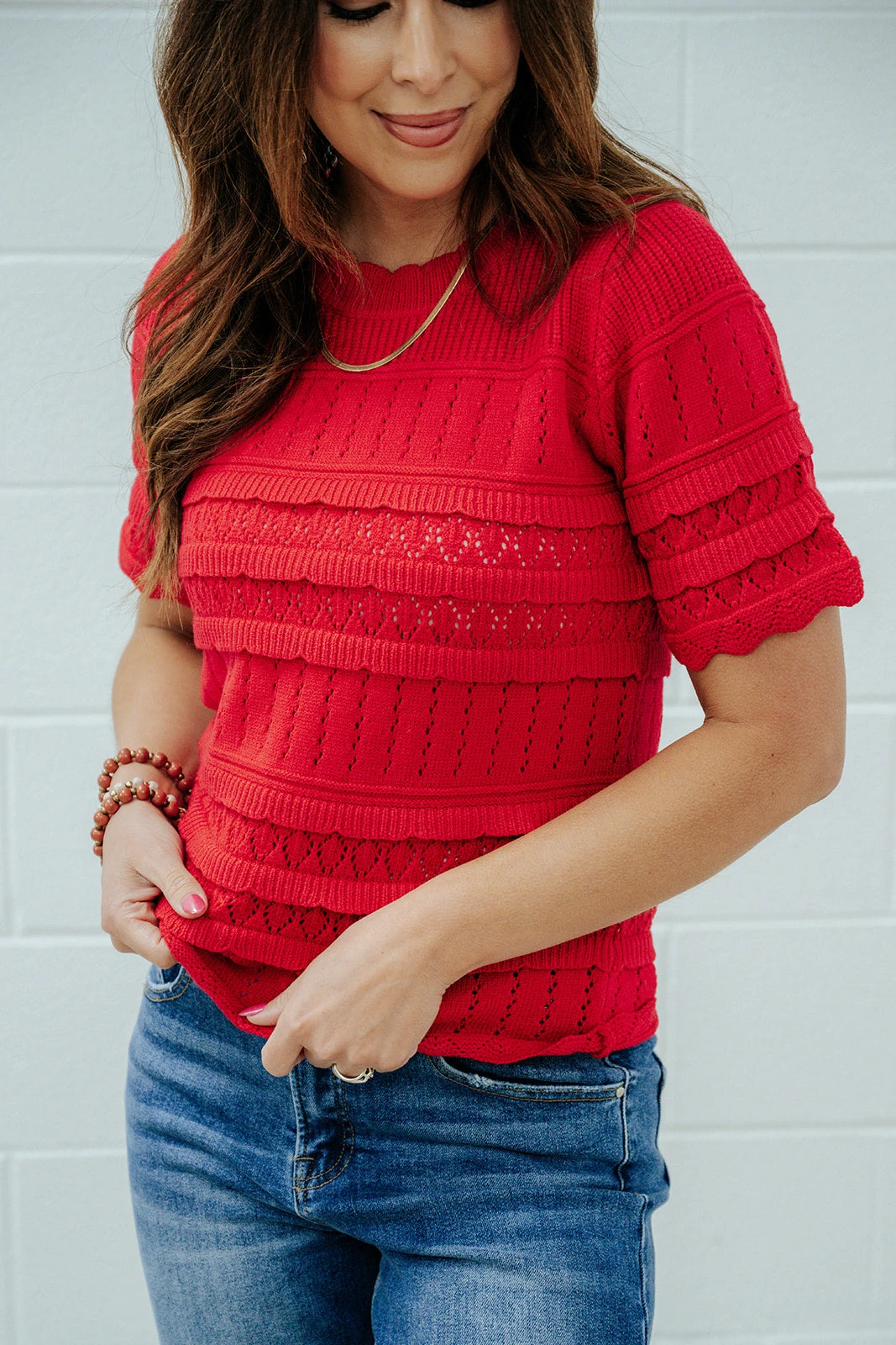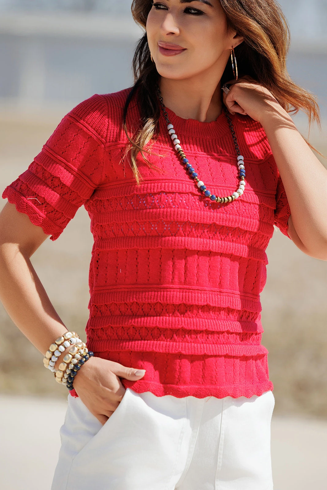 Knit sweaters aren’t just for the cooler months! This tee can easily be paired with shorts or a skirt for the warmer ones too! We love the detailed mixed knit patterns of this tee! Add a cardigan, blazer, or jacket for the cooler months.