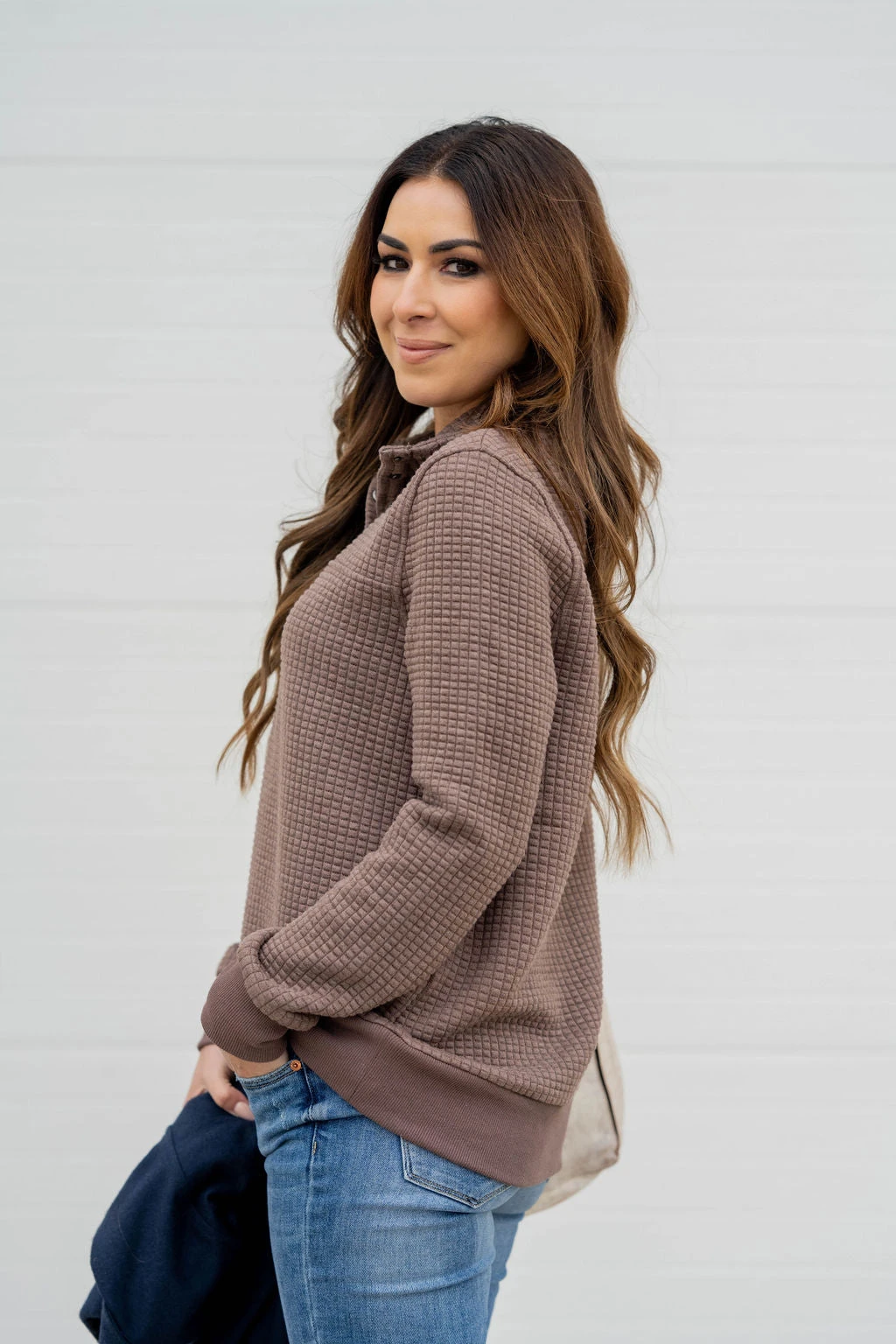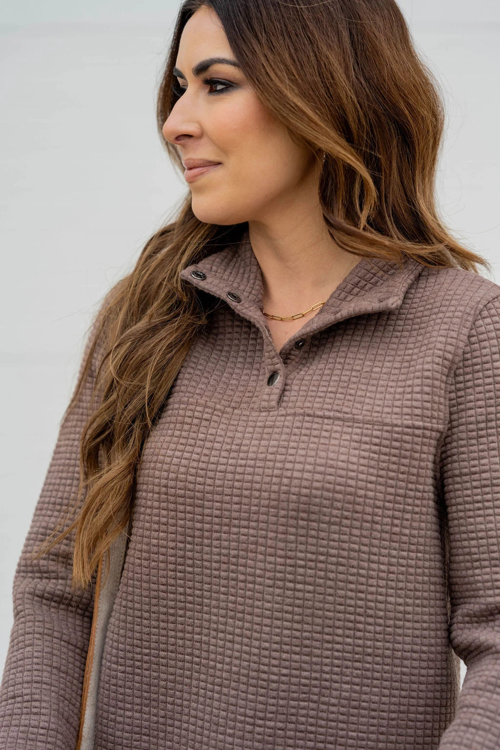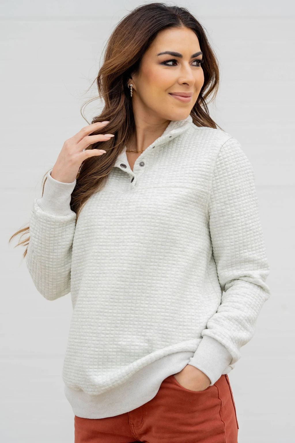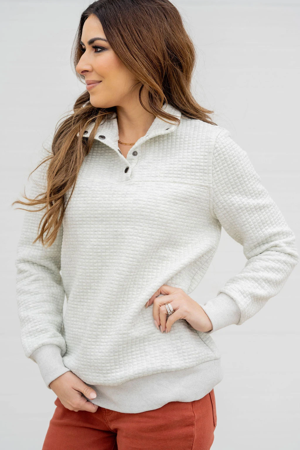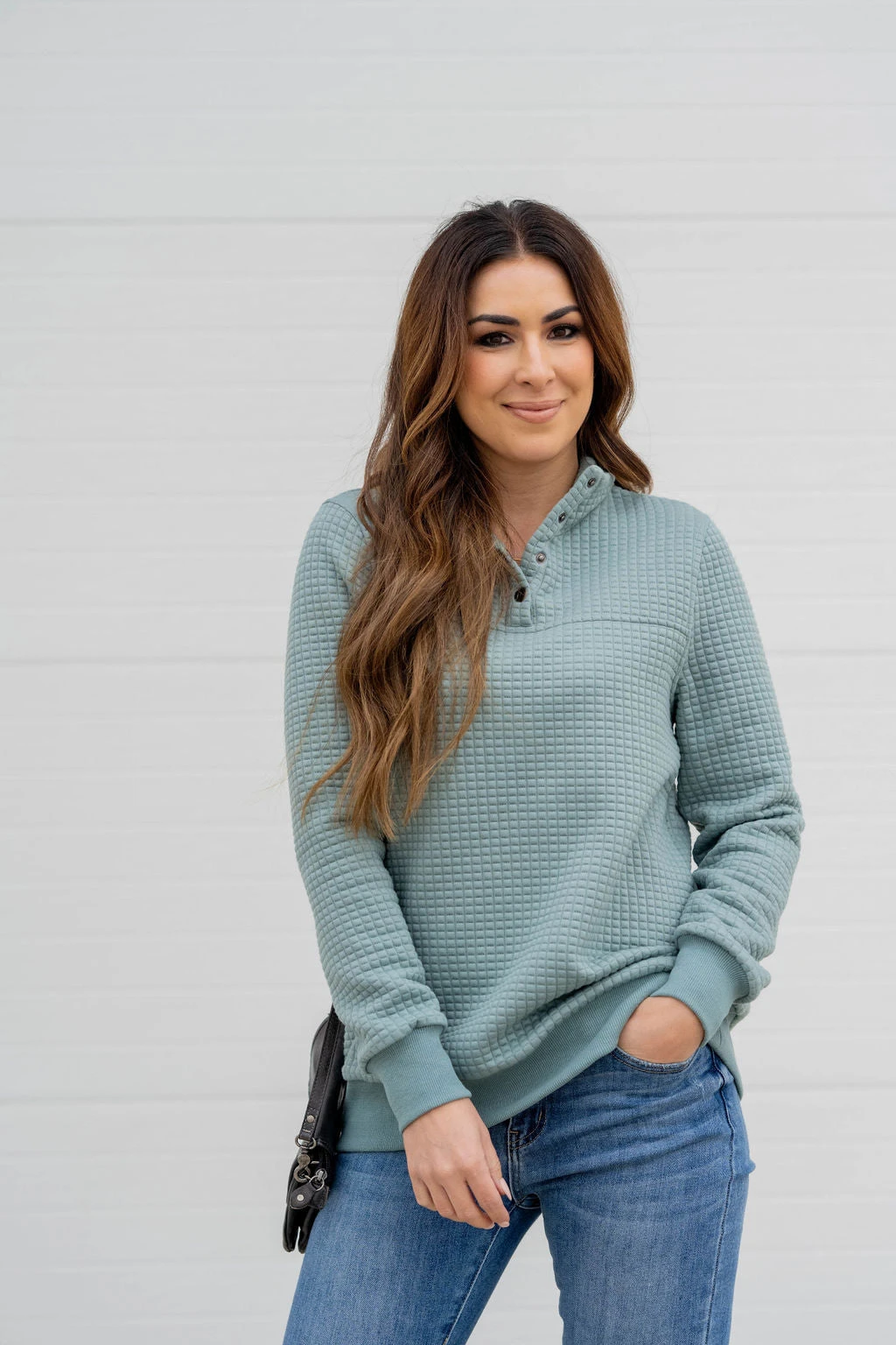 Your new go-to pullover has arrived! Soft and lightweight, this can be worn with shorts in the warmer months or leggings, denim, or joggers in the cooler ones! We love that this can take you from the gym to busy days on-the-go! The quilted texture and button accents really make this one-of-a-kind!Â