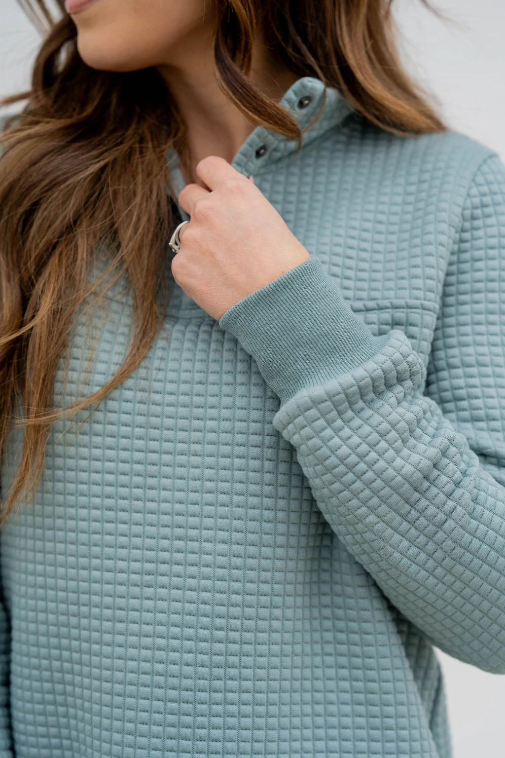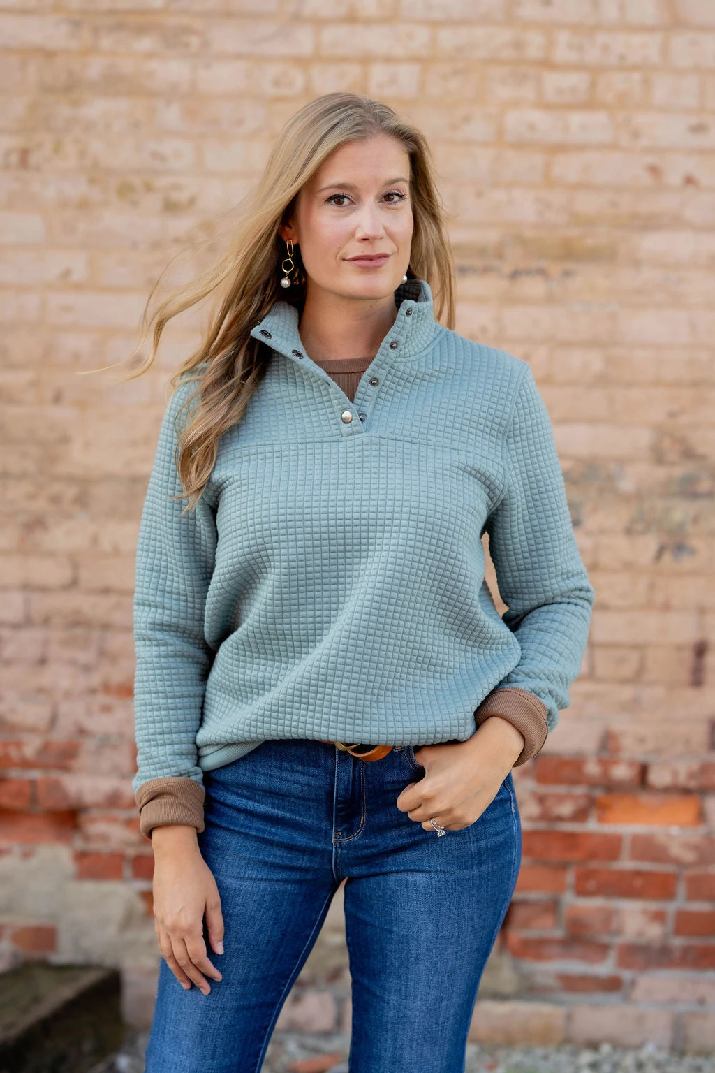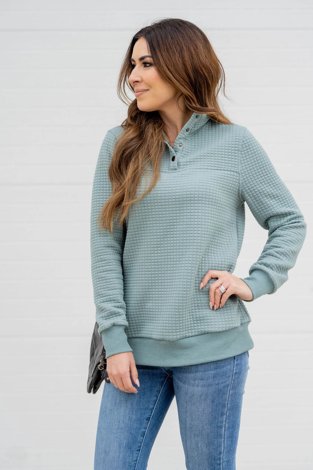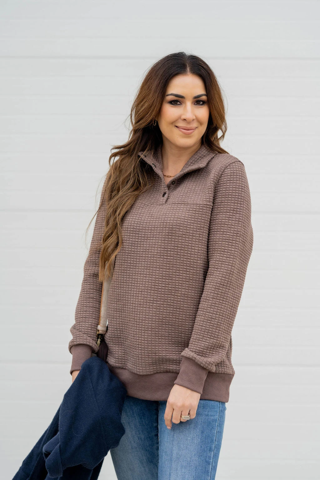 Your new go-to pullover has arrived! Soft and lightweight, this can be worn with shorts in the warmer months or leggings, denim, or joggers in the cooler ones! We love that this can take you from the gym to busy days on-the-go! The quilted texture and button accents really make this one-of-a-kind!Â