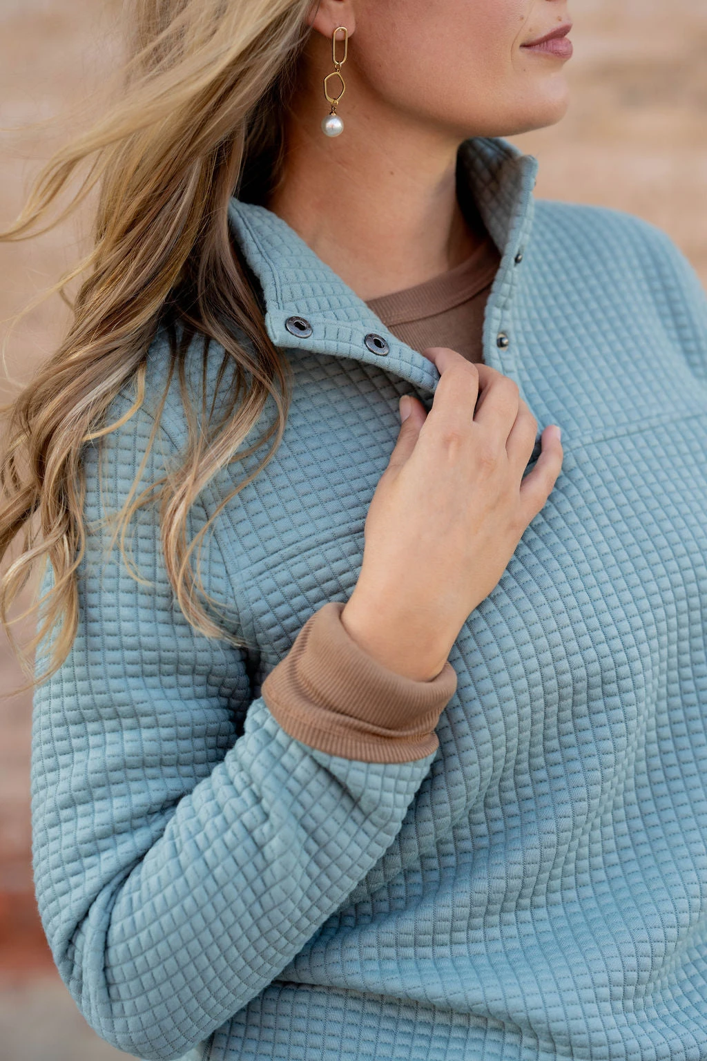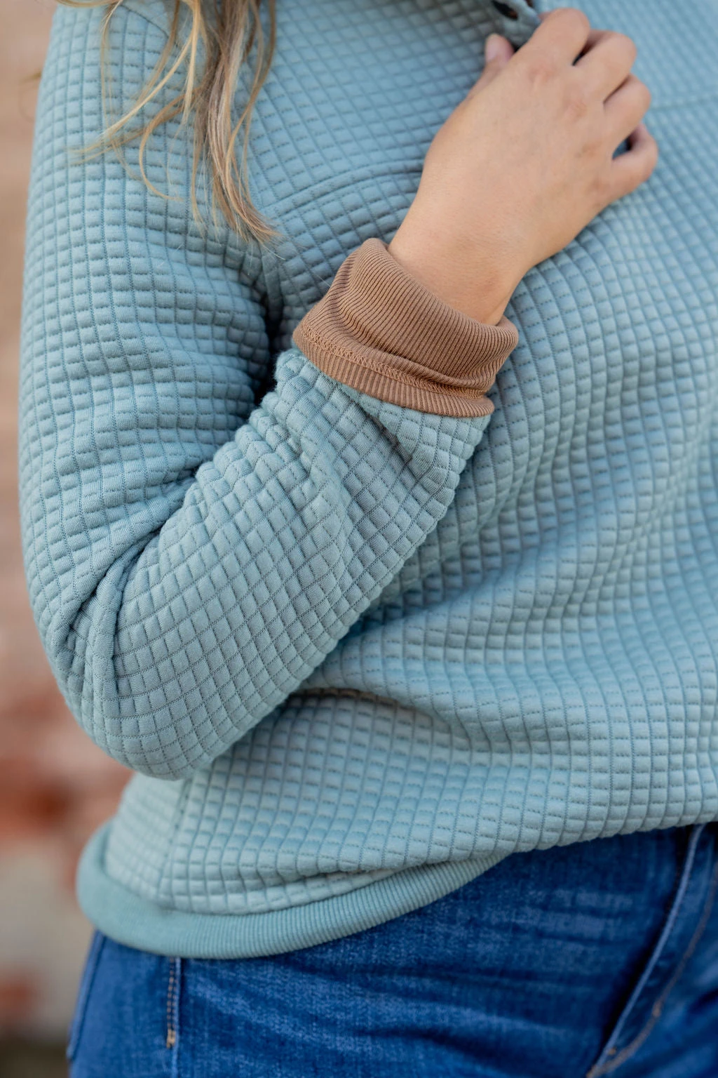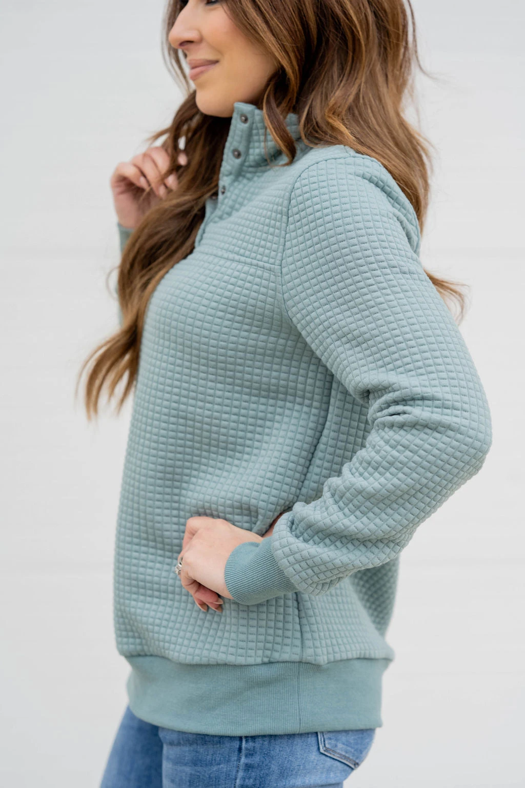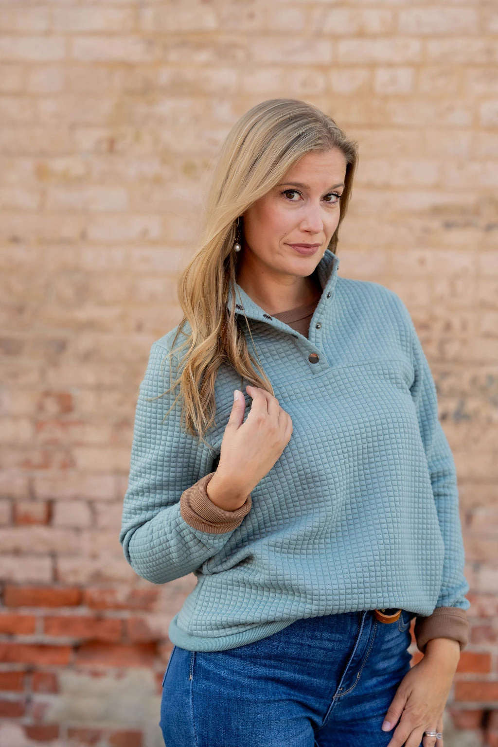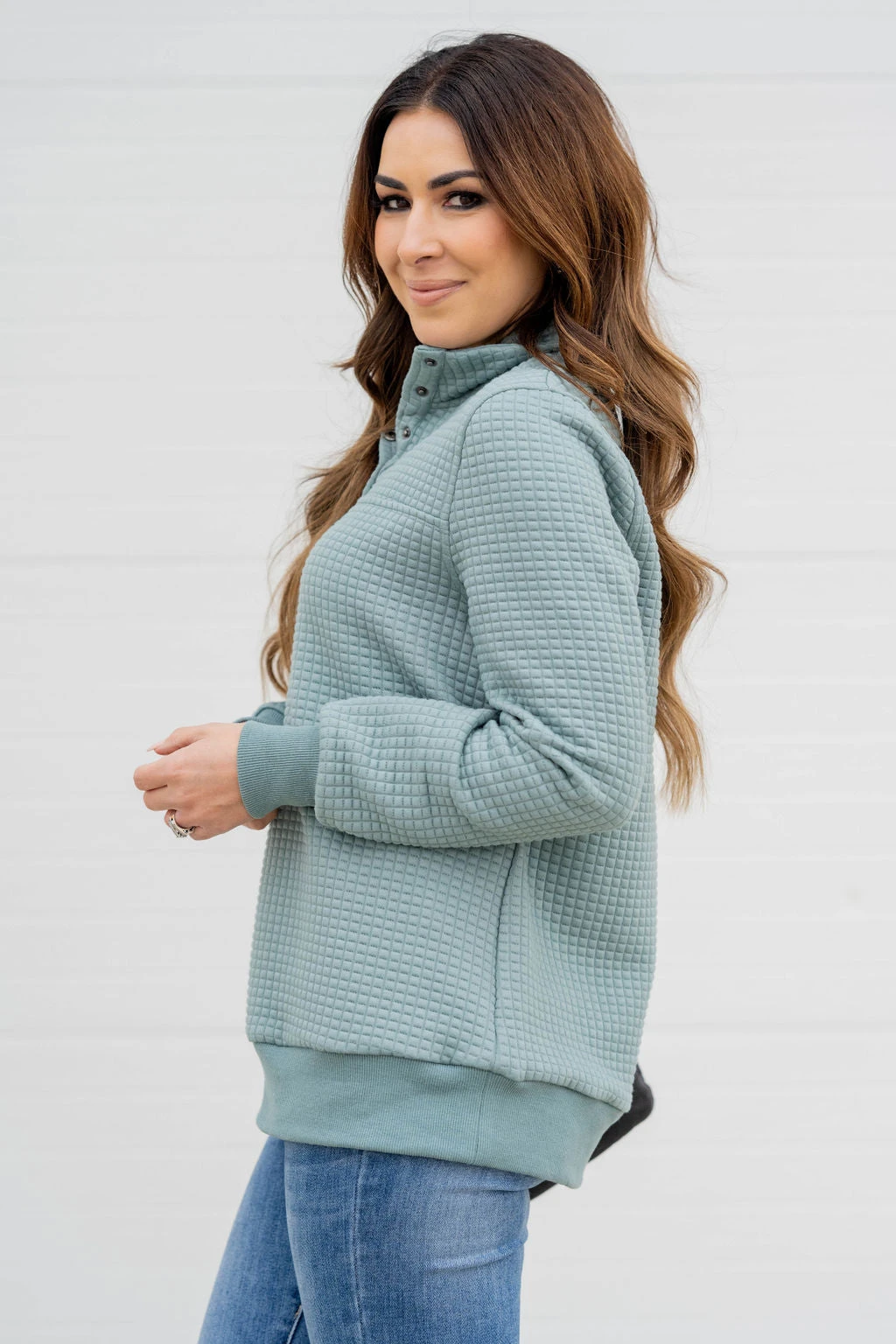 Your new go-to pullover has arrived! Soft and lightweight, this can be worn with shorts in the warmer months or leggings, denim, or joggers in the cooler ones! We love that this can take you from the gym to busy days on-the-go! The quilted texture and button accents really make this one-of-a-kind!Â