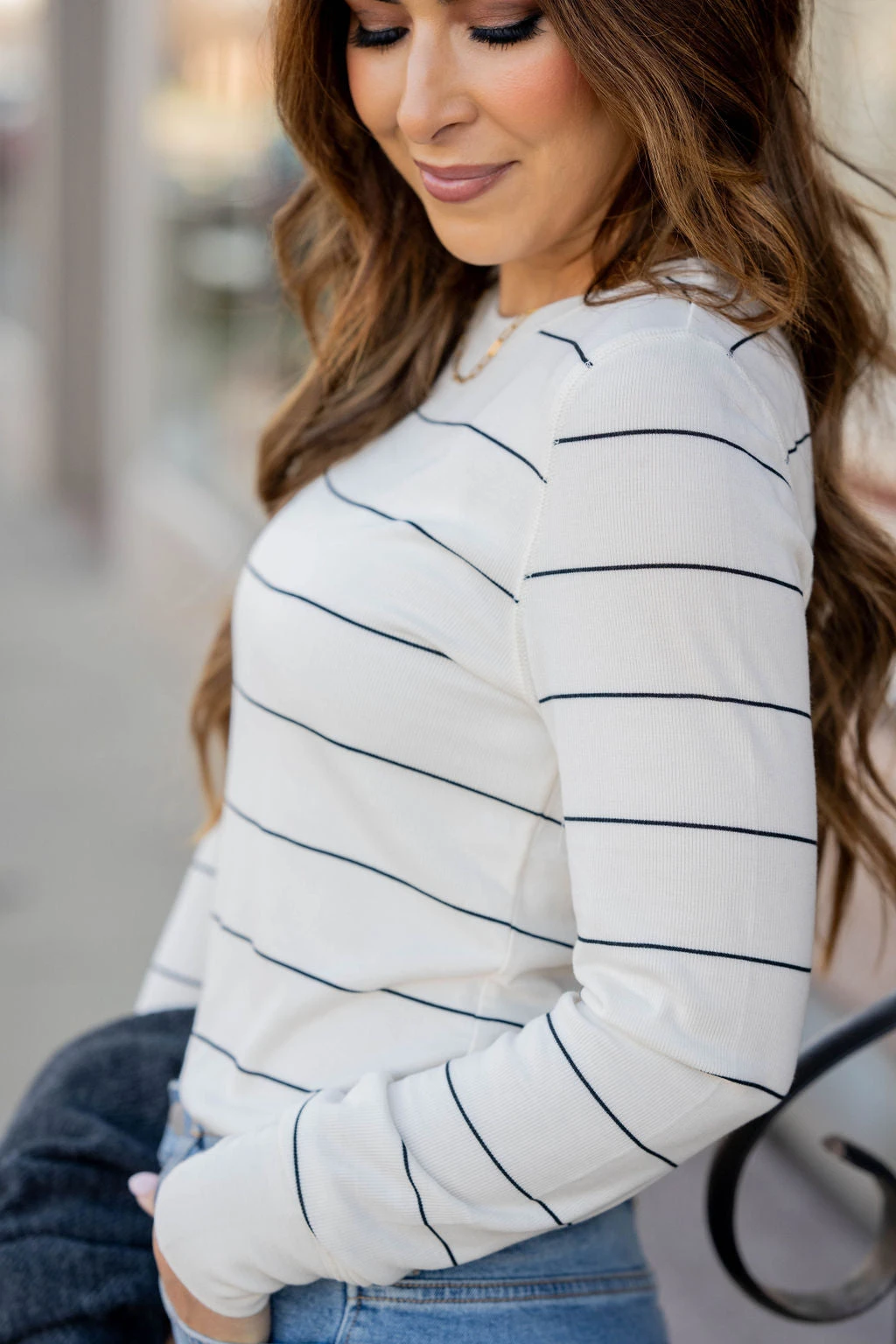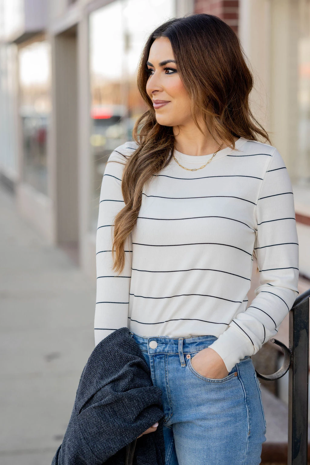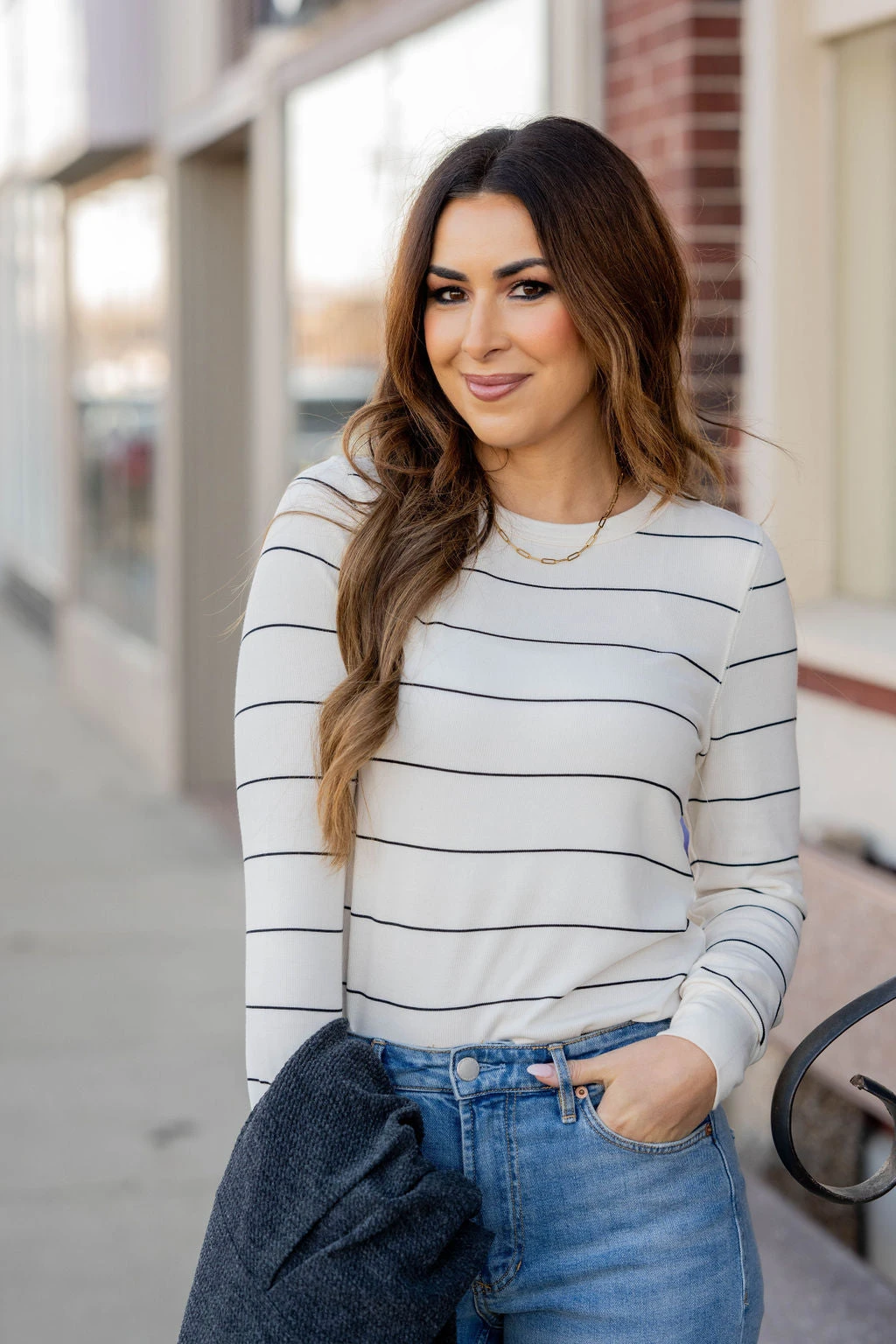 A super soft and lightweight long-sleeve tee that can be dressed up or down with ease! The subtle ribbed texture makes it perfect to stand out on its own but it can also be used as a layering piece for all of your vests, cardigans, or shackets!