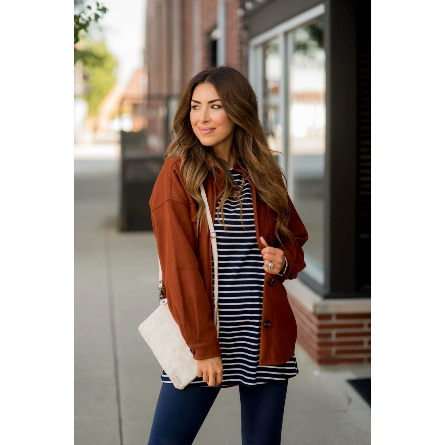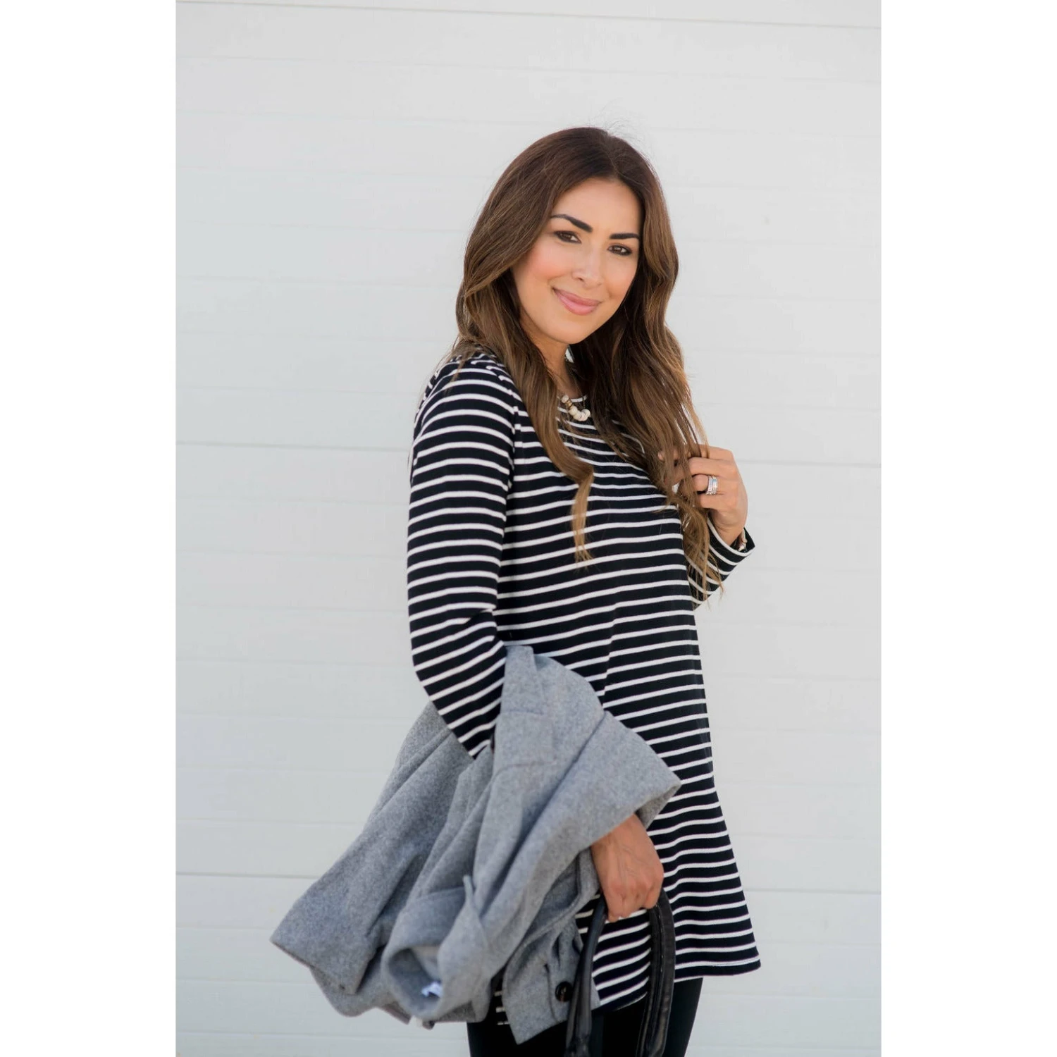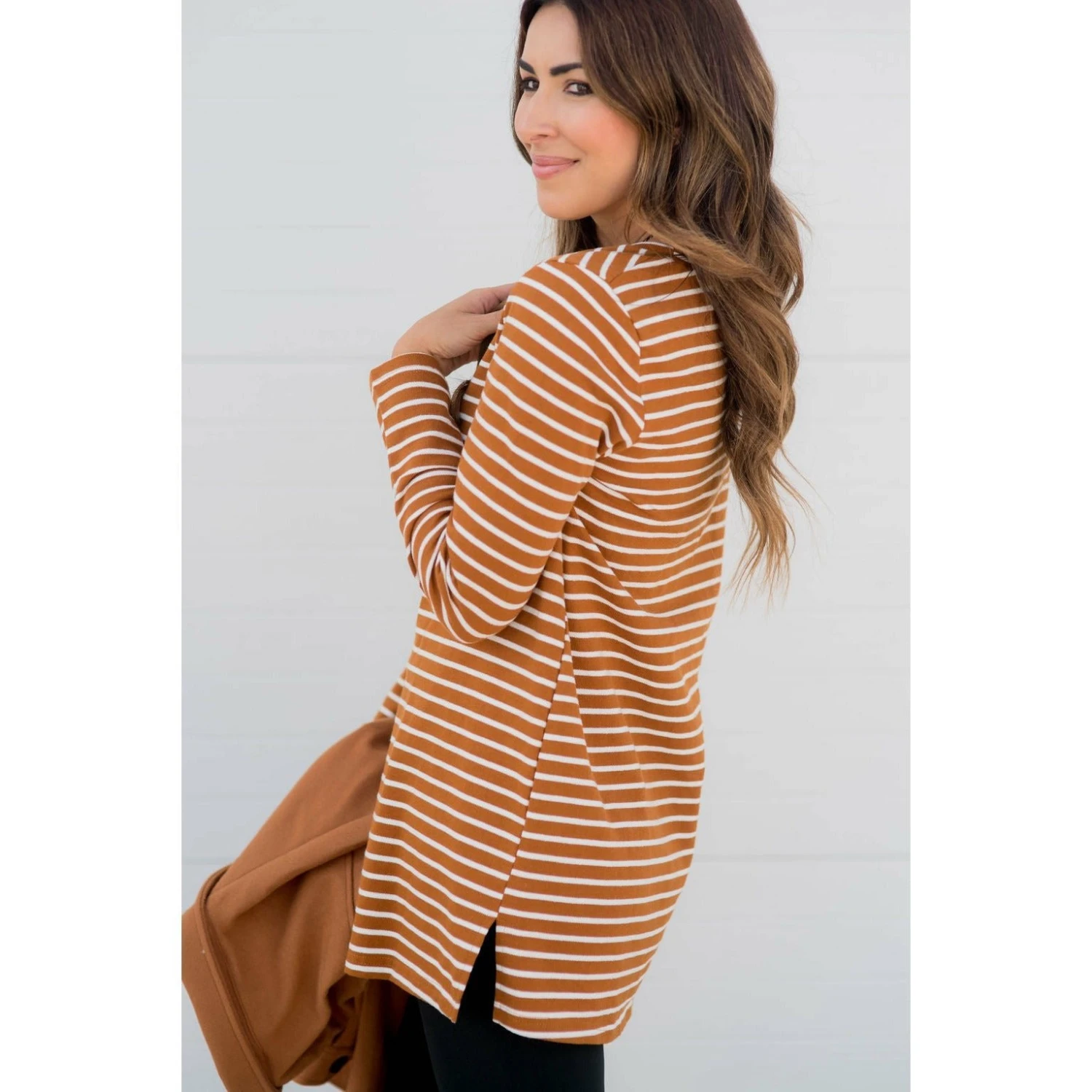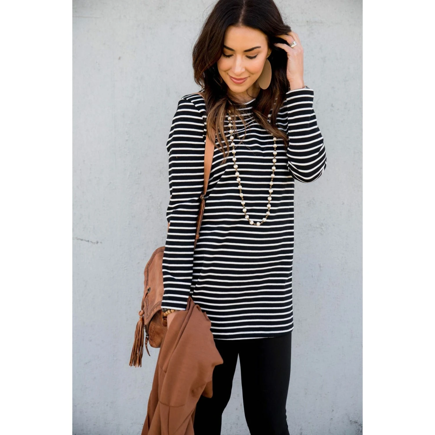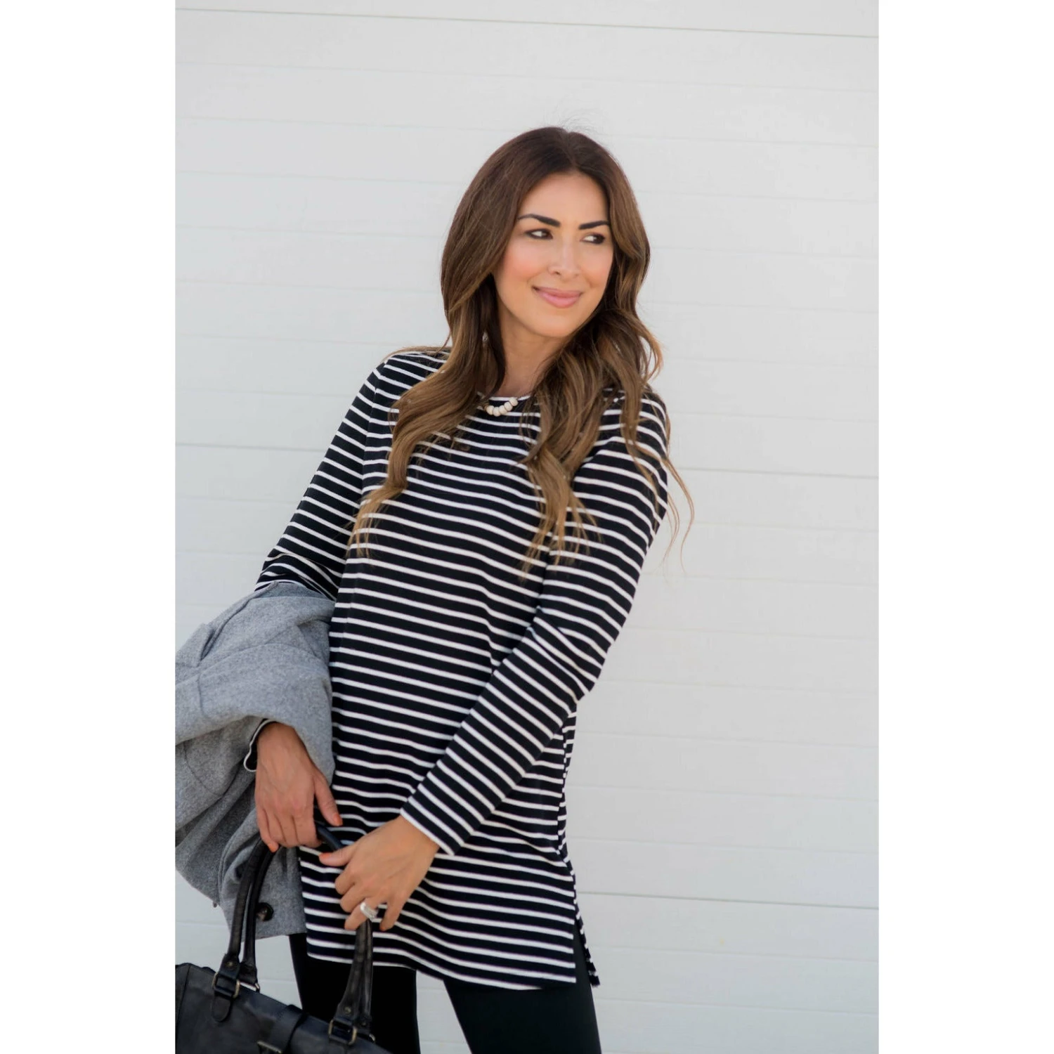 Everyone loves a good striped shirt, and this one is perfect! Soft material and long sleeves, this striped tunic sweatshirt pairs well with jeans or leggings. A bit cold? Don’t forget a cardigan to go over it!