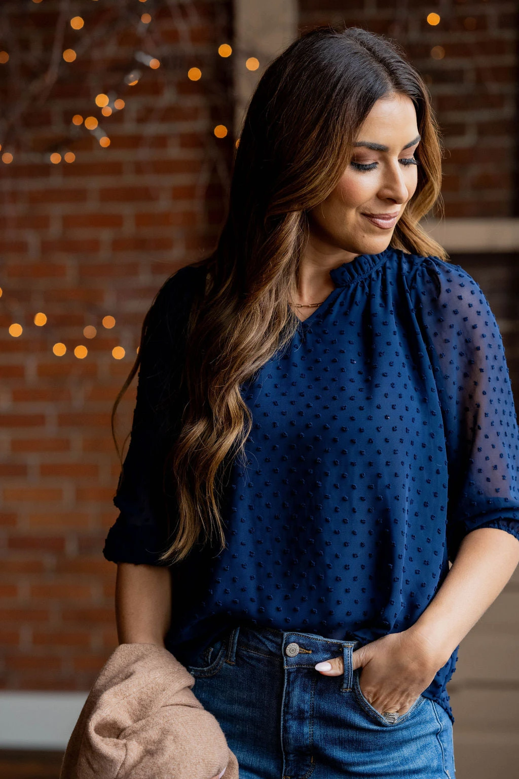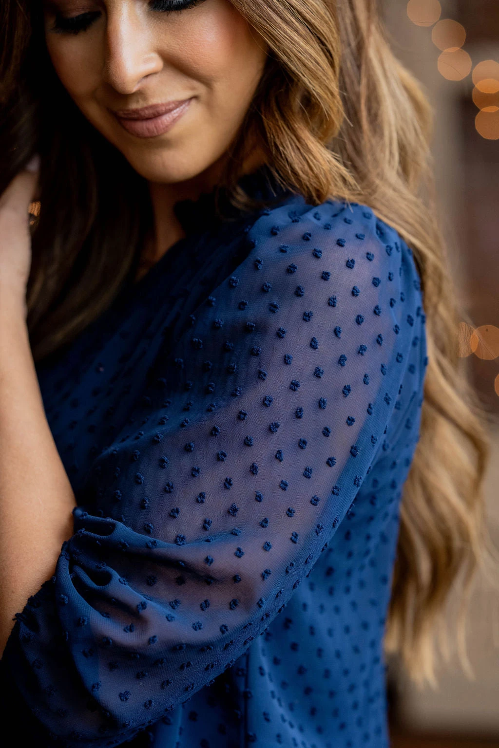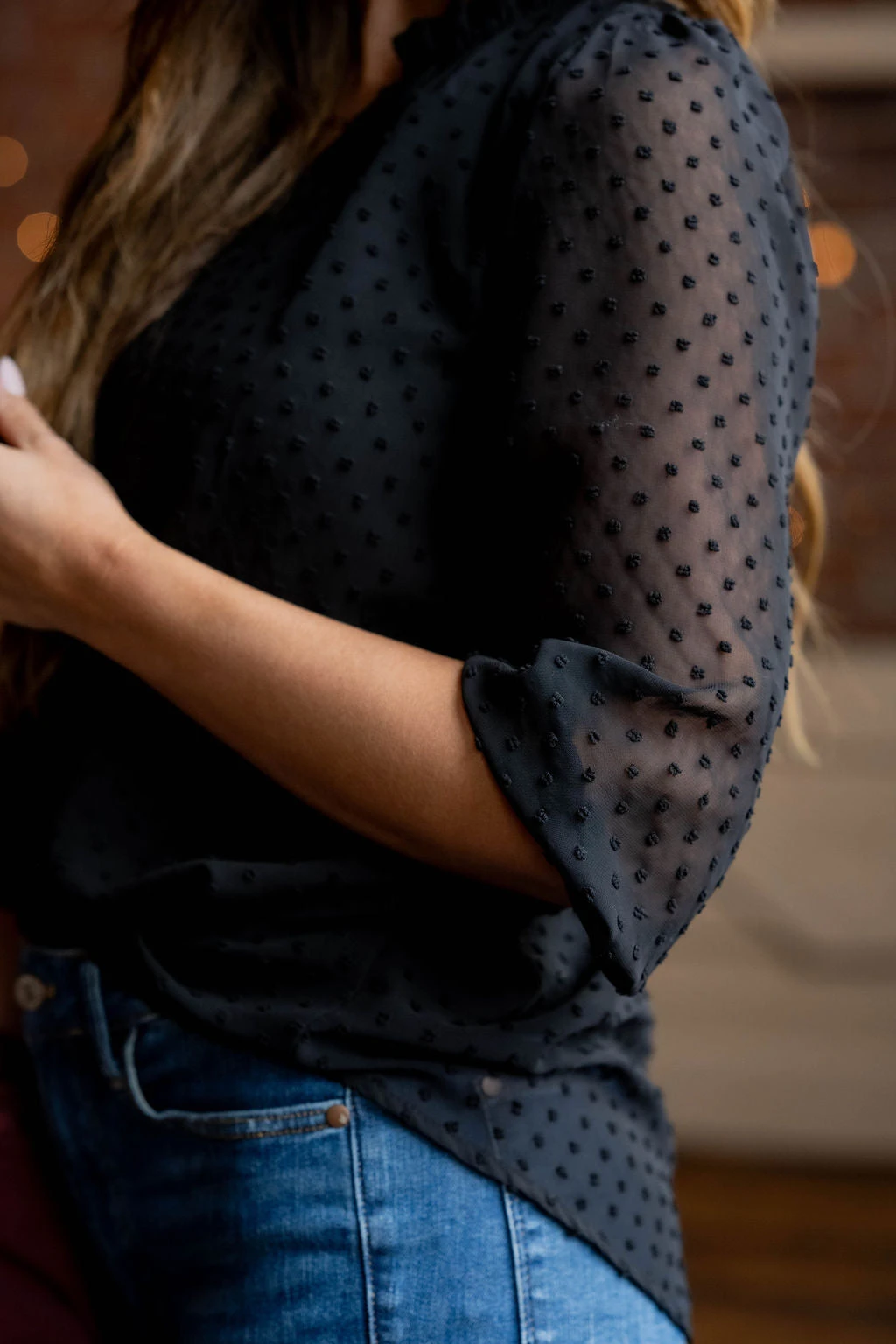 The perfect blouse for any occasion! Wear it by itself or layer it up for the cooler months! The subtle mini dot detailing and sheer sleeves really set it apart from the rest!