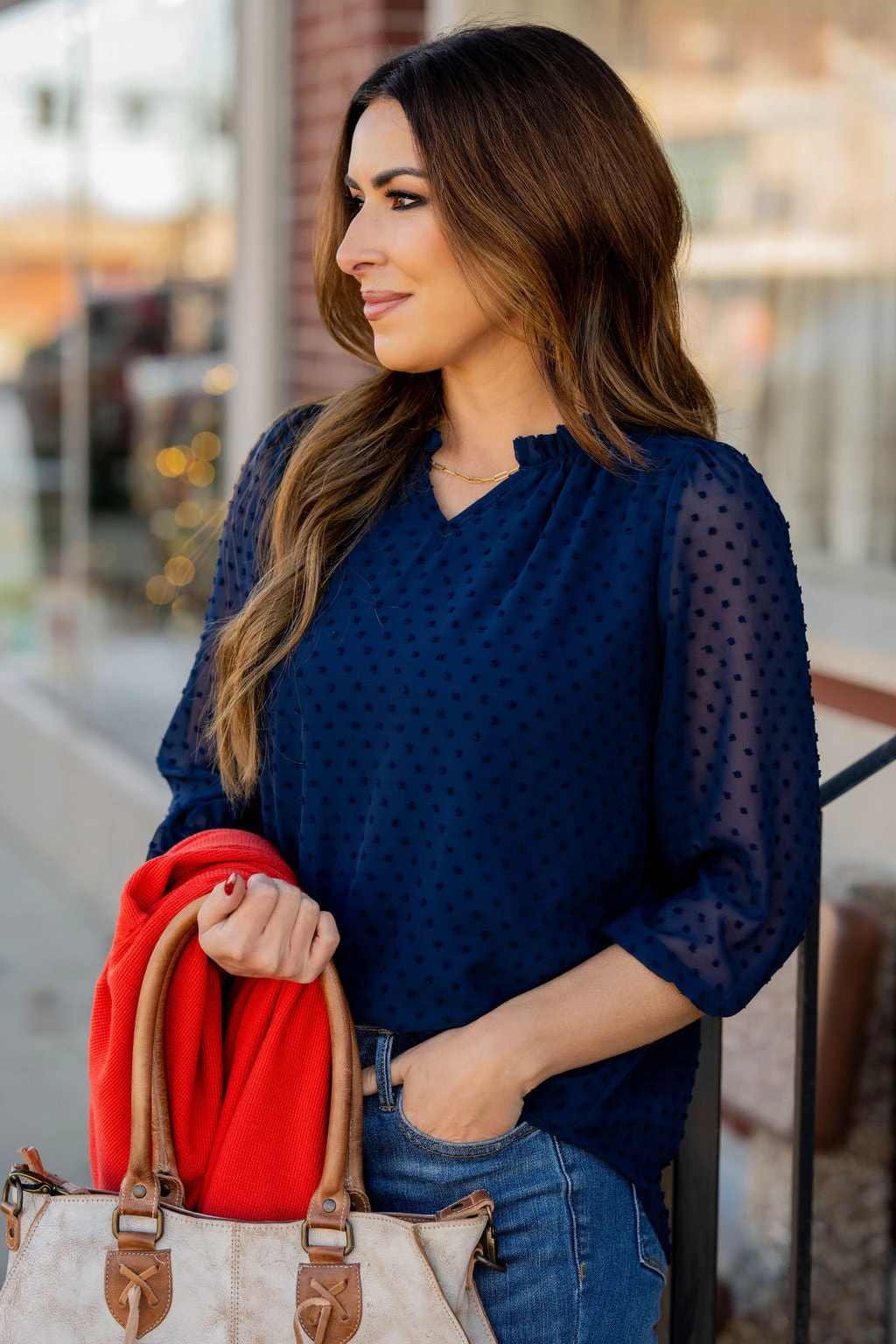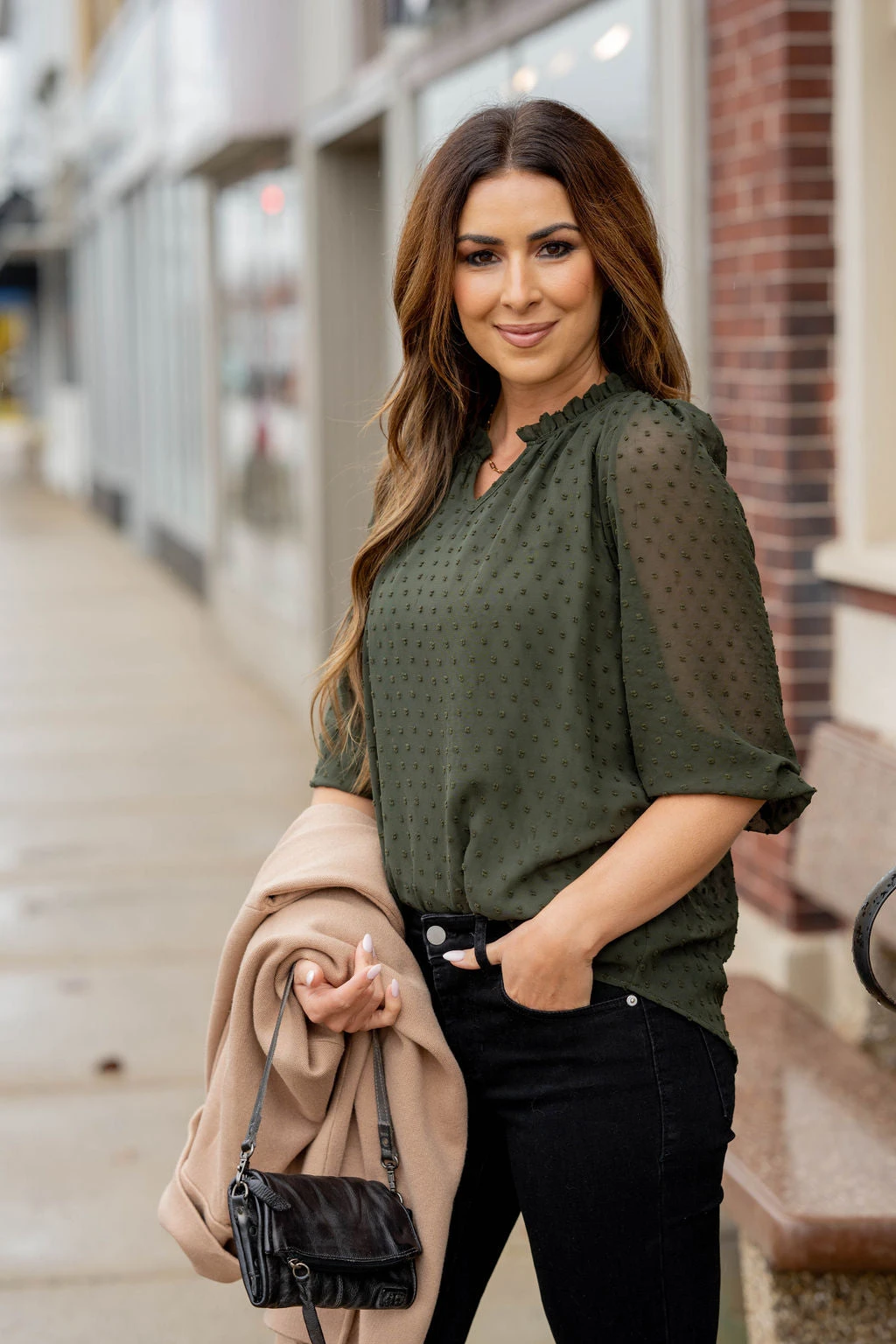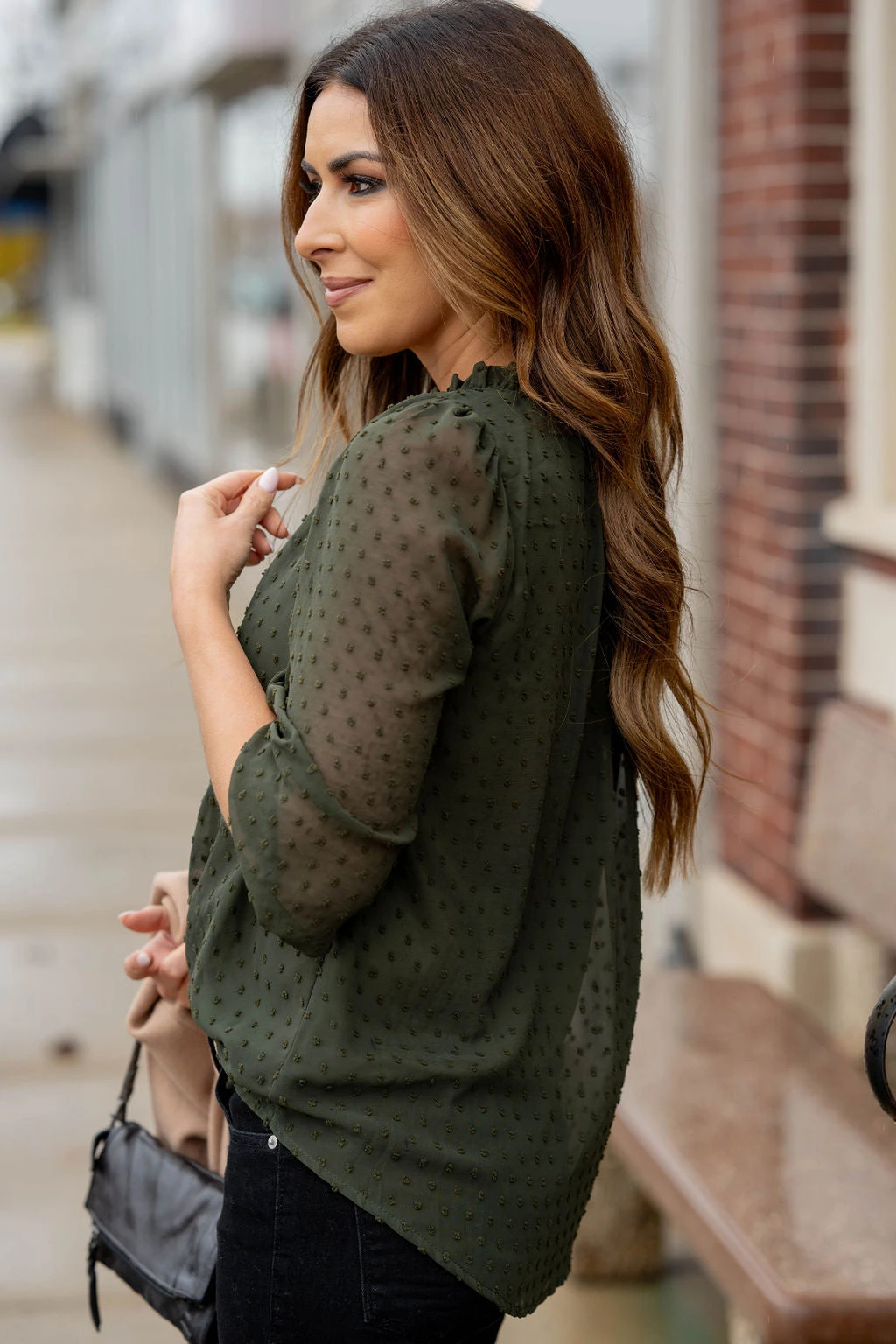 The perfect blouse for any occasion! Wear it by itself or layer it up for the cooler months! The subtle mini dot detailing and sheer sleeves really set it apart from the rest!