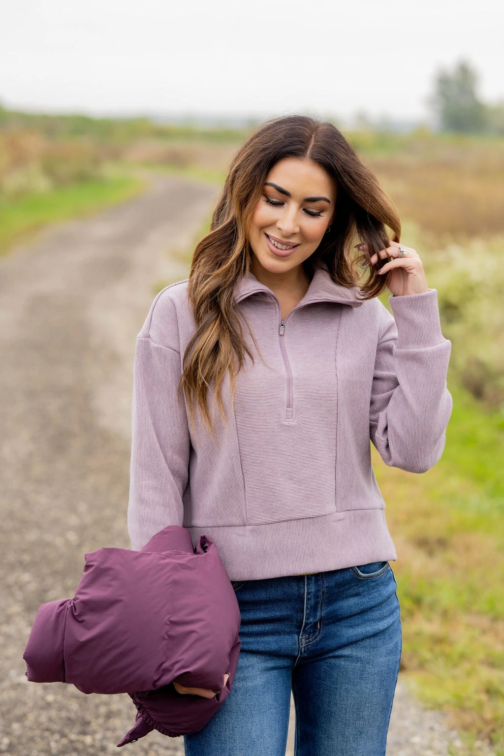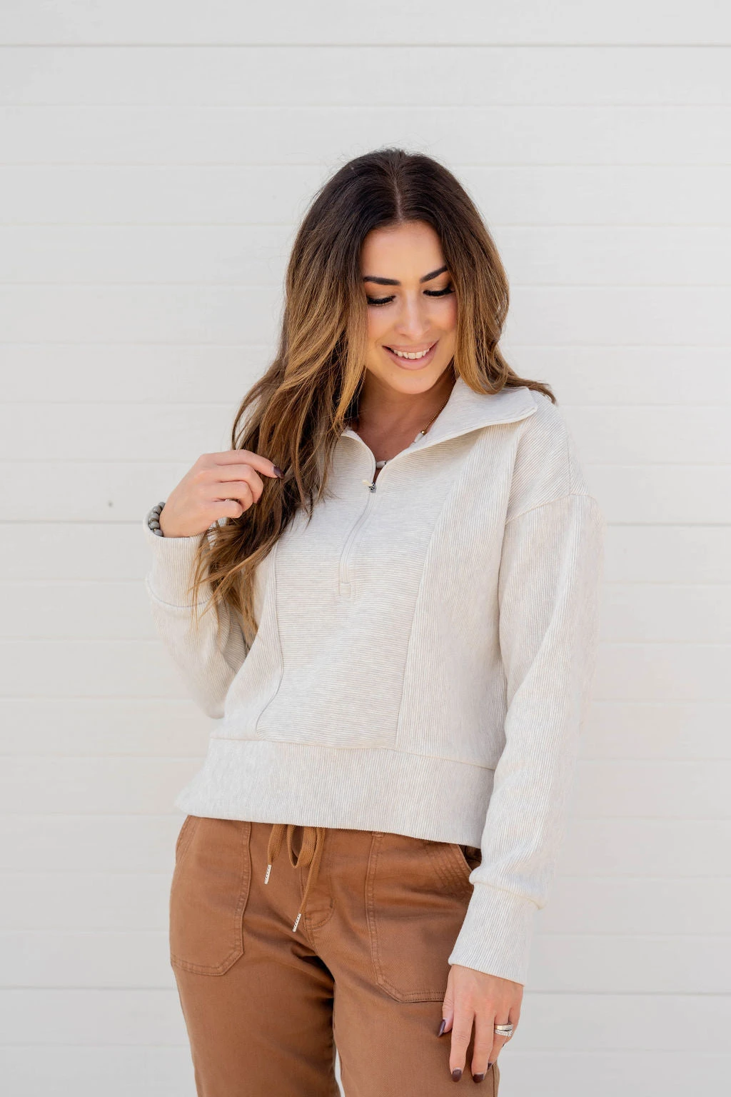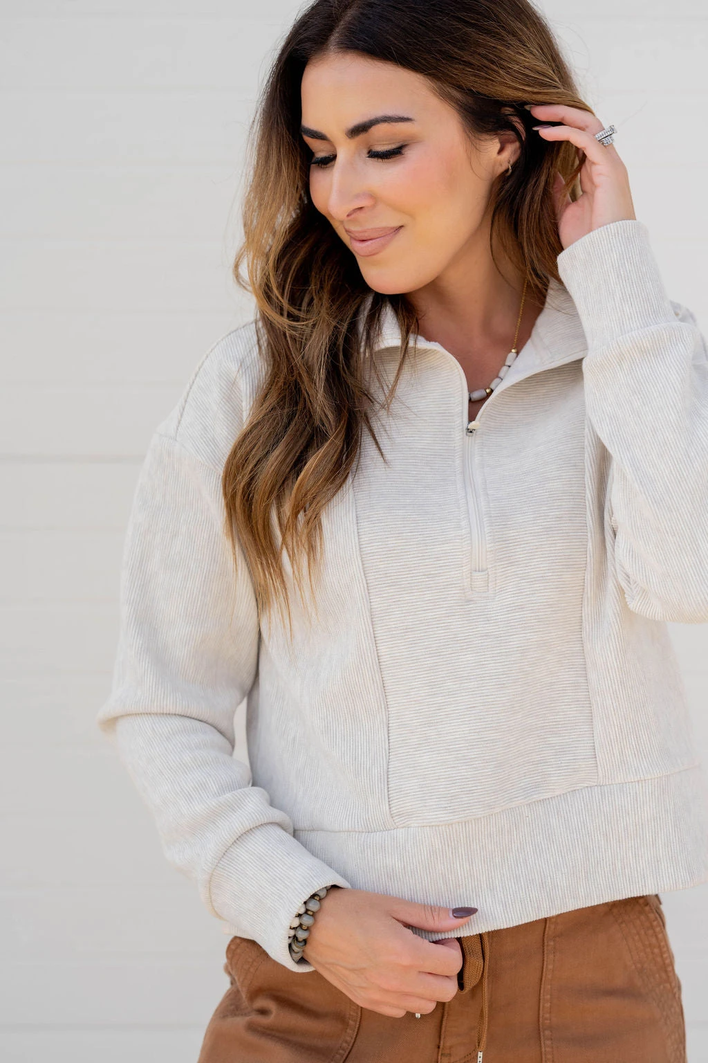 Your new go-to pullover has arrived! With the perfect transitional weight, this can be worn with shorts in the warmer months or leggings, denim, or joggers in the cooler ones! We love that this can take you from the gym to busy days on-the-go! The mixed ribs texture with the heathered look and quarter zip accent really make this one-of-a-kind!