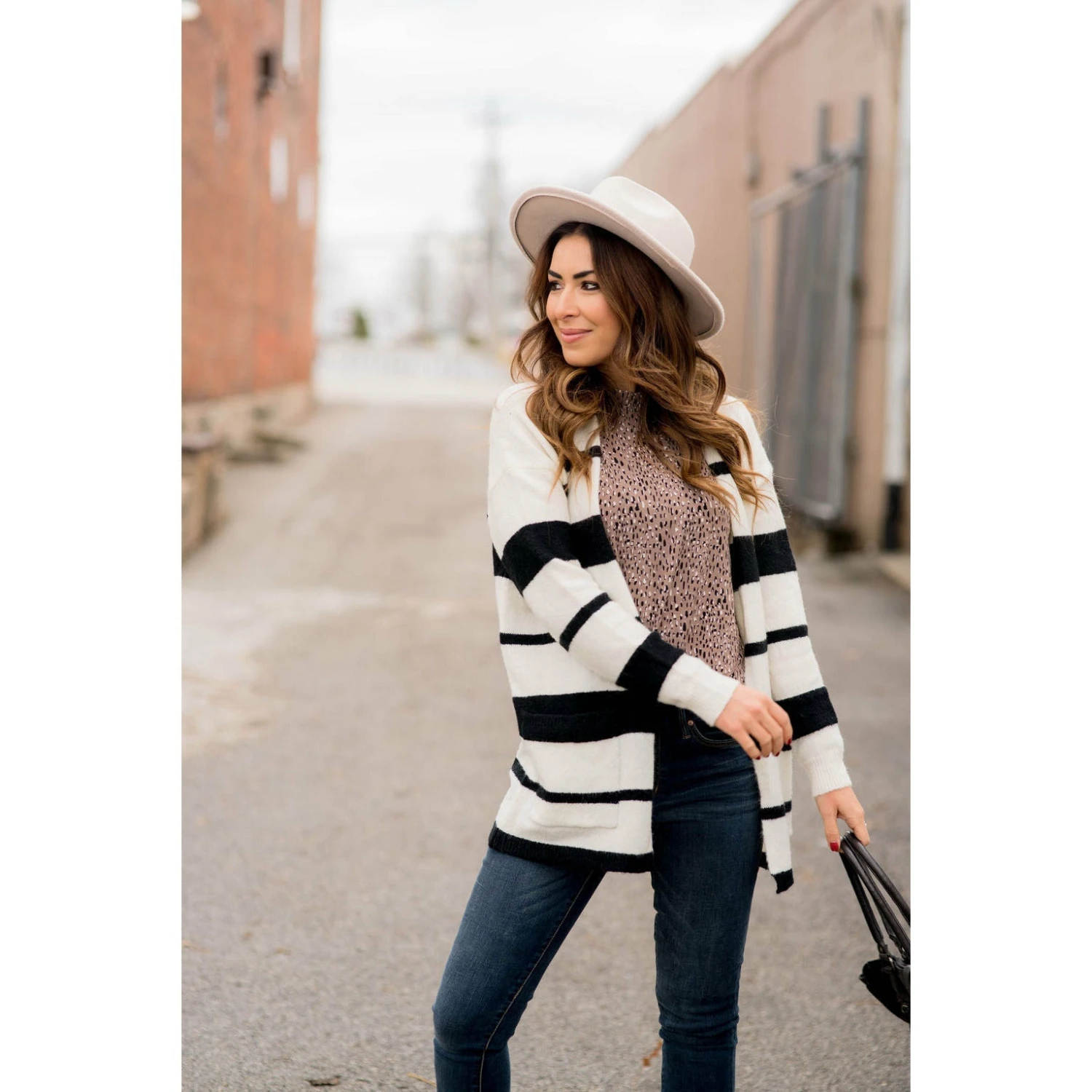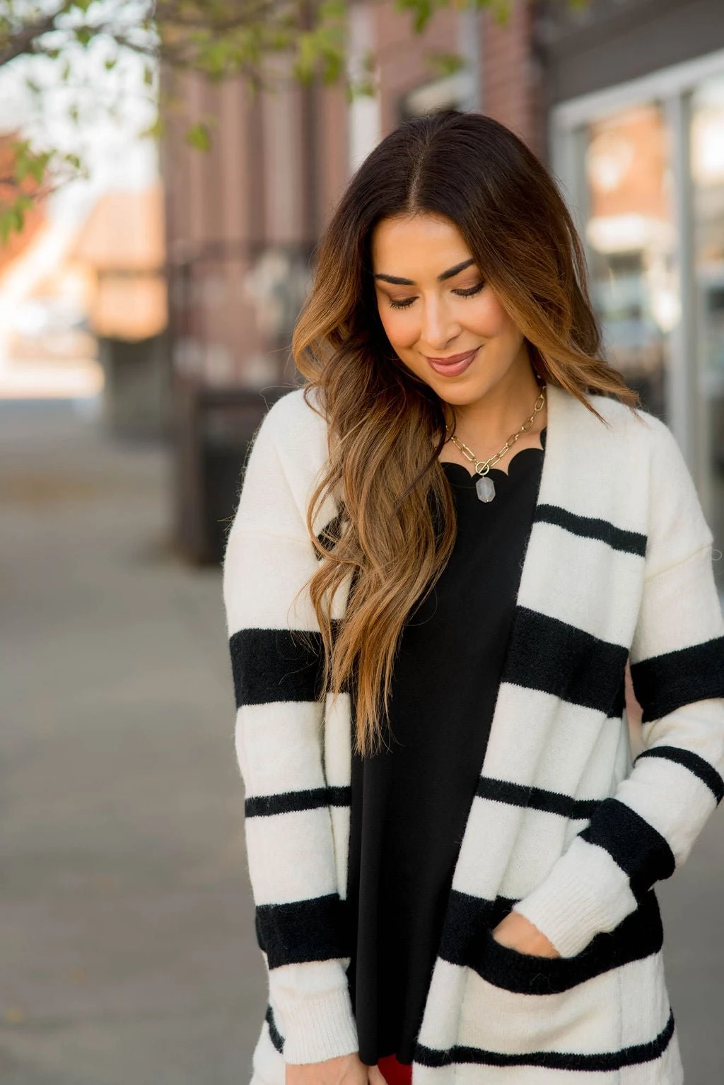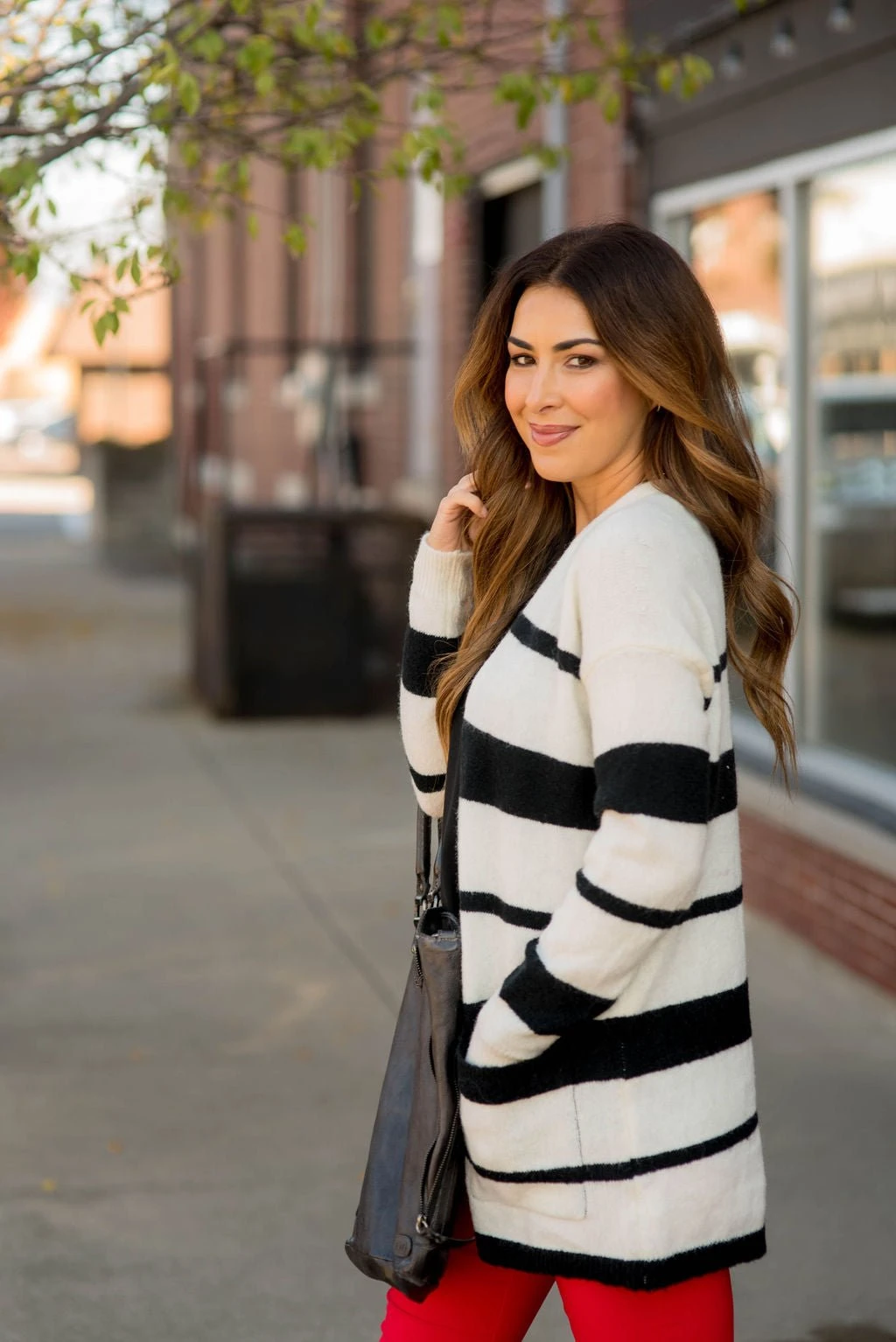 There is no such thing as owning too many cardigans. Cardigans serve multiple purposes such as keeping you warm as well as being a quick and easy fashion piece. This cardigan is so chic! The different size stripes as well as the neutral colors make this piece able to be worn with almost anything! Pair with any color under shirt and decide between leggings and jeans.