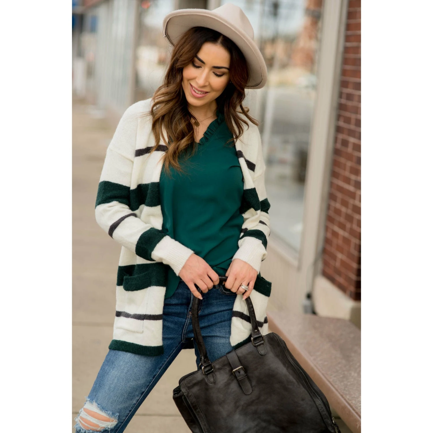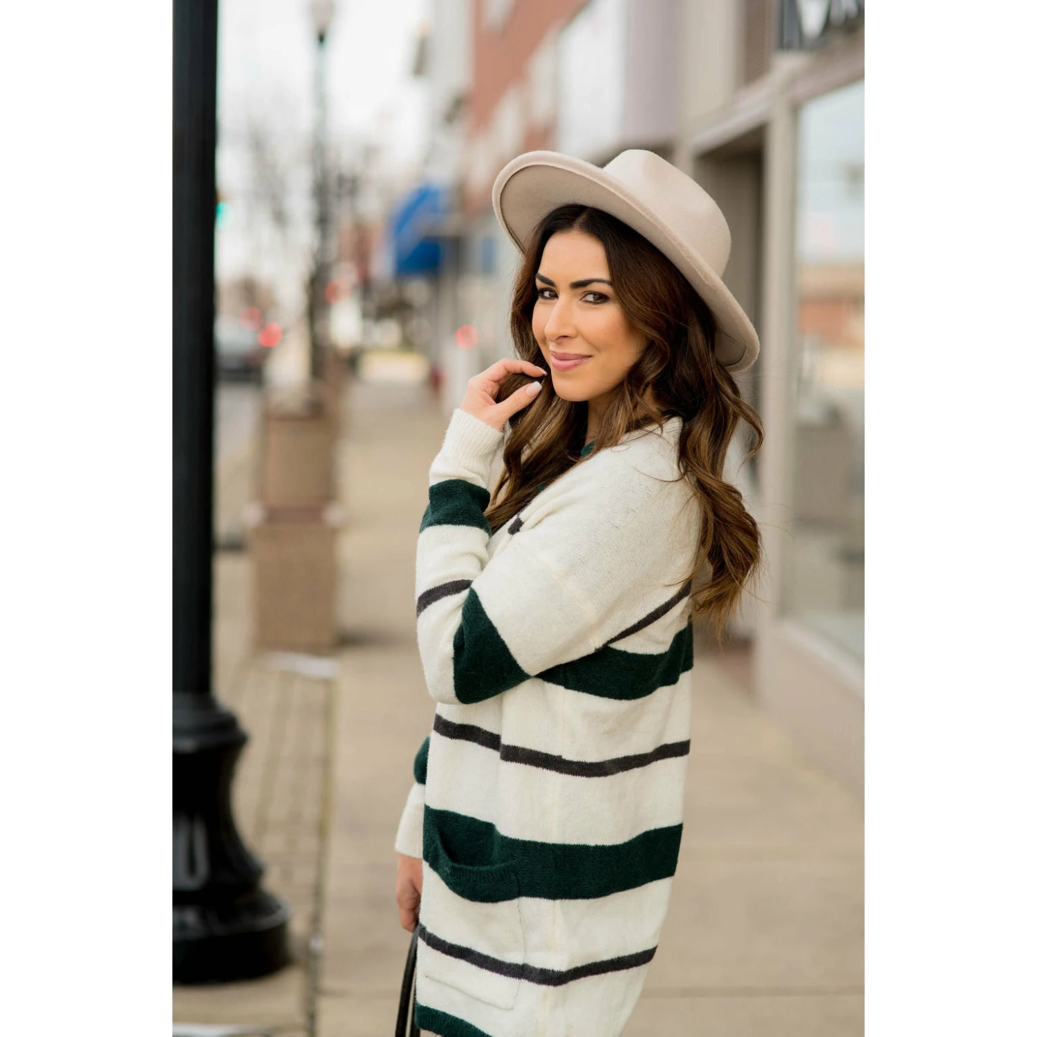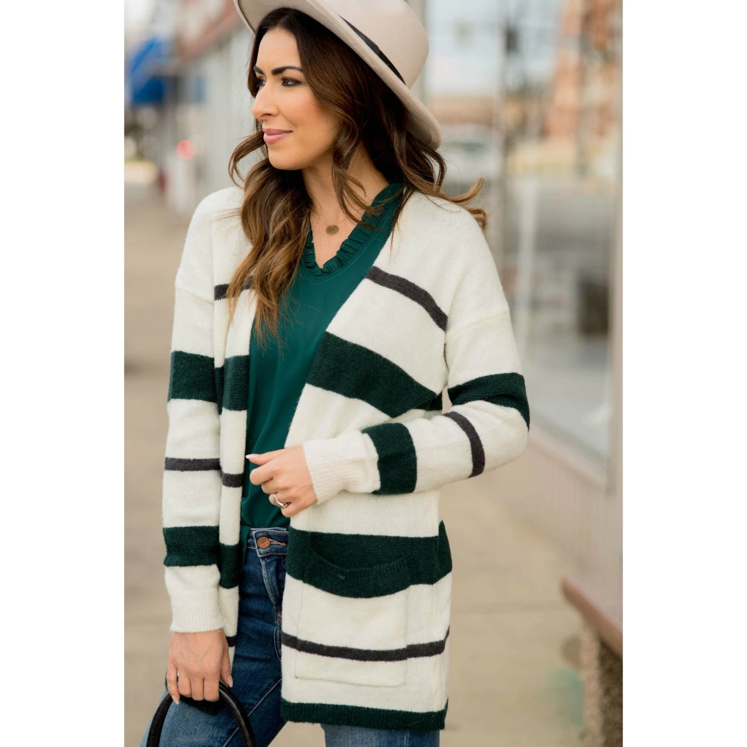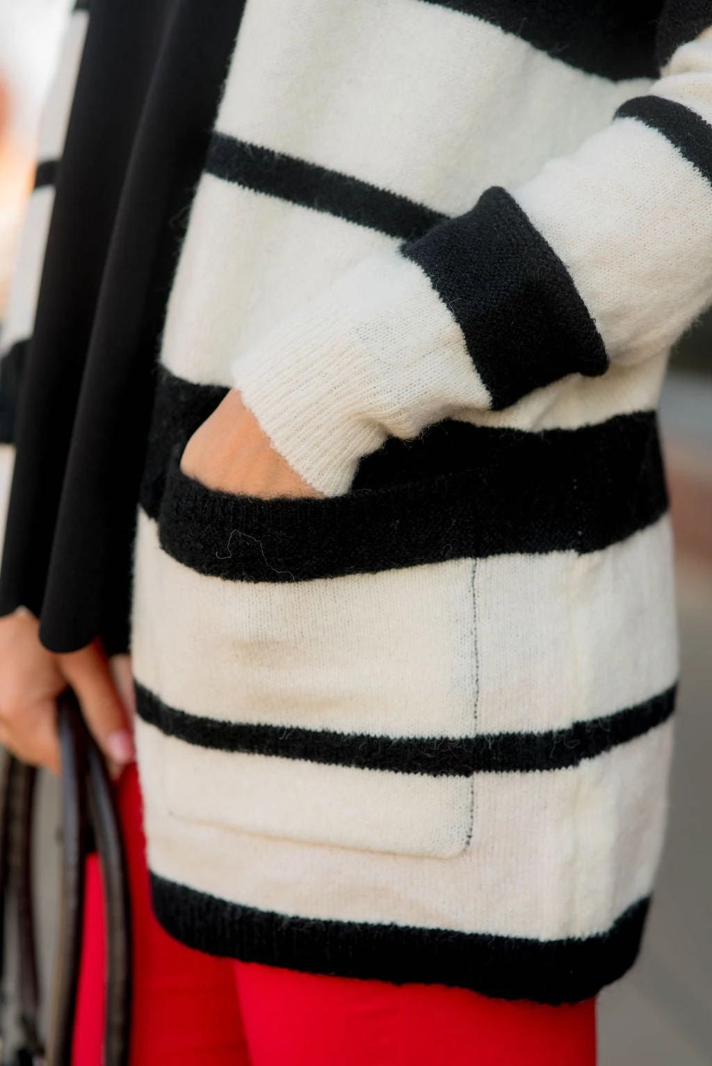 There is no such thing as owning too many cardigans. Cardigans serve multiple purposes such as keeping you warm as well as being a quick and easy fashion piece. This cardigan is so chic! The different size stripes as well as the neutral colors make this piece able to be worn with almost anything! Pair with any color under shirt and decide between leggings and jeans.