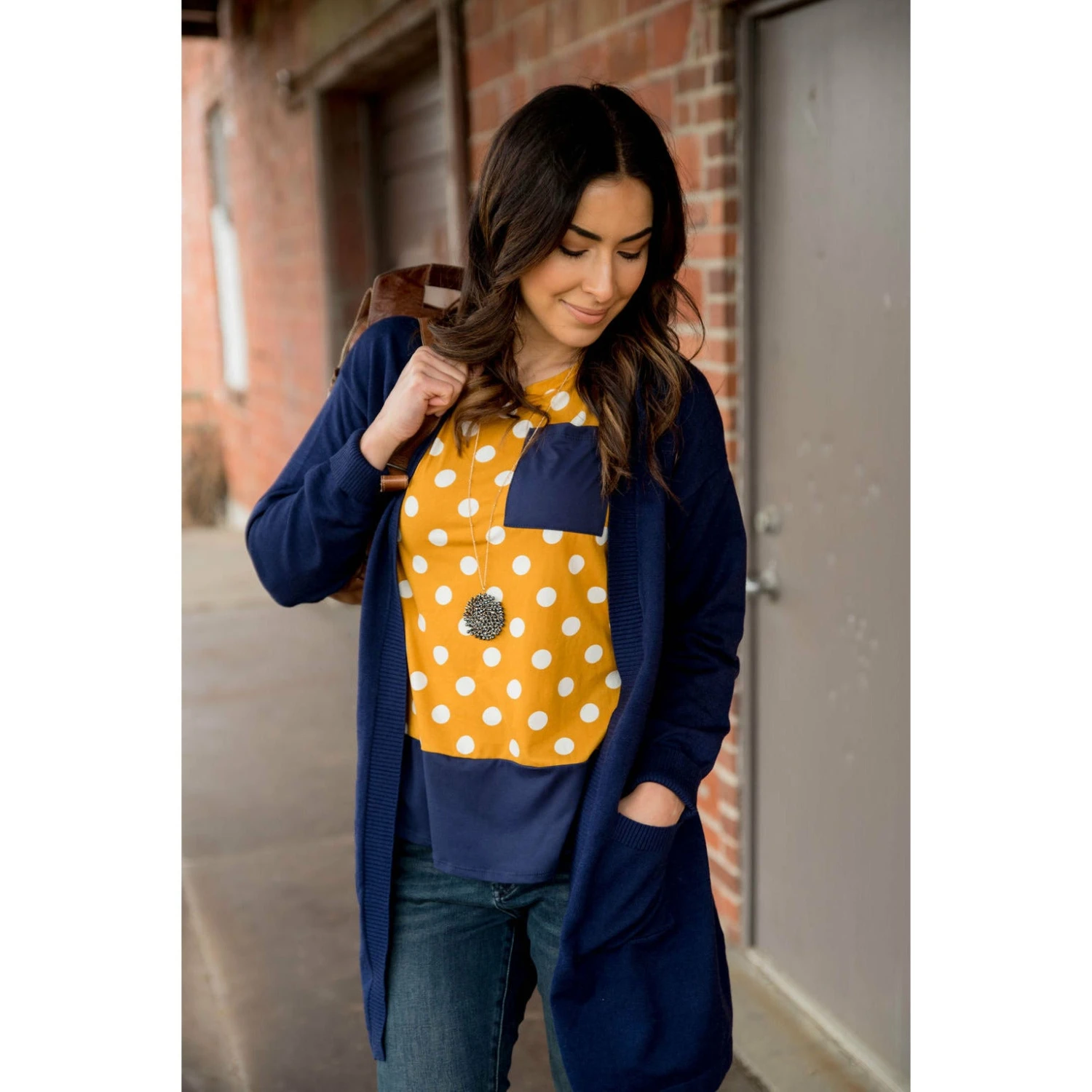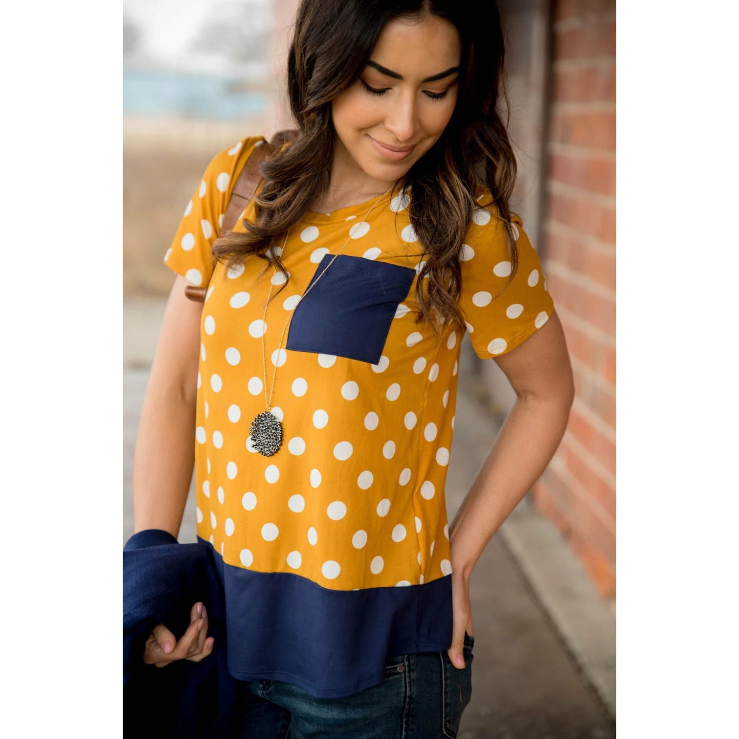 How cute is this tee?! Unlike anything in your closet with the polka dot printed body and the addition of the solid navy pocket and trim! Just pair with your favorite and a statement necklace for a comfy yet cute look!