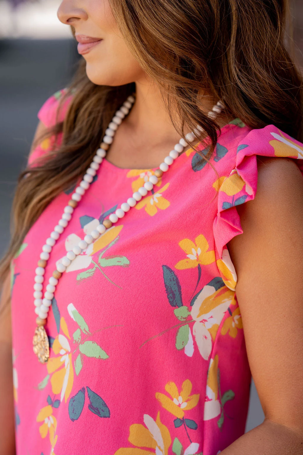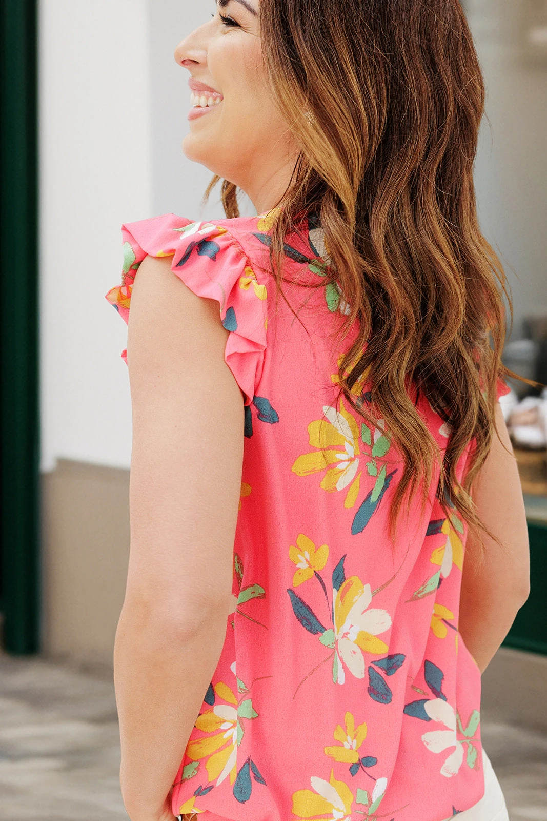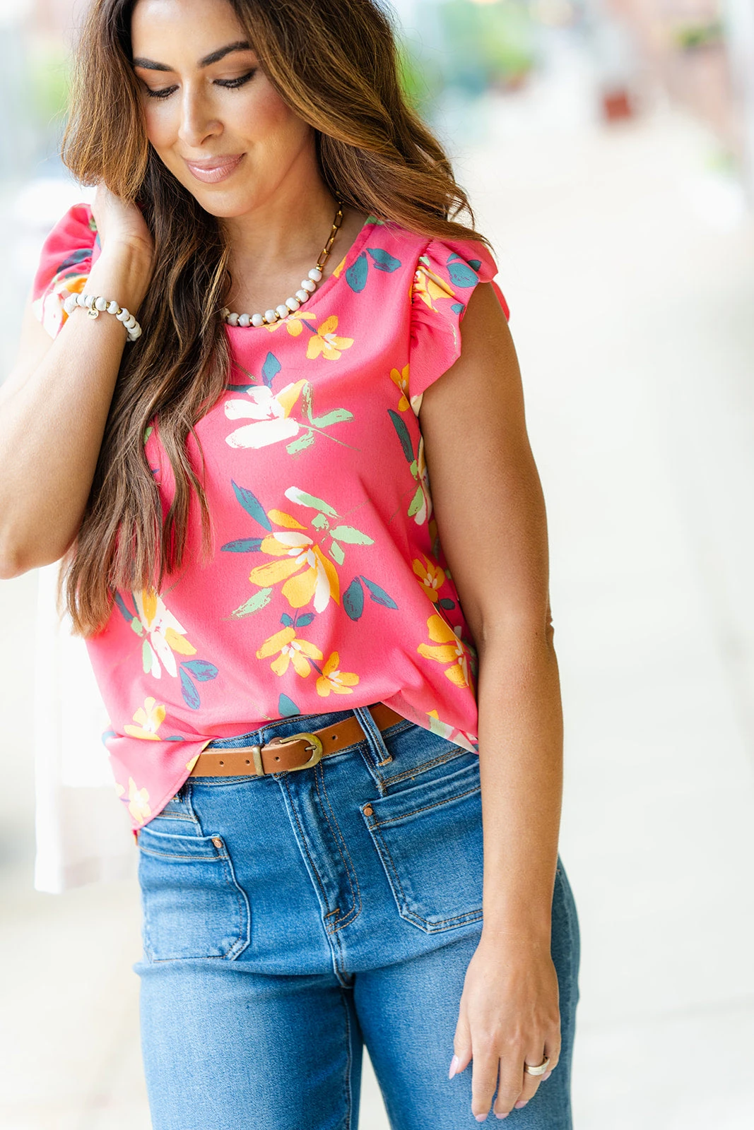 The bold floral print of this tank with the fun ruffle trim really sets it apart from the rest! We love that you can pair this with shorts or a skirt in the warmer months or with a pair of denim and a cardigan for the cooler ones!