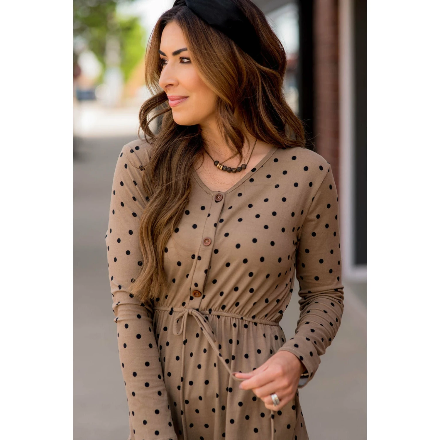 Polka dots are always a fan favorite! This super lightweight midi dress features button accents and a tie waist making it ideal for any body shape or size!
