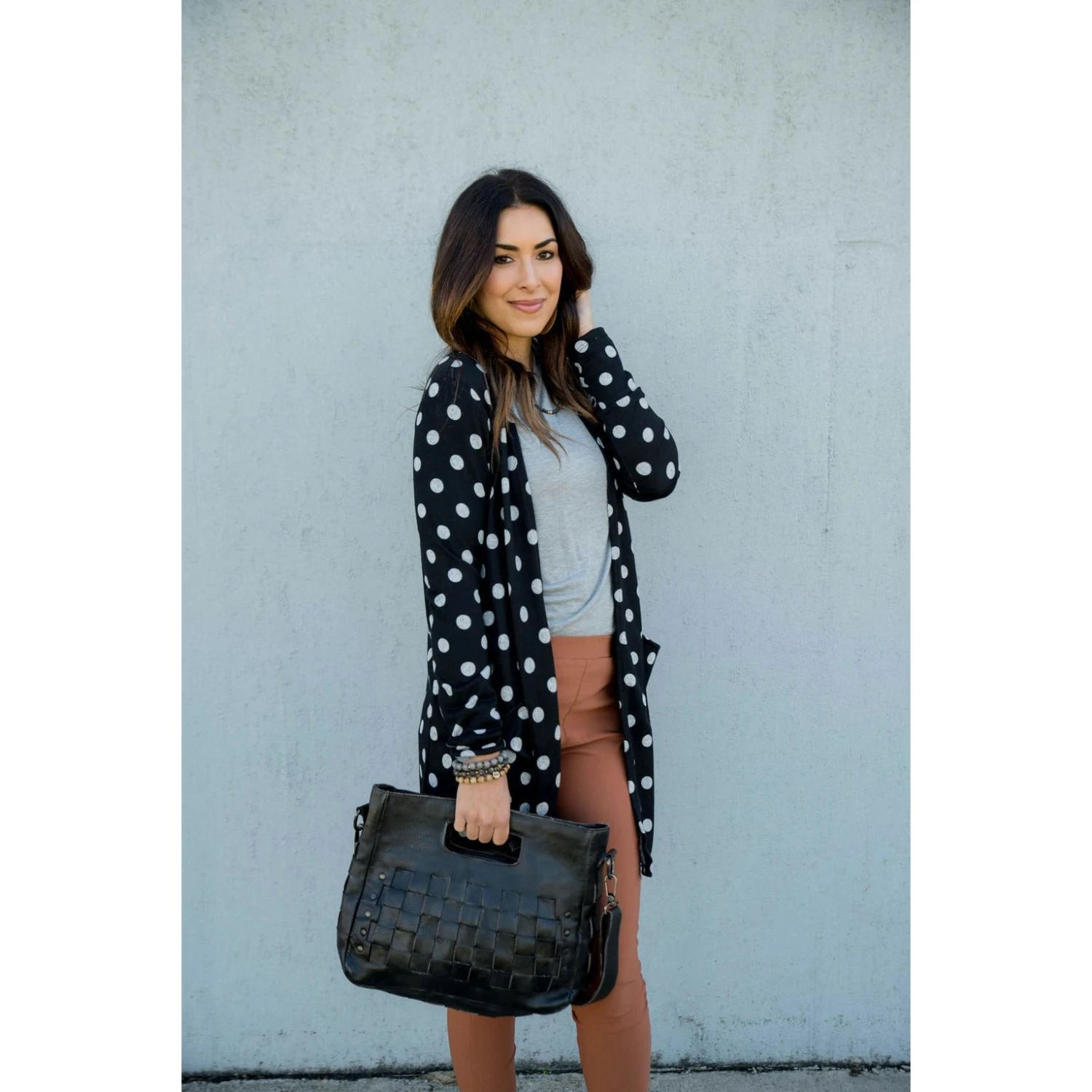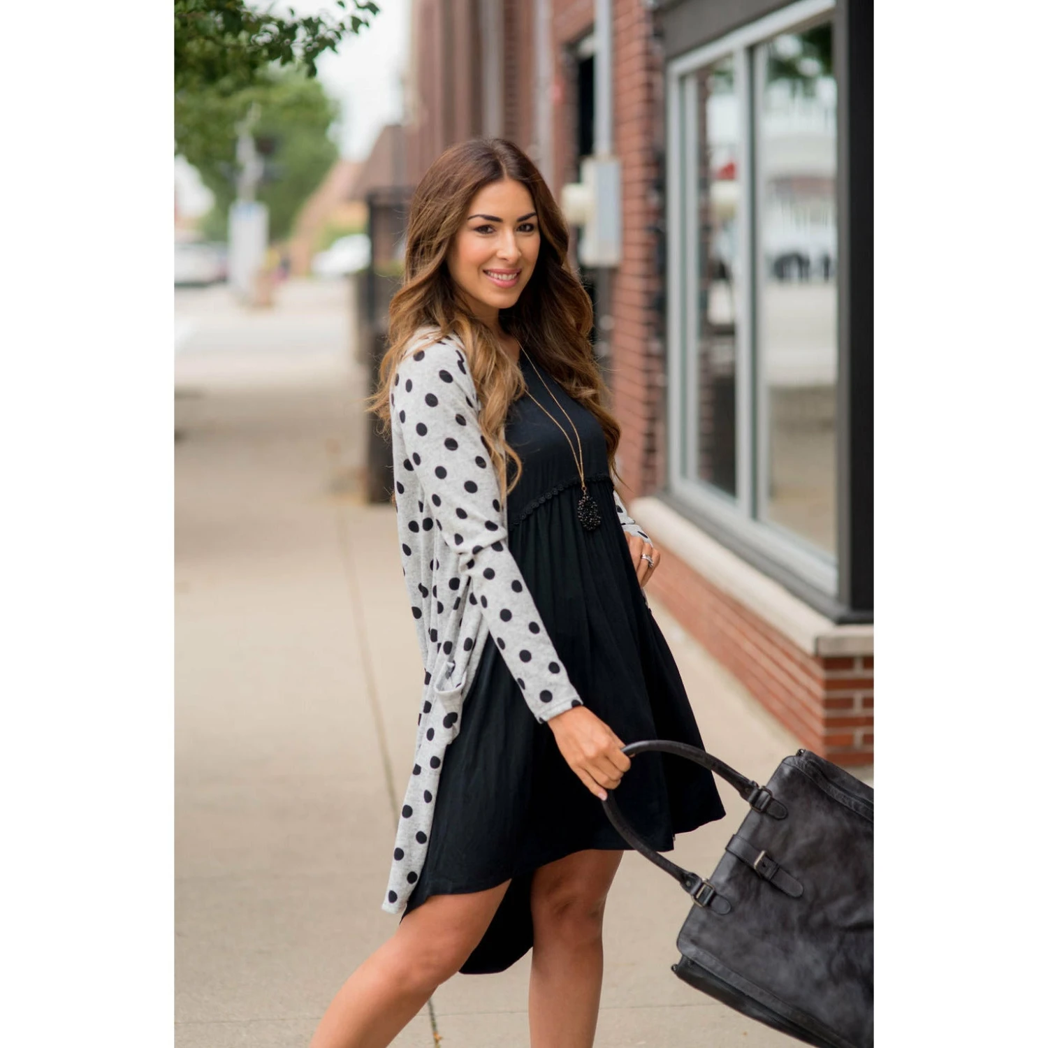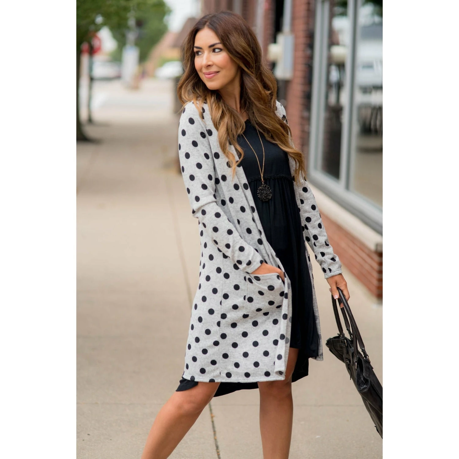 Pretty in polka dots! Our polka dot tunic cardigan has a sweater feel to it and looks great layered over a basic tee!