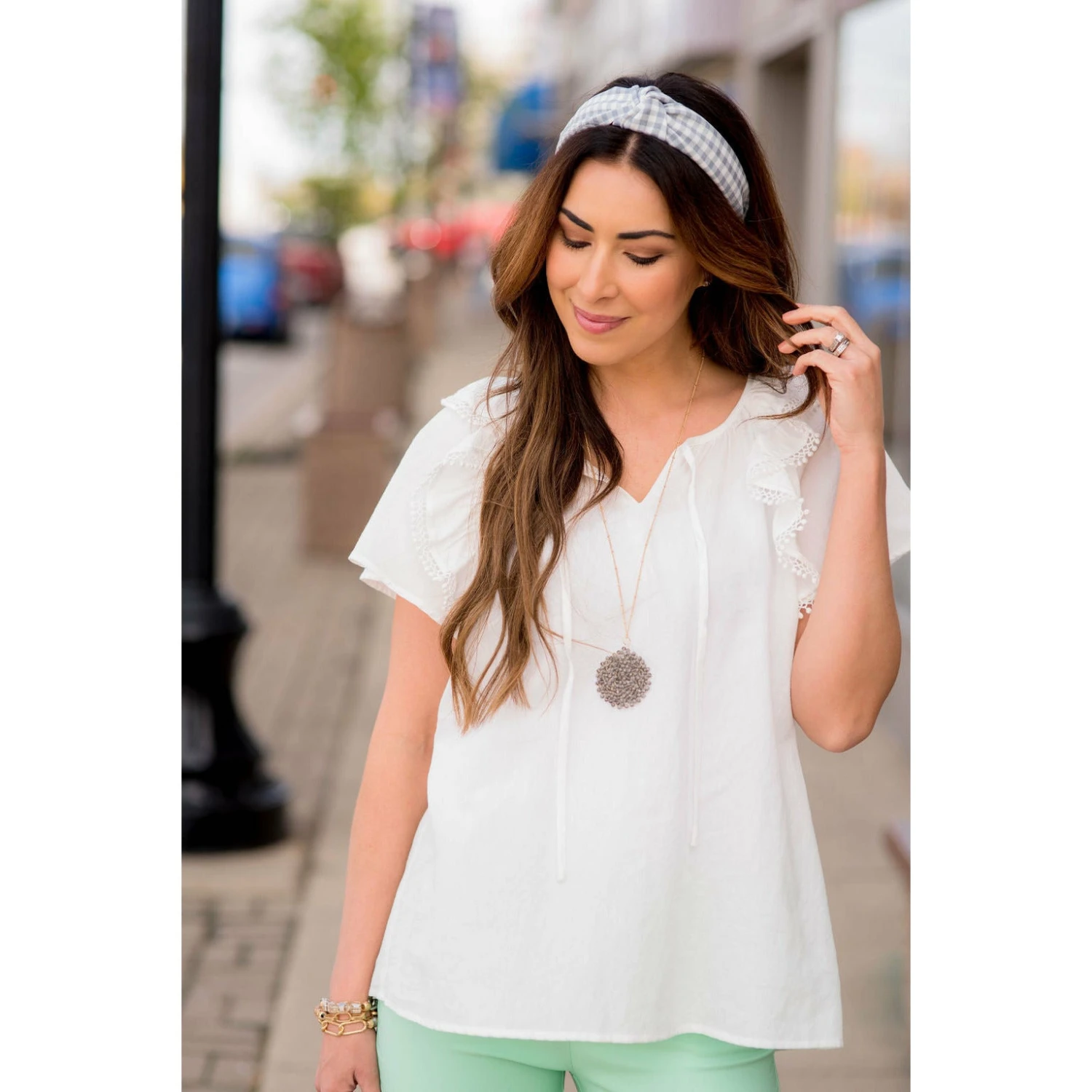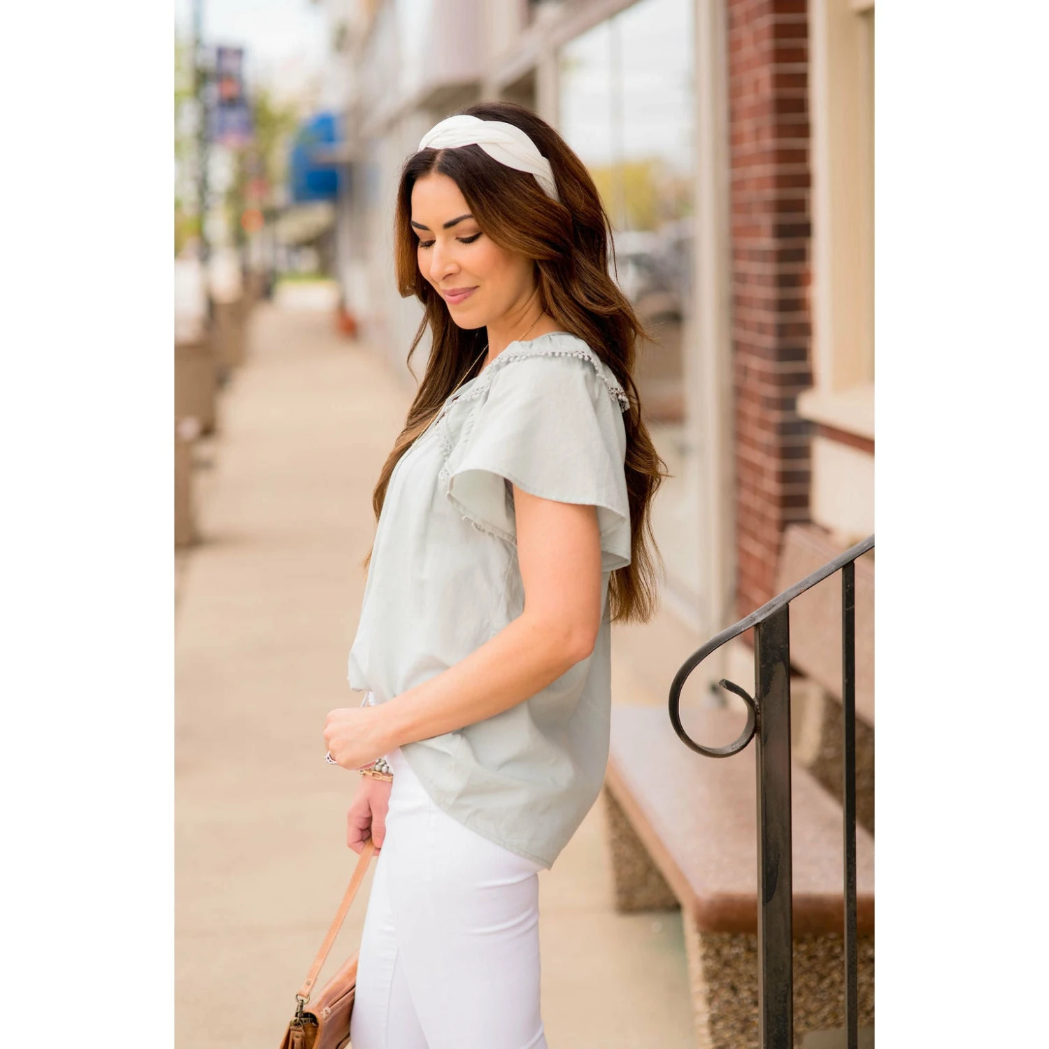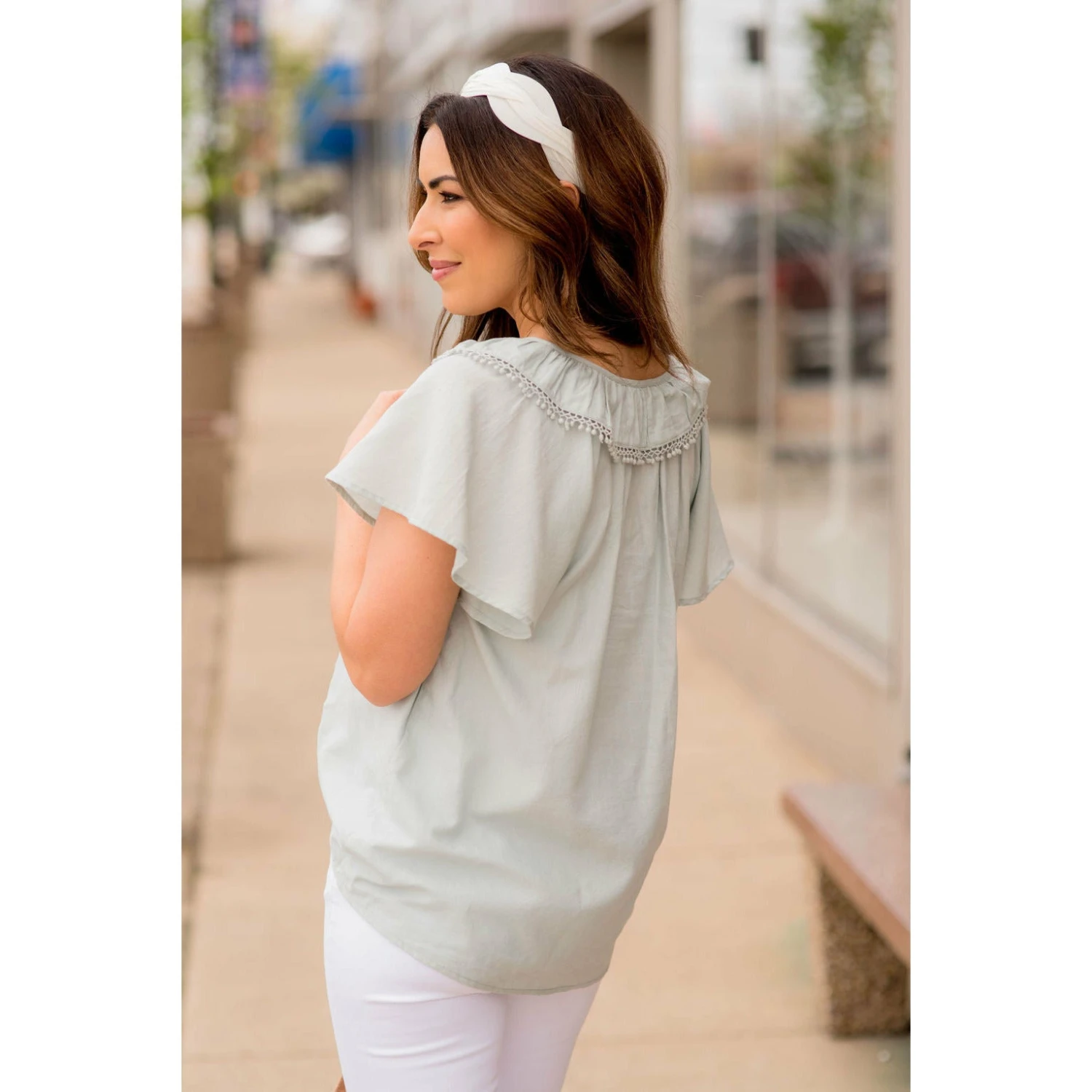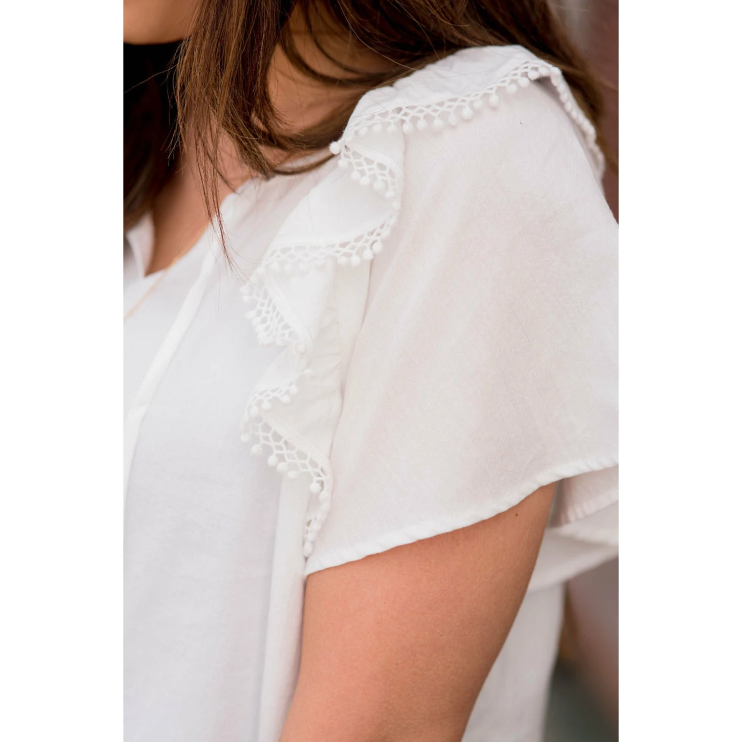 Bring on the warm weather with this fun, short sleeve blouse! The flowy flutter sleeves and pom pom trim on the sleeves make such a fun, unique look! Pair with jeggings and a denim jacket for a fun, stylish outfit!
