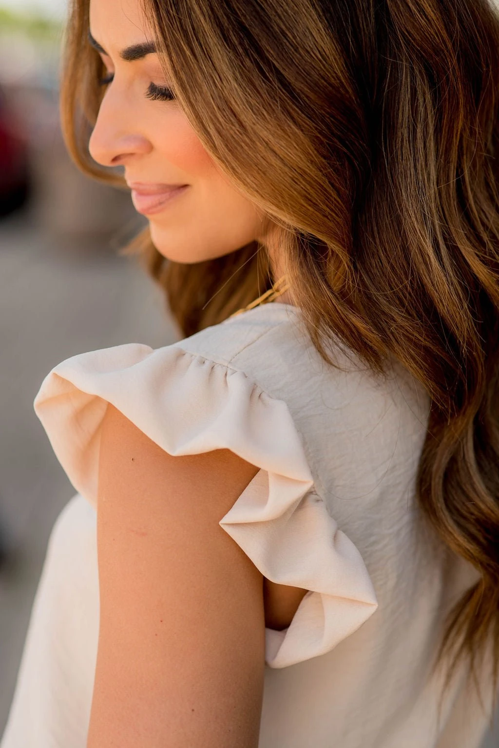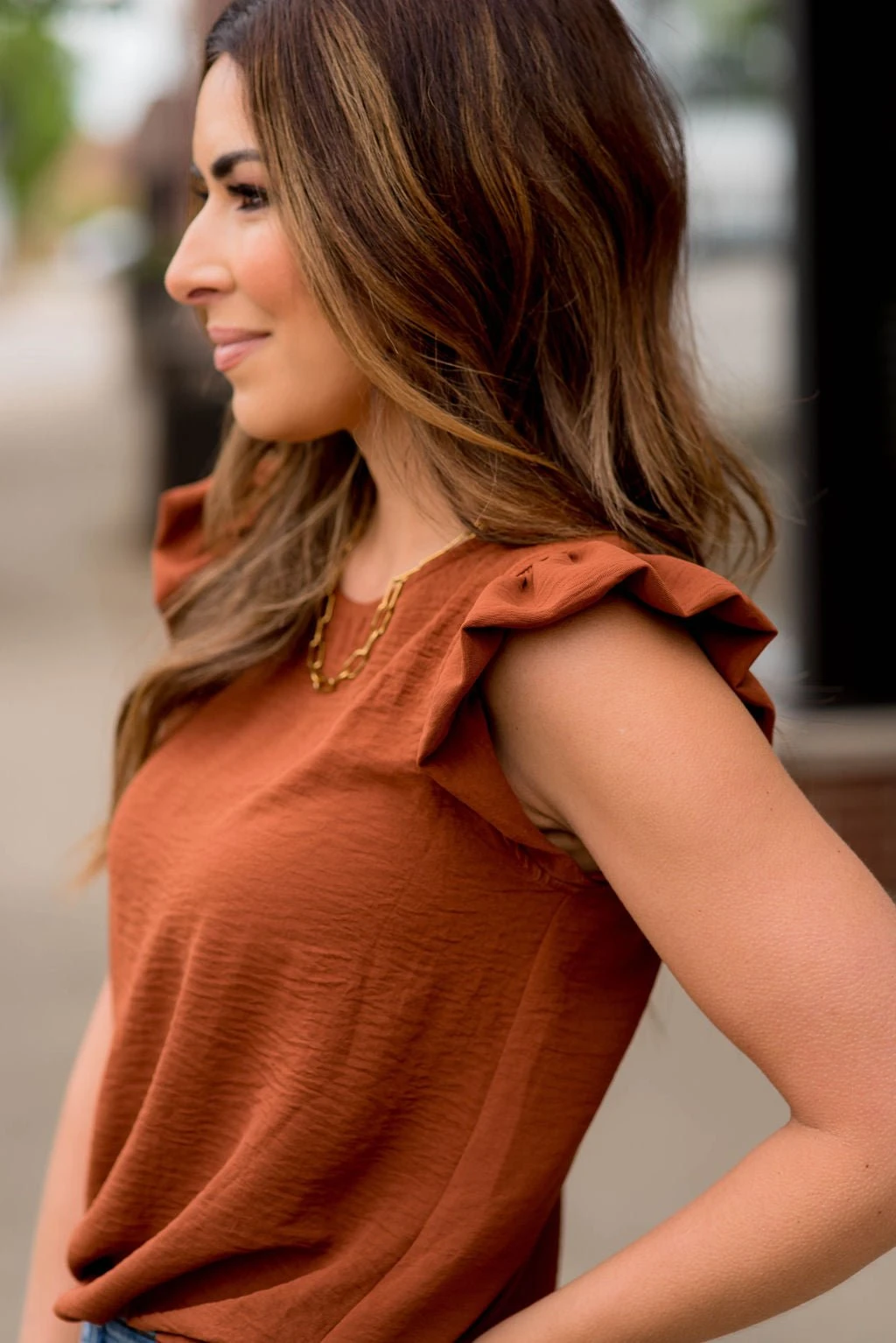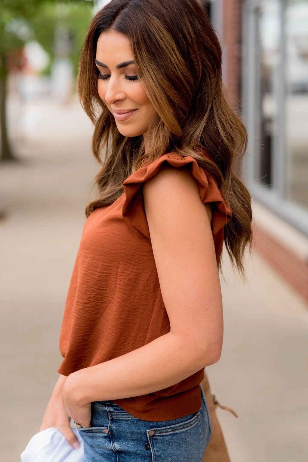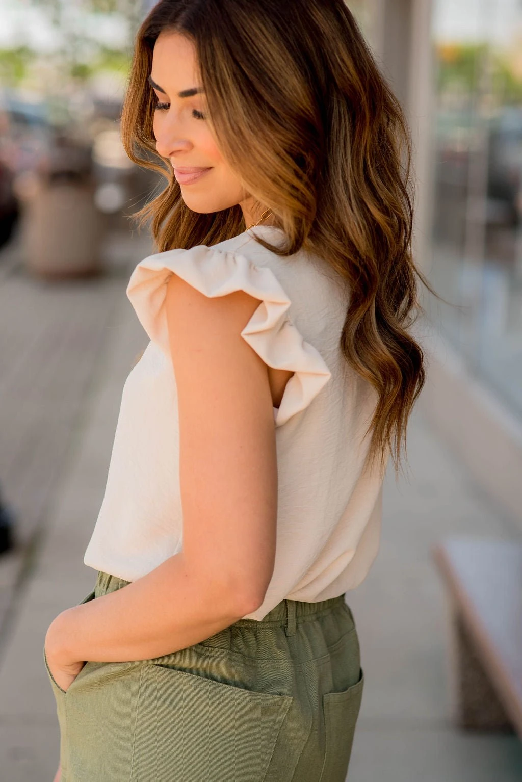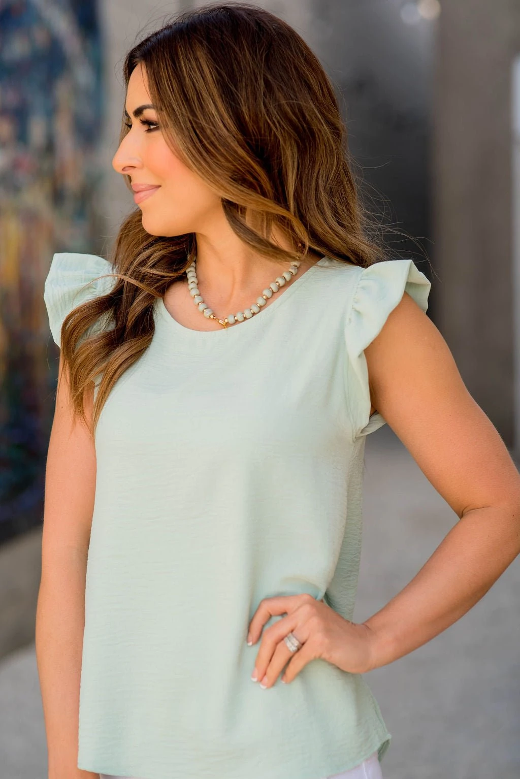 The flutter trim accents and the dressy blouse-like material sets this blouse apart from the rest! This blouse is bold enough to wear on its own, but can just as easily be layered up with your favorite cardigan or kimono, making it the perfect staple piece for your wardrobe!