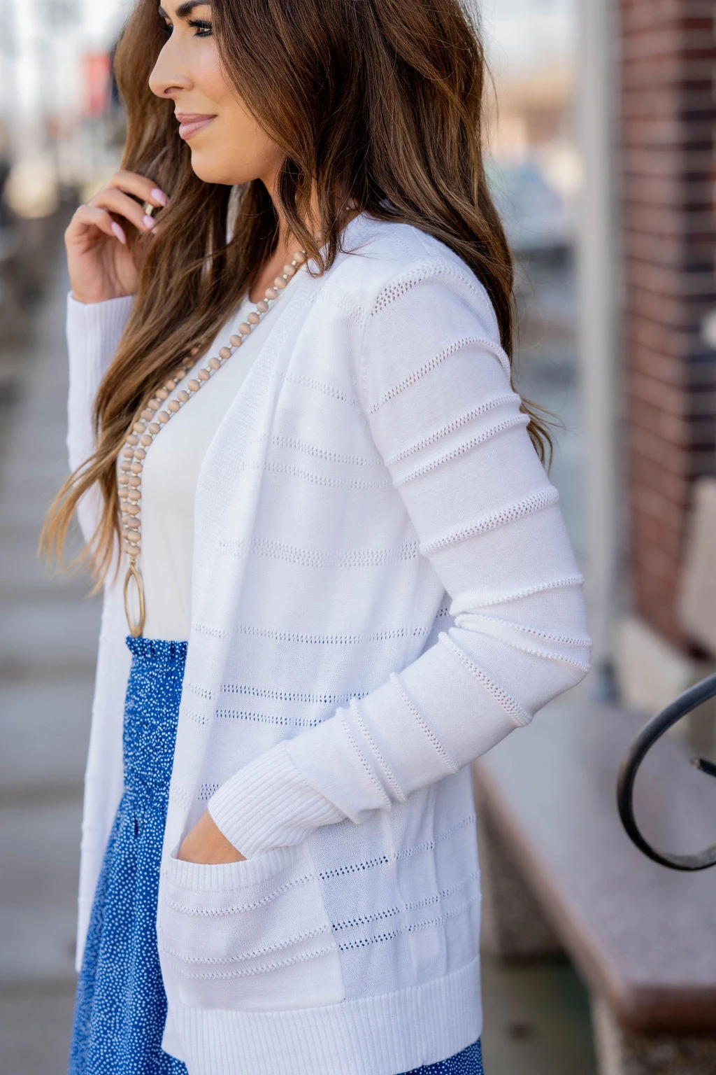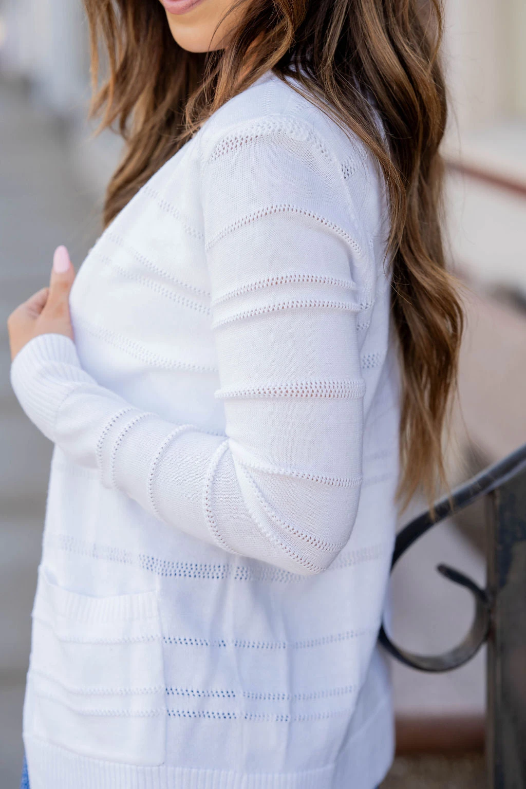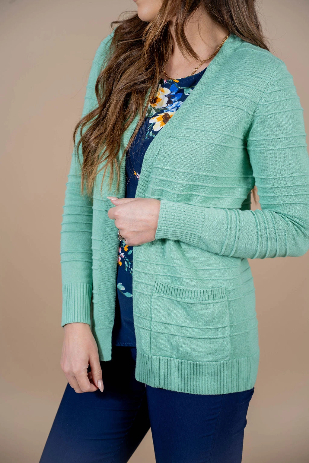 Cardigans are an essential part of every girls wardrobe! They are so easy to style and perfectly transition you through seasons! This cardigan features raised stripes and a ribbed trim to give it that little added texture!Â