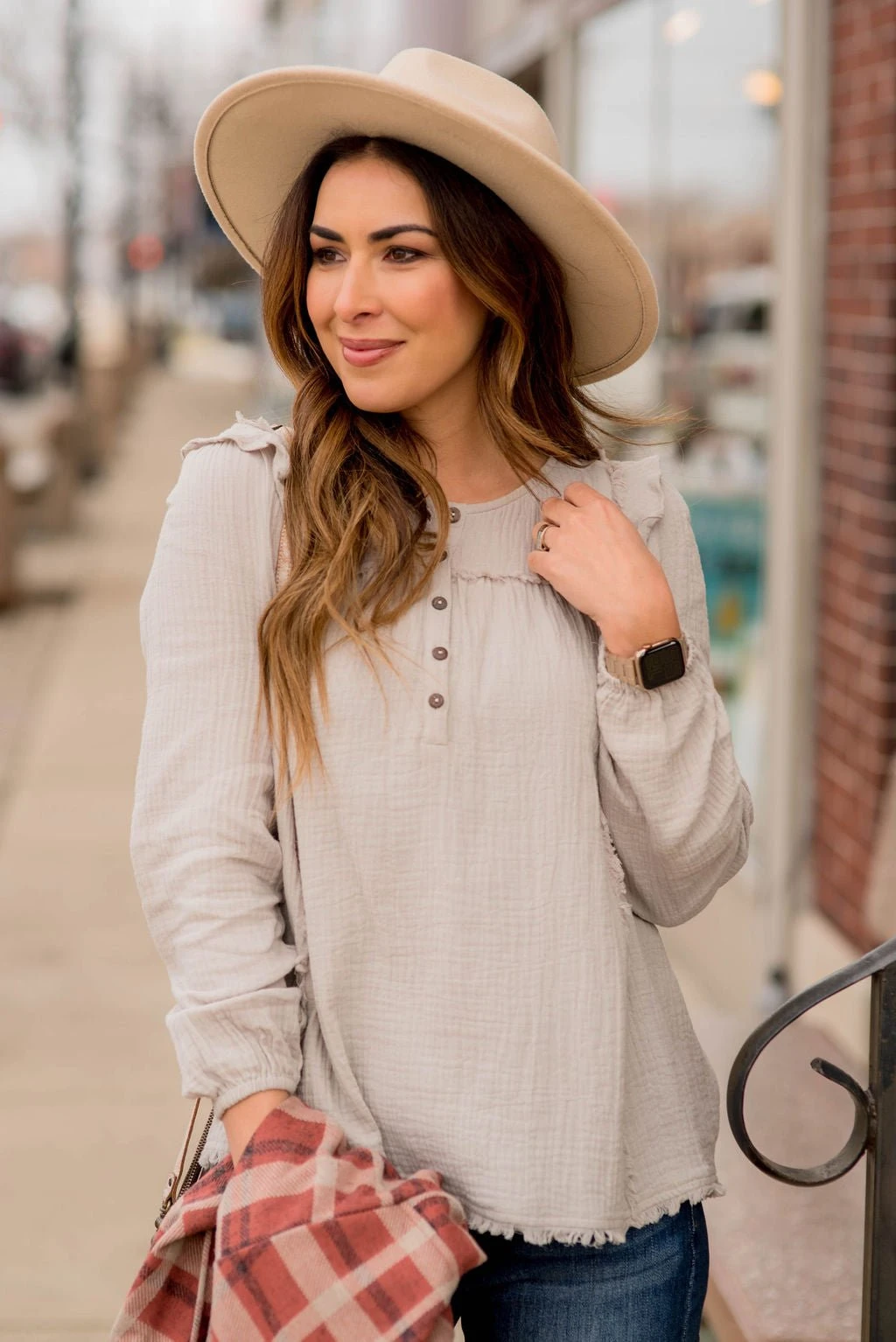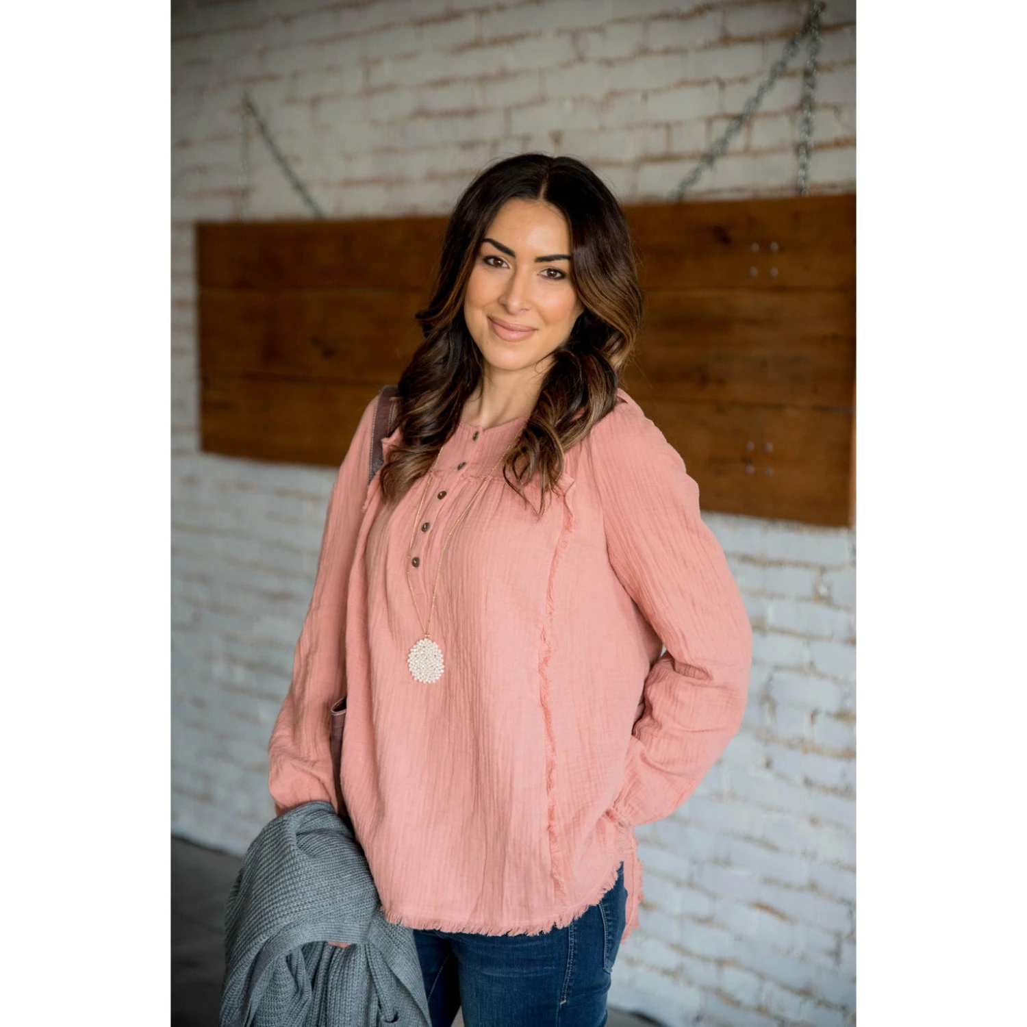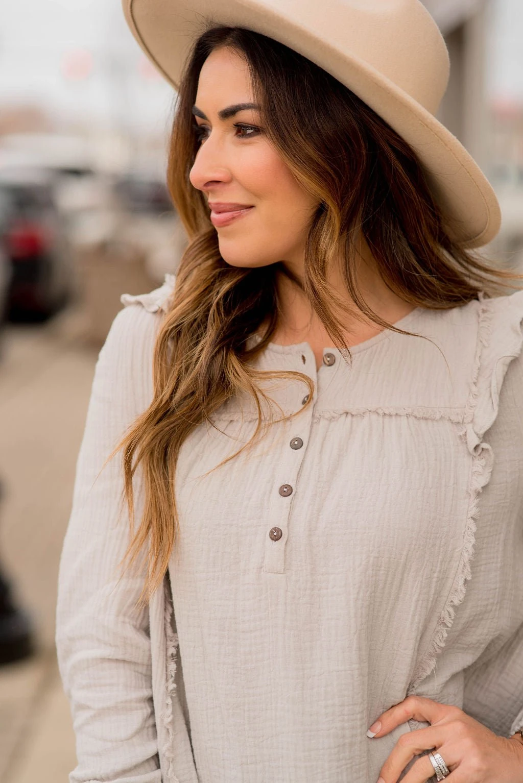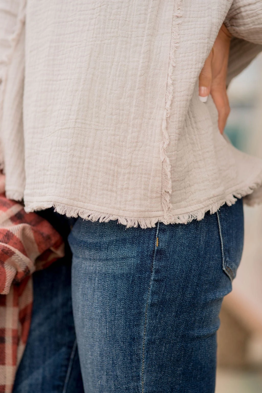 You have to try this new look! This raw edge button top blouse is light with a flowy fit and works for any occasion.