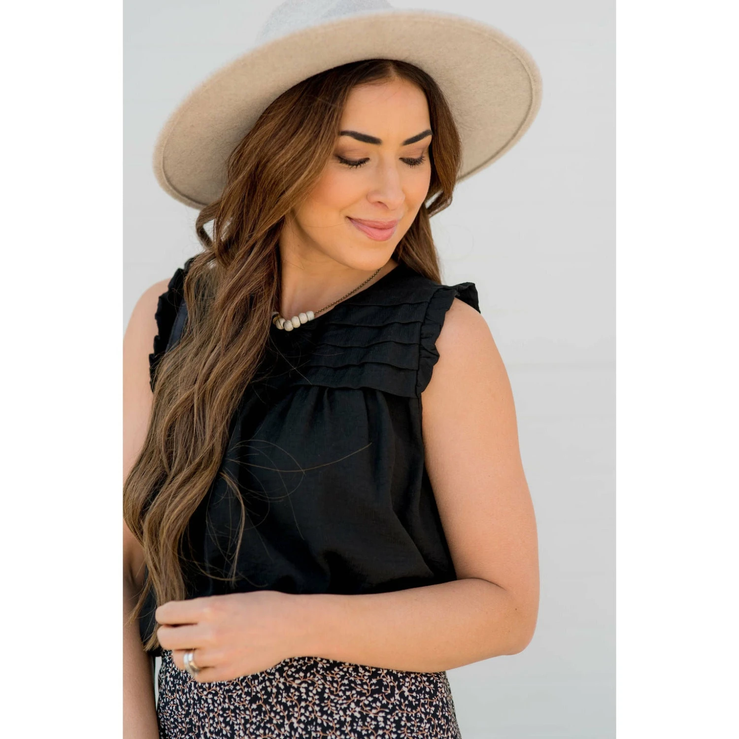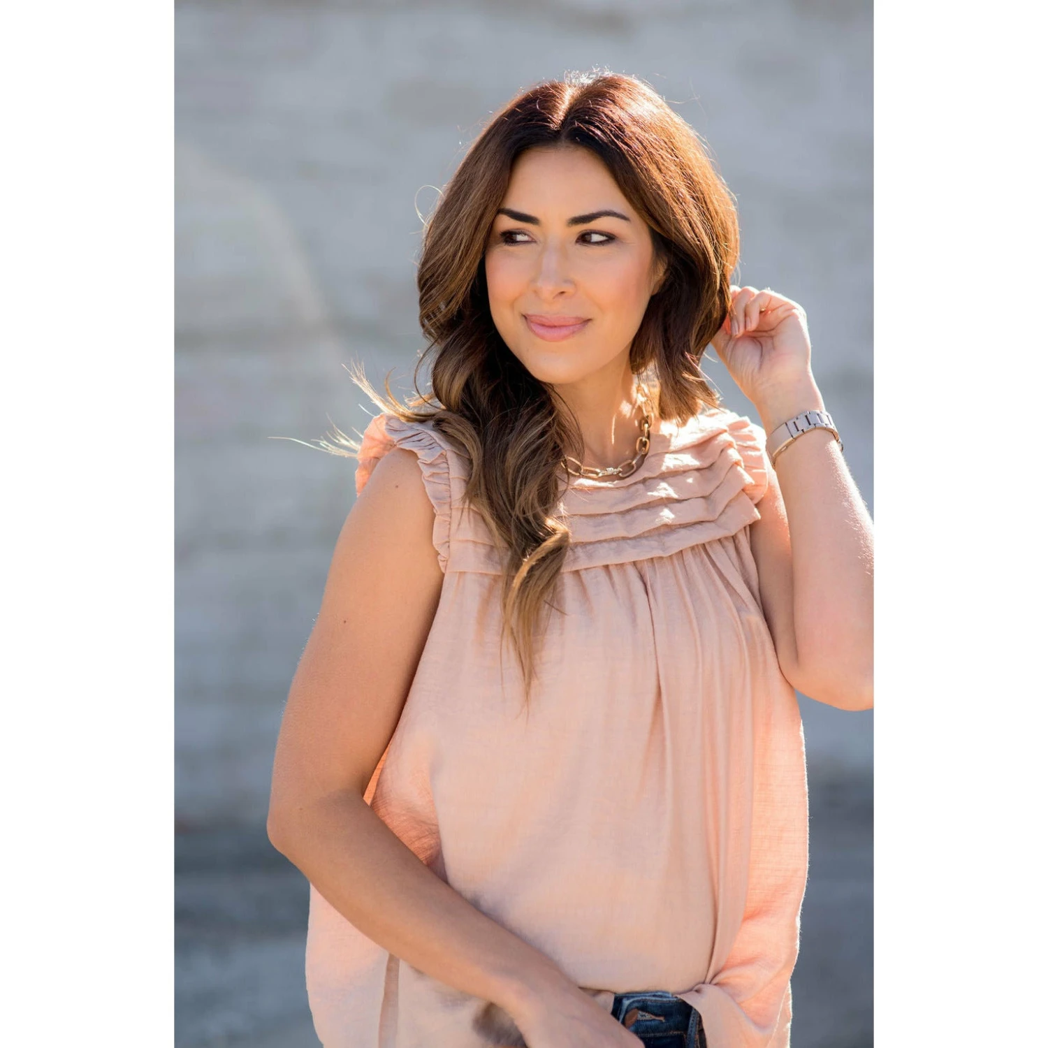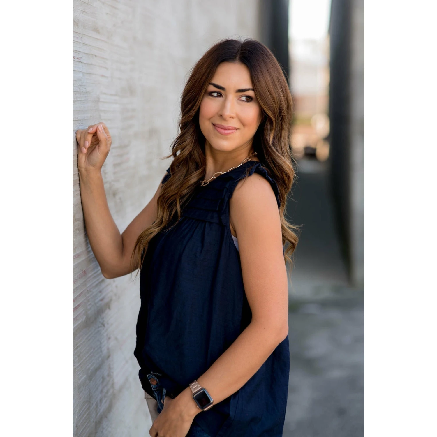 How cute is this new tank?! With a ruched, bibbed ruffle at the top, and a small ruffle accent around the sleeve, we are absolutely in love! It looks so cute with jeans or a skirt. Wear it tucked in or out. Need an extra layer? Add your favorite cardigan!