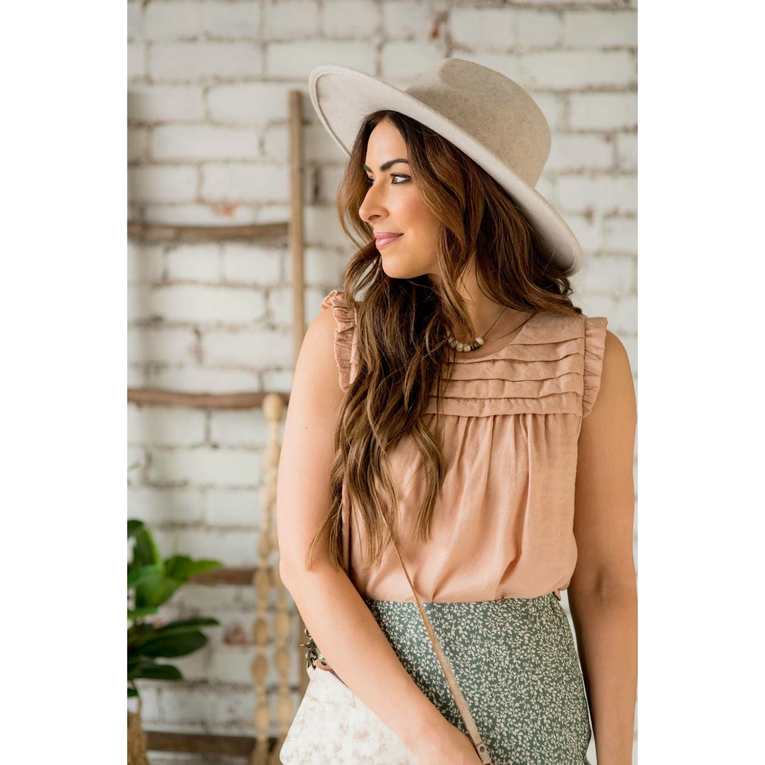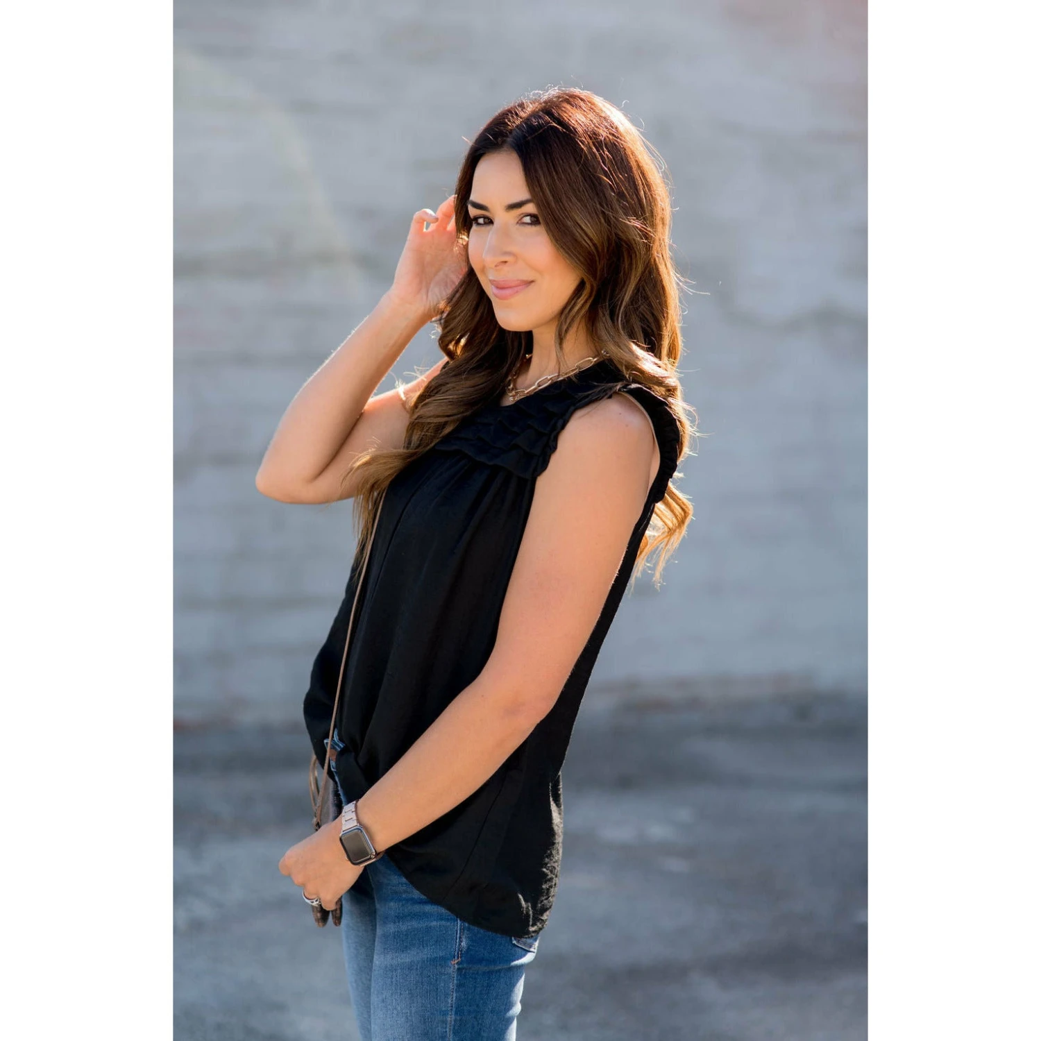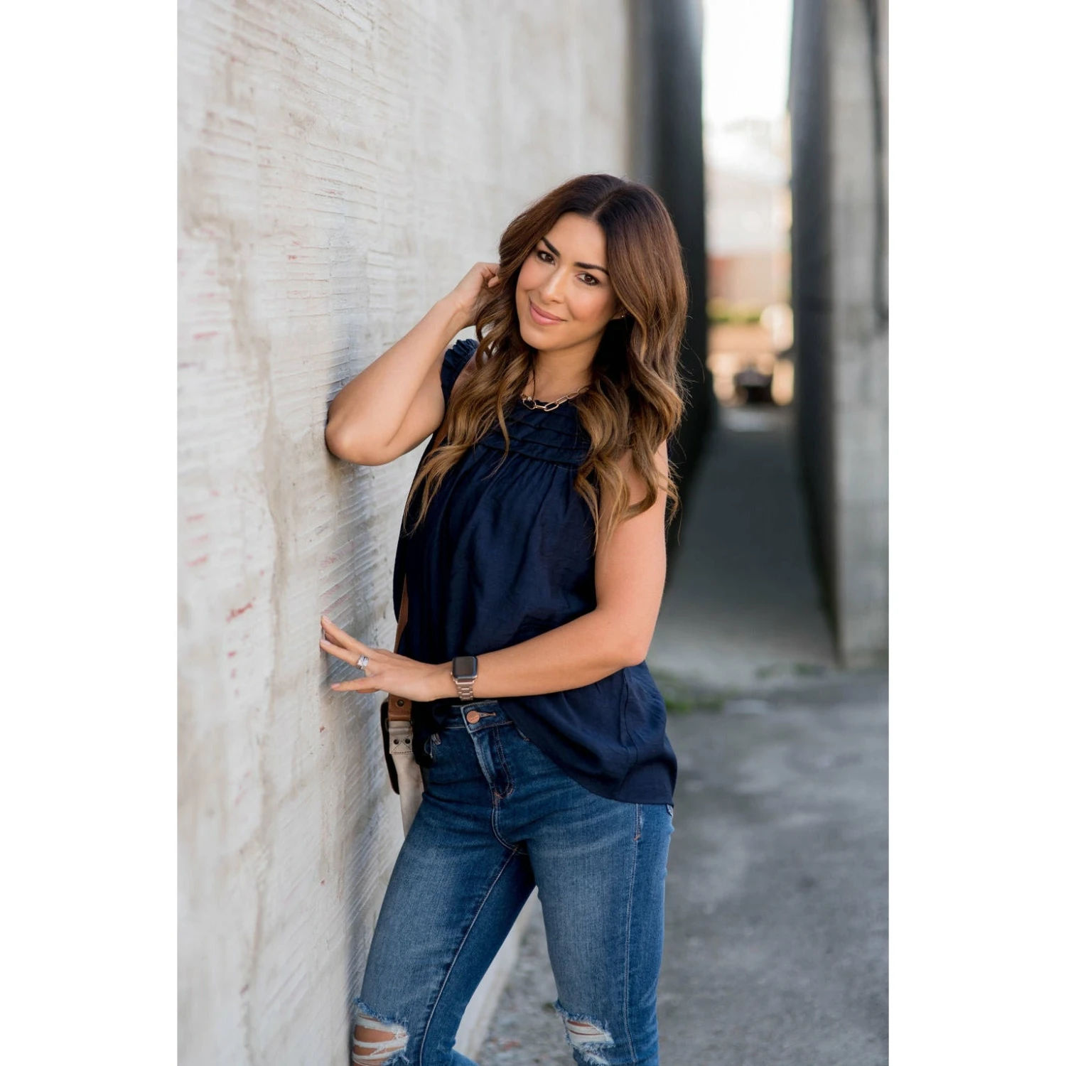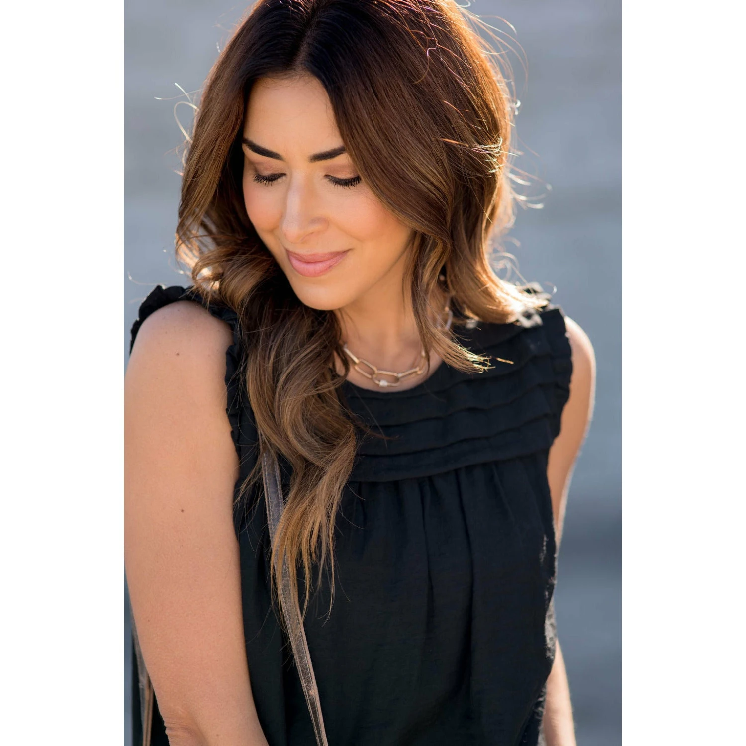How cute is this new tank?! With a ruched, bibbed ruffle at the top, and a small ruffle accent around the sleeve, we are absolutely in love! It looks so cute with jeans or a skirt. Wear it tucked in or out. Need an extra layer? Add your favorite cardigan!