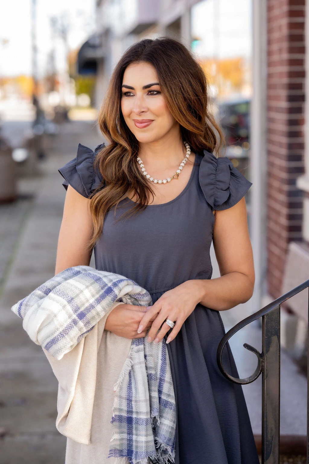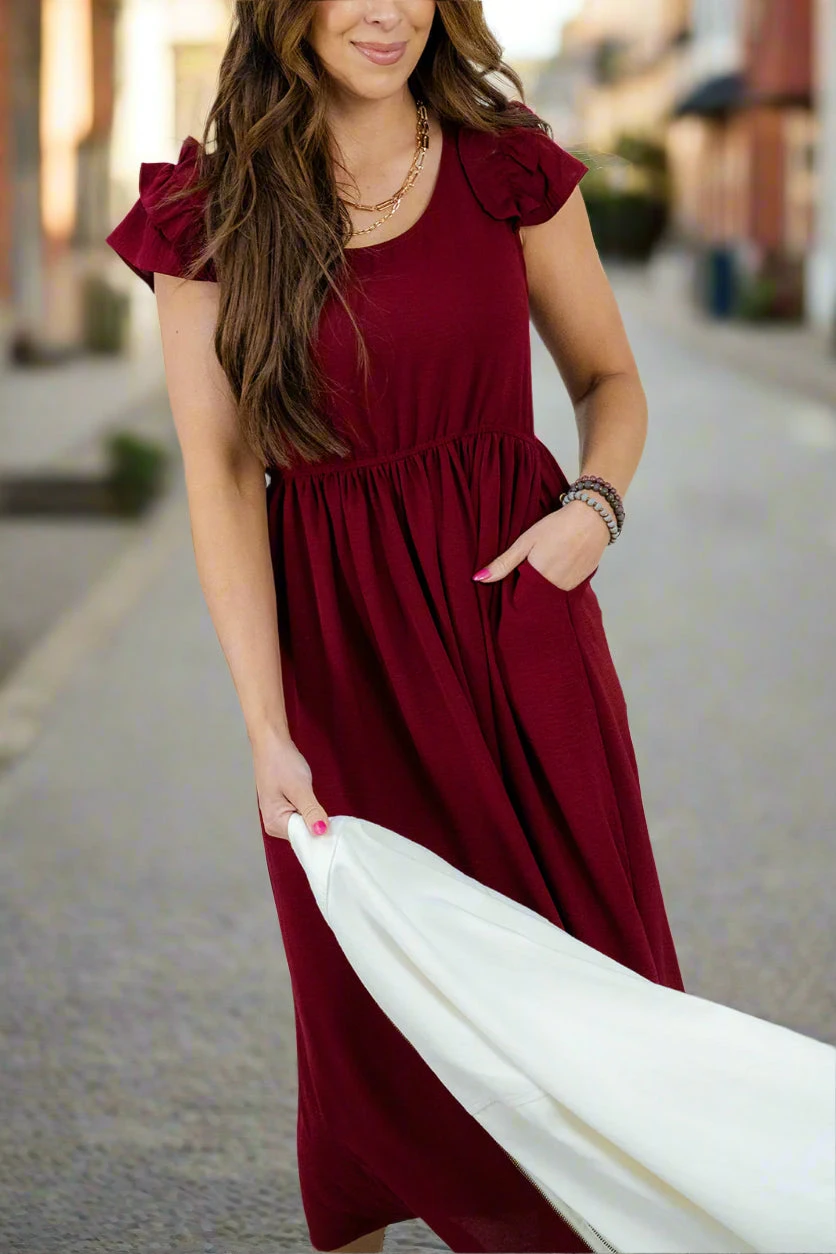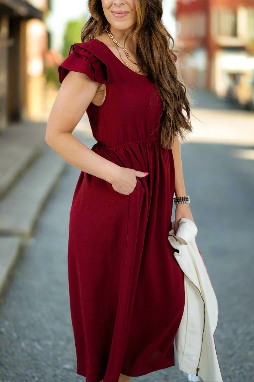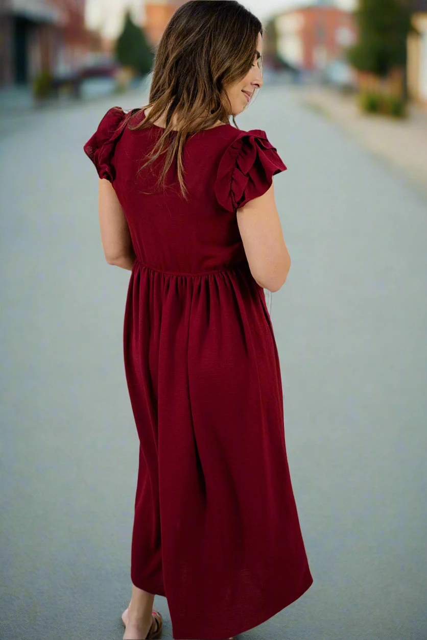 Are you looking for the perfect maxi? This one is it! With the maxi length and the ruched ruffle shoulder accents, this maxi is great for day-to-day wear, but is also great for a night out! Add your favorite sandals and accessories for the warmer weather or with a cardigan, blazer, or jacket and booties for the cooler ones! This is a great staple piece for your wardrobe and easy to style your own way!