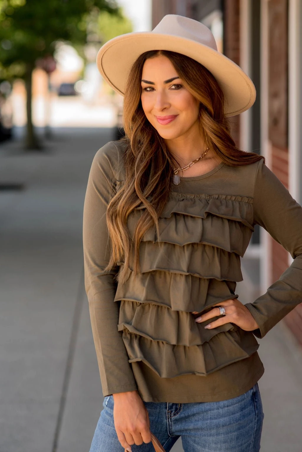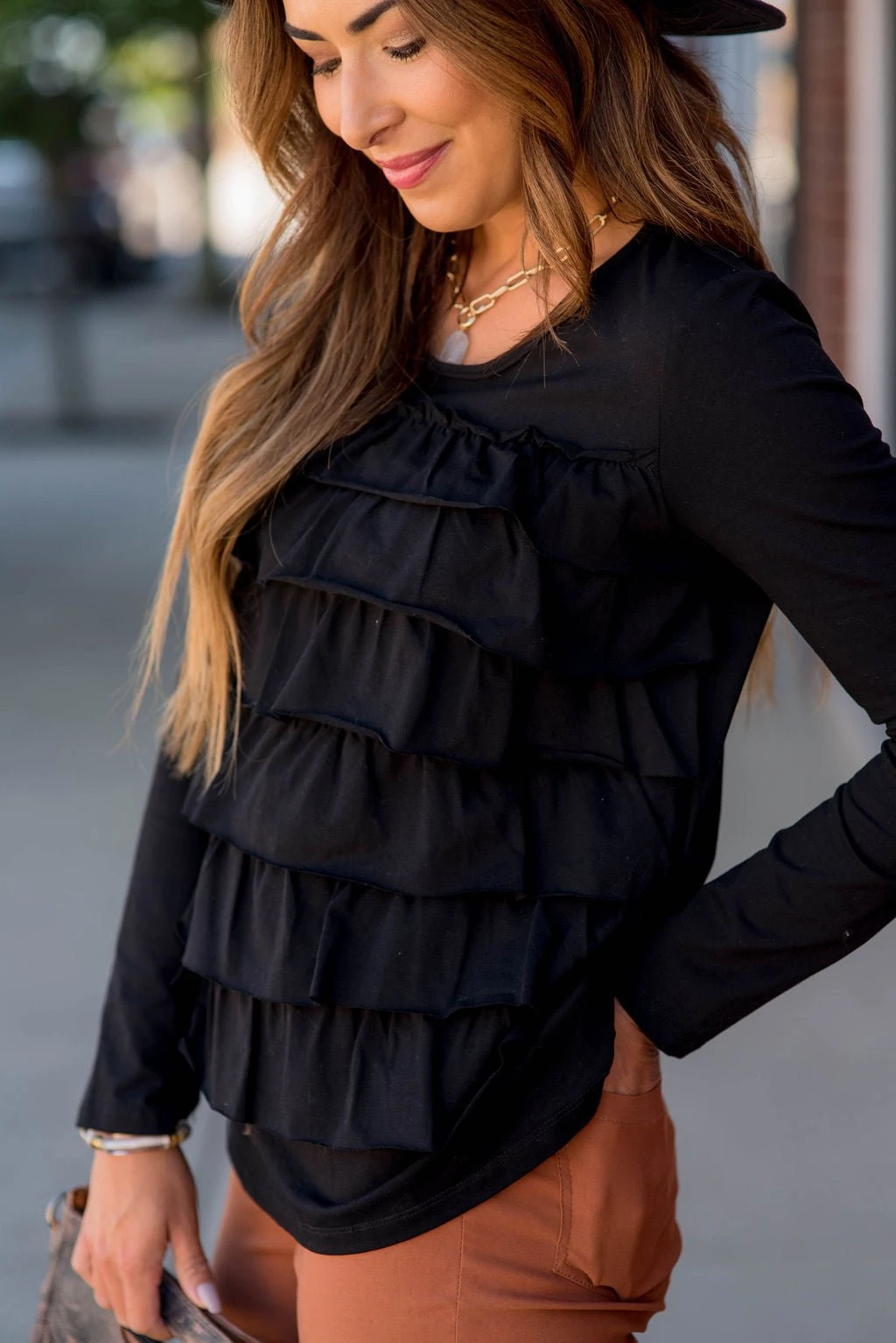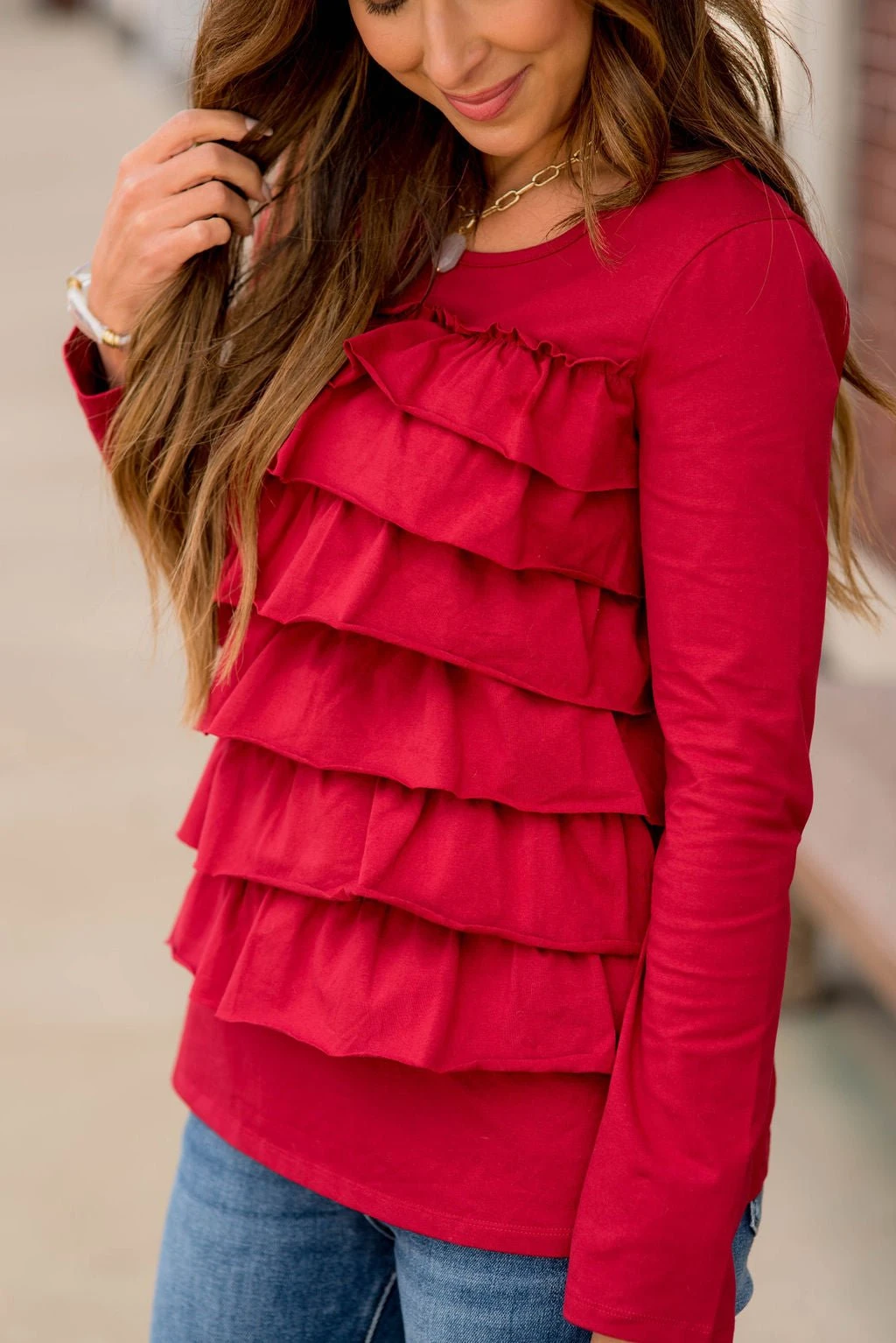 This ruffle long sleeve tee is just what you need! The multiple ruffles on the front give this tee a fun vibe!
