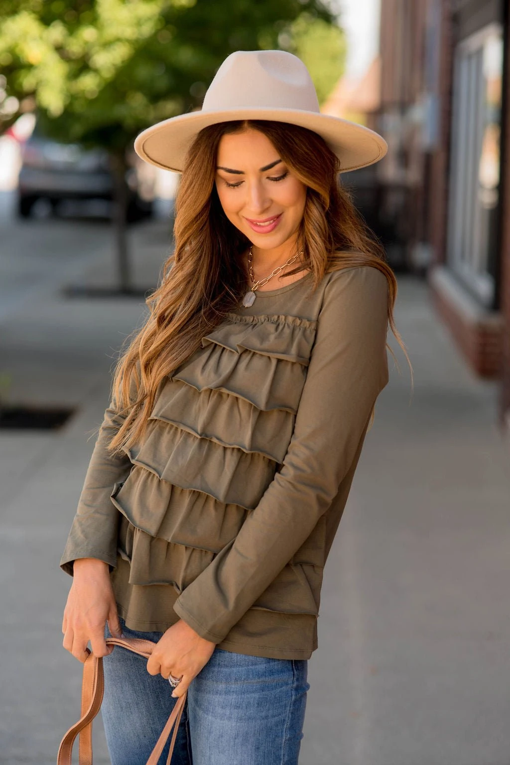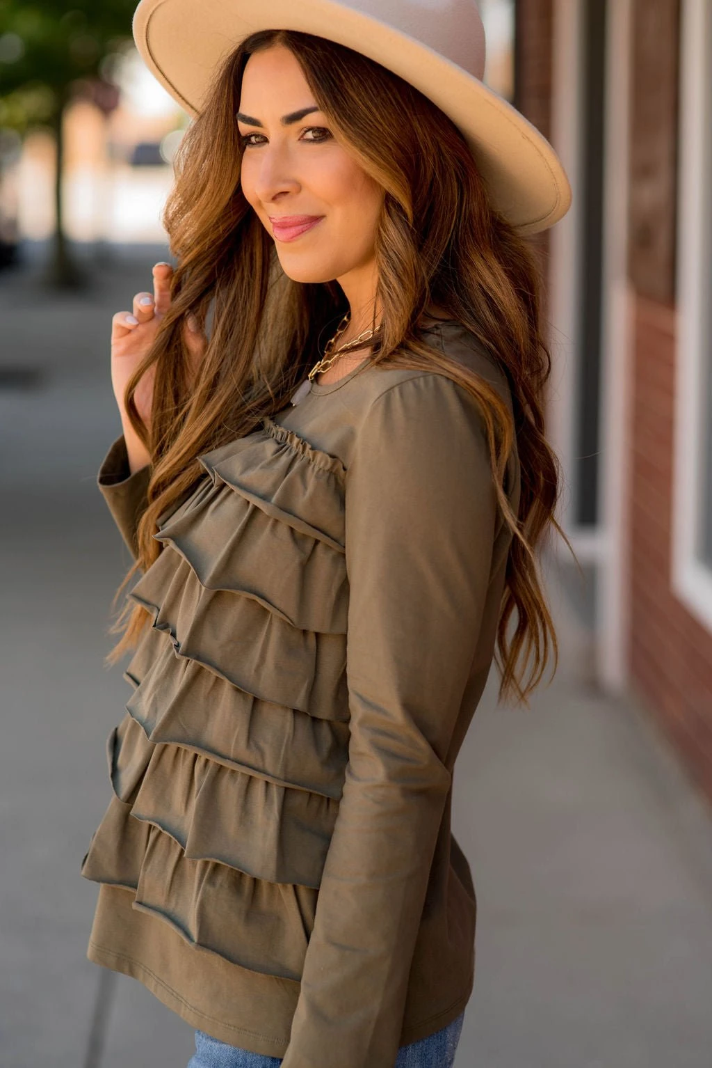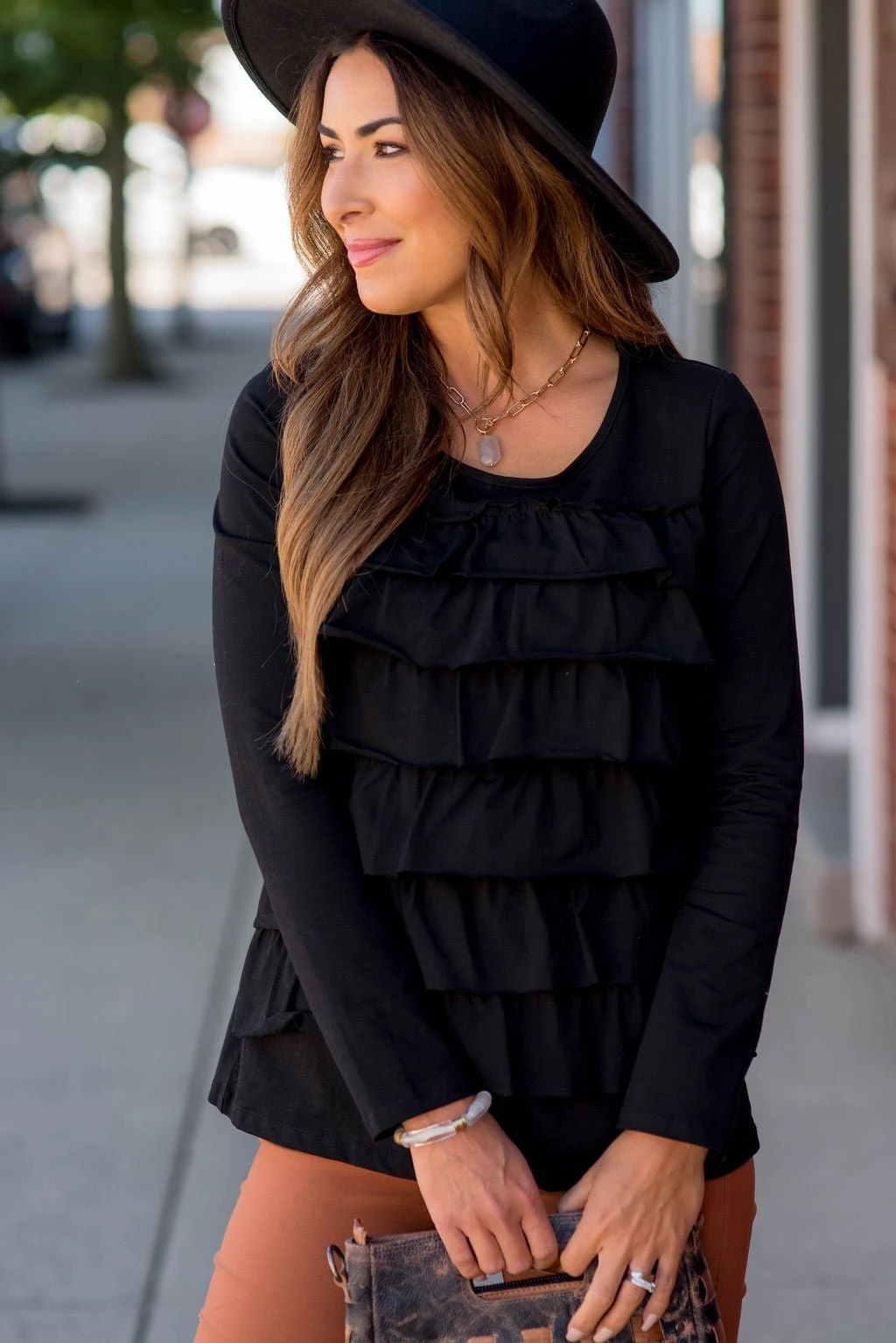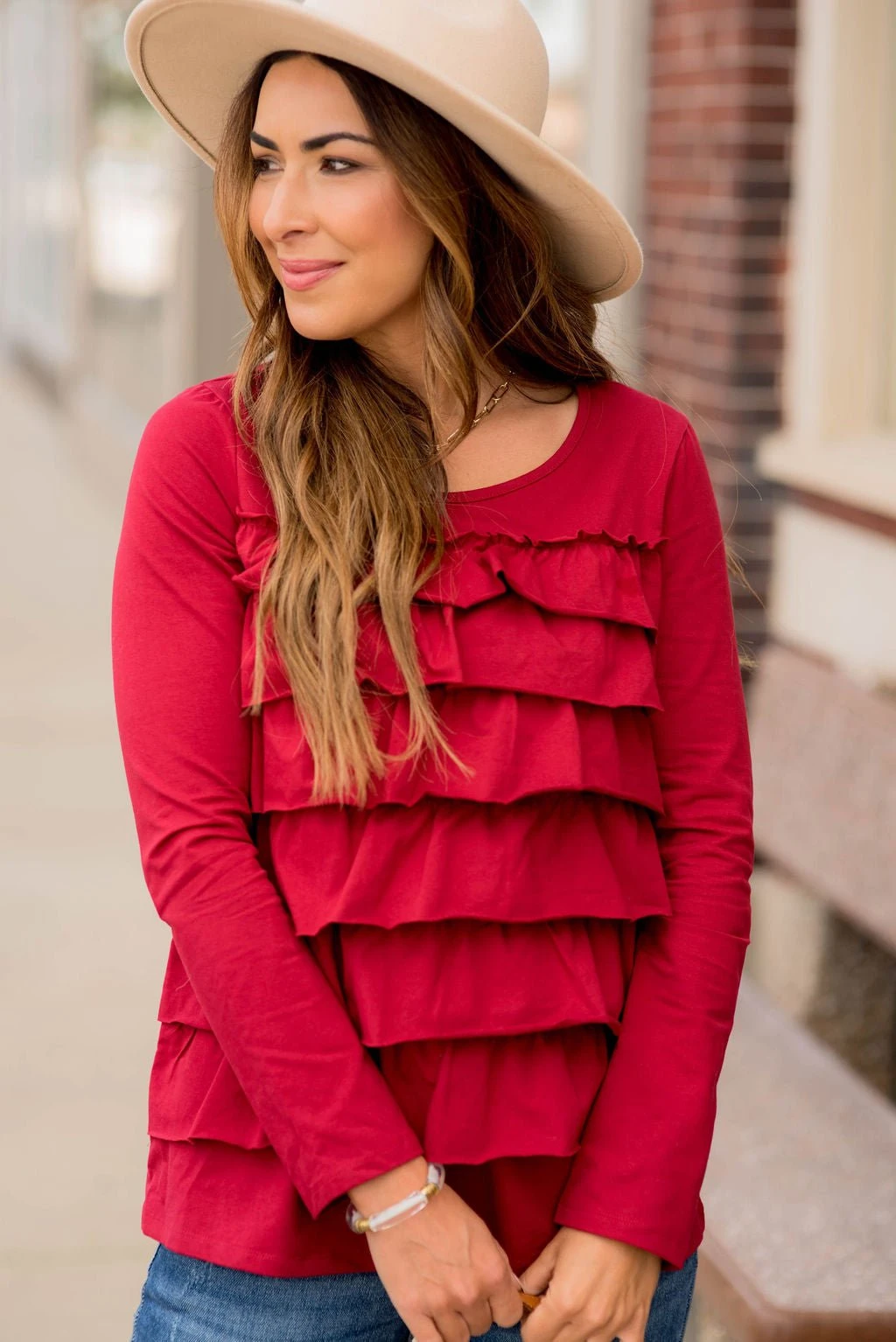 This ruffle long sleeve tee is just what you need! The multiple ruffles on the front give this tee a fun vibe!