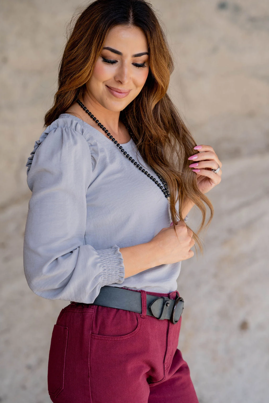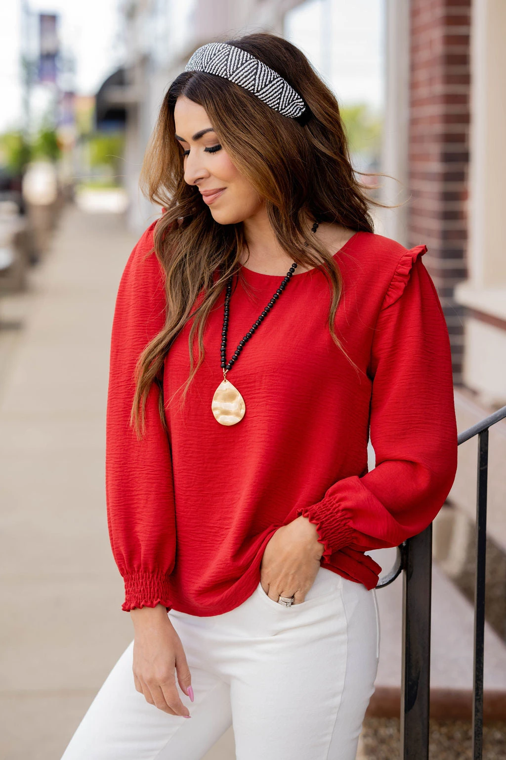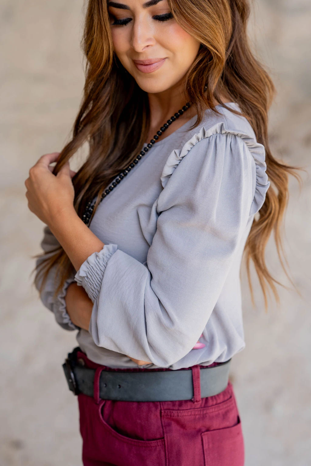 A simple long cinched-sleeved blouse with a fun added ruffle detailing to make it unique! Pair this with shorts or a skirt in the warmer months or with a cardigan or blazer in the cooler ones! This blouse is so easy to dress up or down with the addition of your favorite accessories!