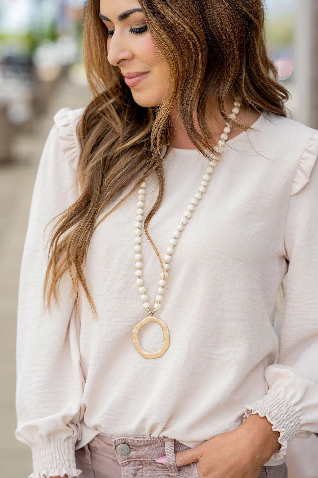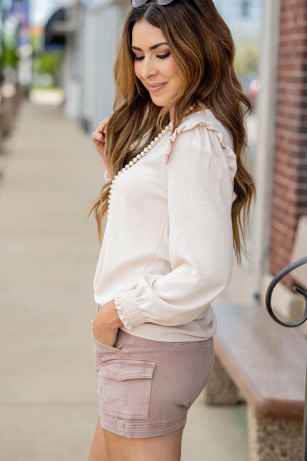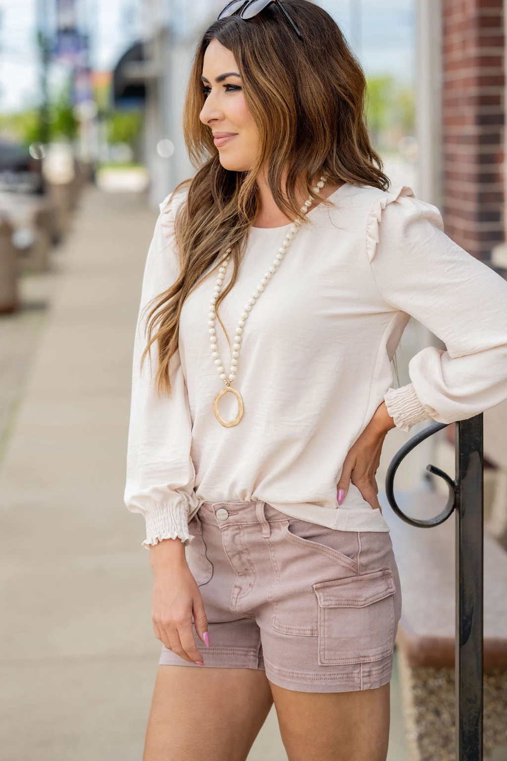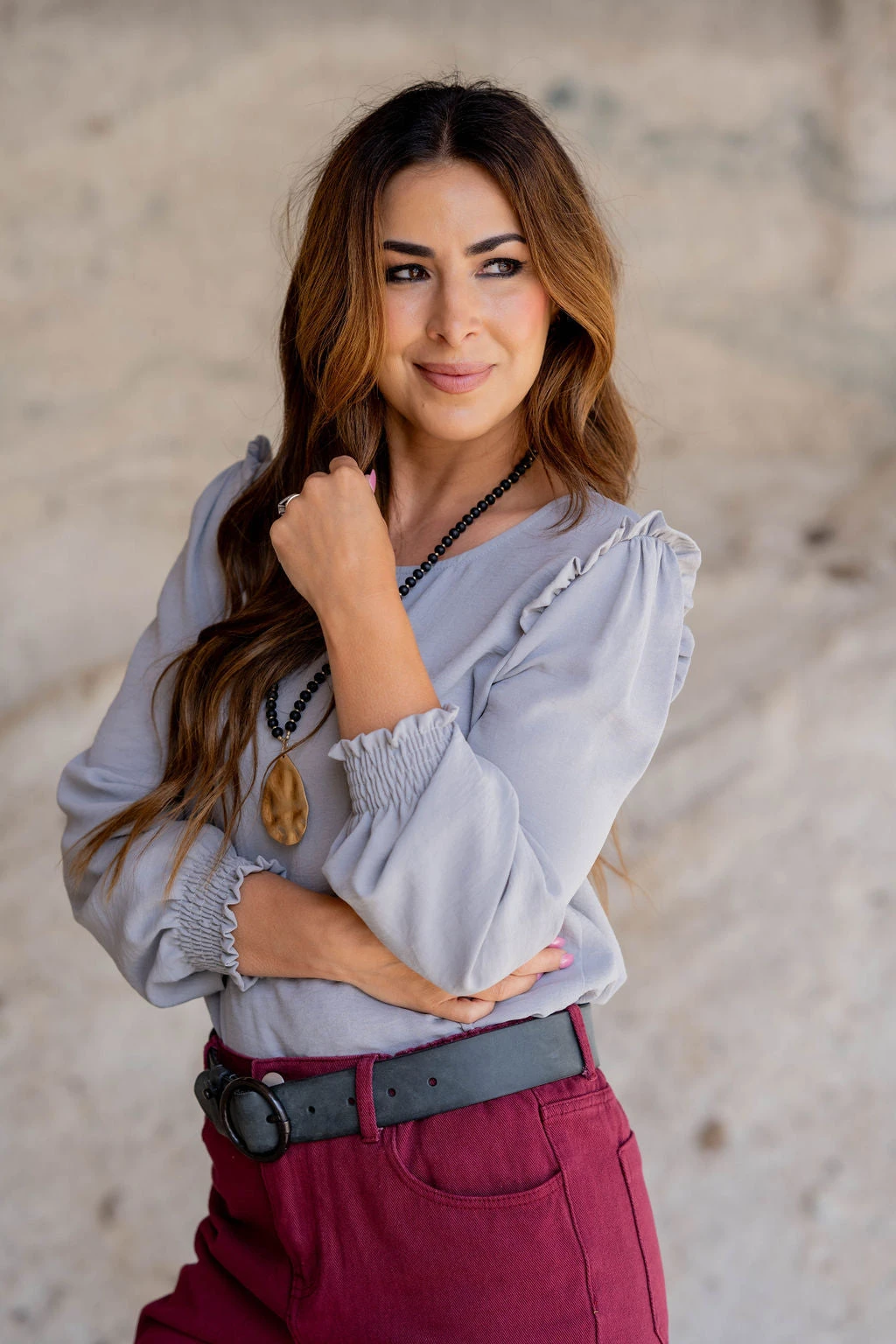A simple long cinched-sleeved blouse with a fun added ruffle detailing to make it unique! Pair this with shorts or a skirt in the warmer months or with a cardigan or blazer in the cooler ones! This blouse is so easy to dress up or down with the addition of your favorite accessories!