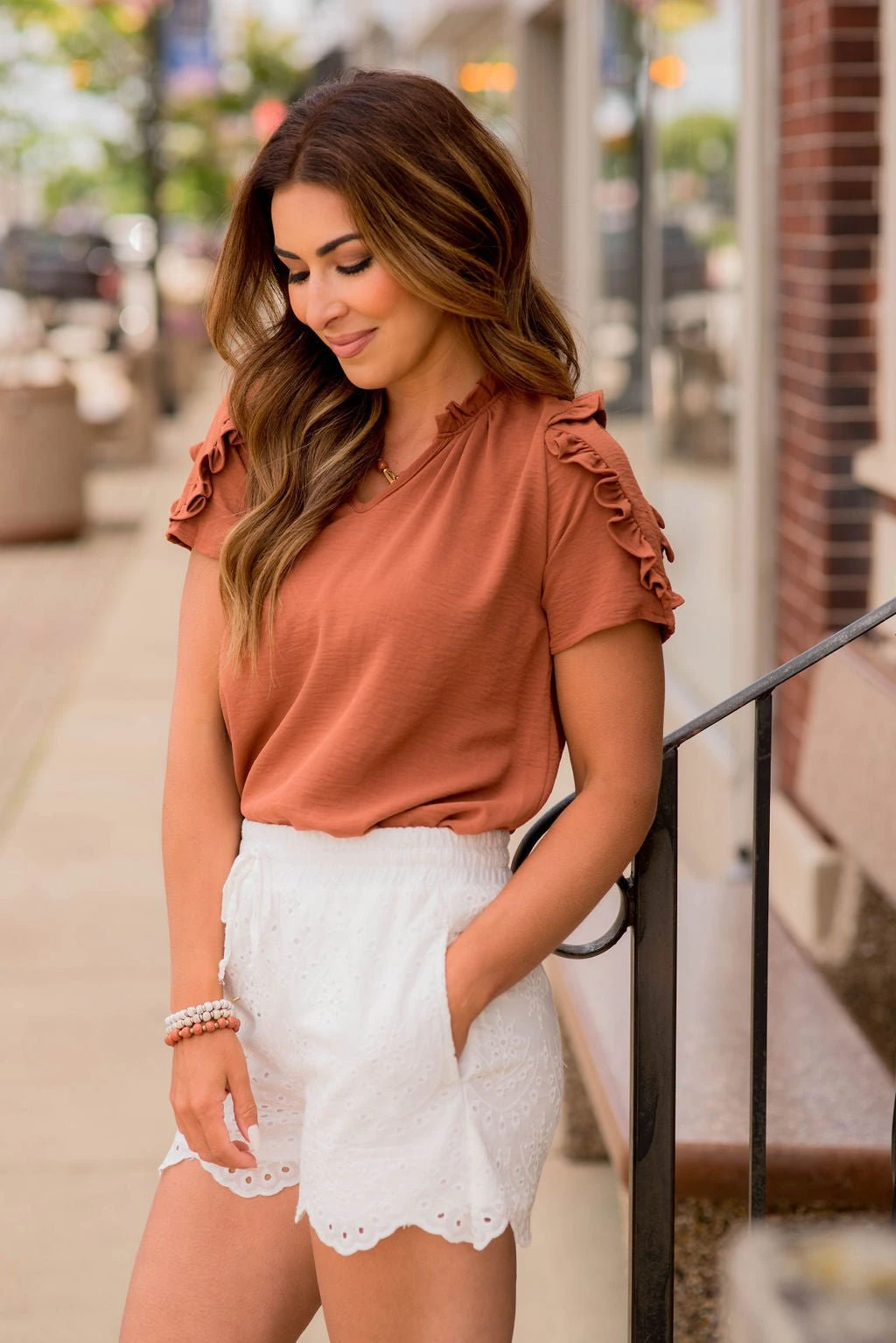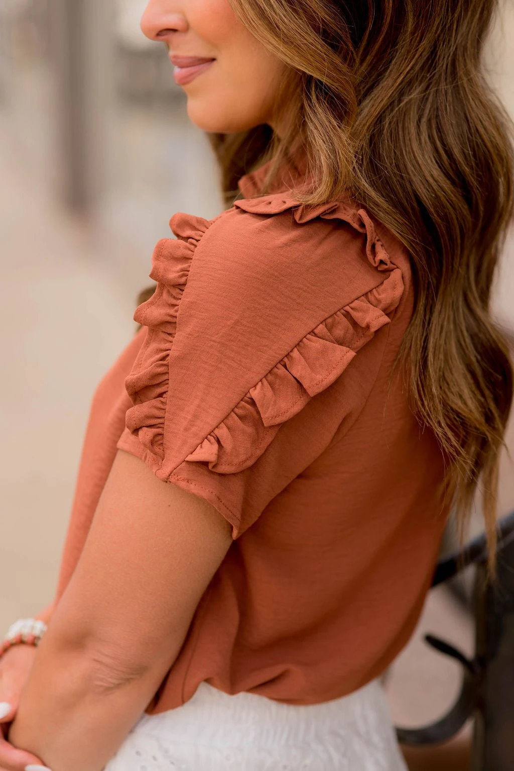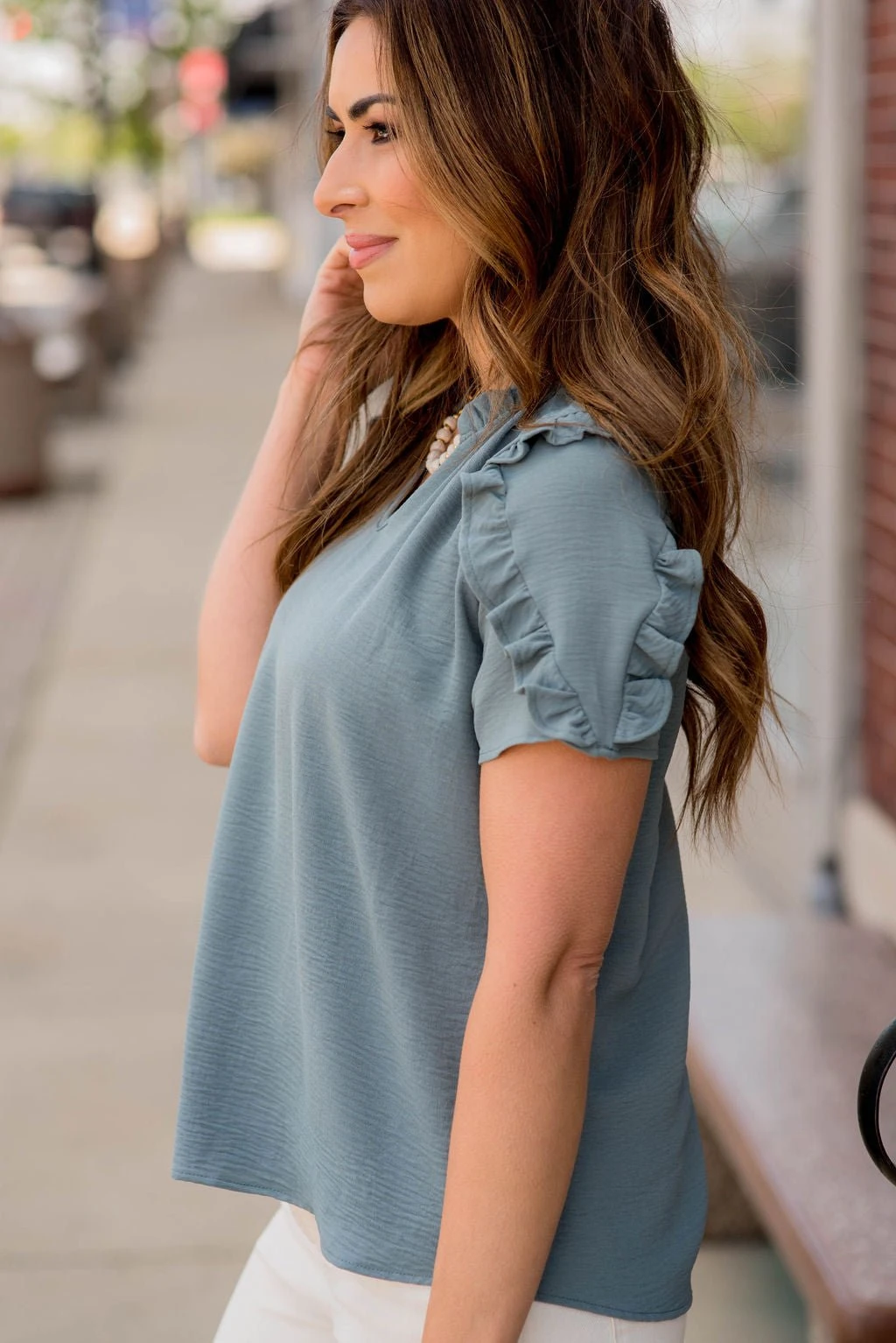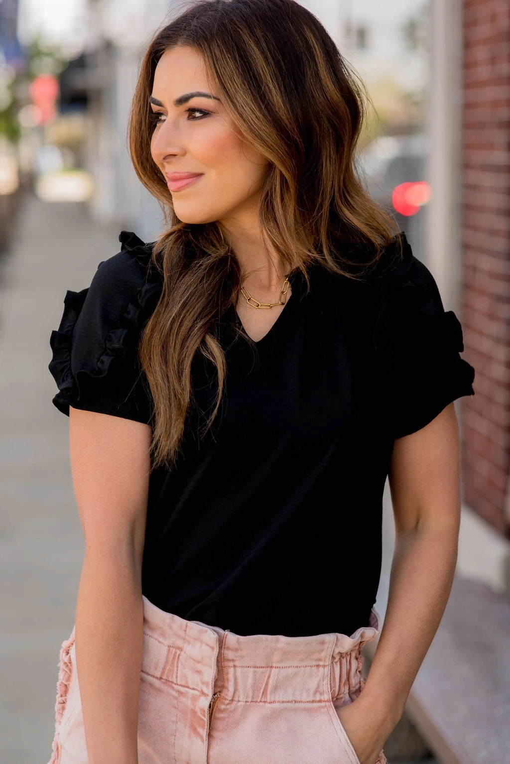 A simple short sleeved blouse with a fun added ruffle detailing to make it unique! Pair this with shorts or a skirt in the warmer months or with a cardigan or blazer in the cooler ones! This blouse is so easy to dress up or down with the addition of your favorite accessories!