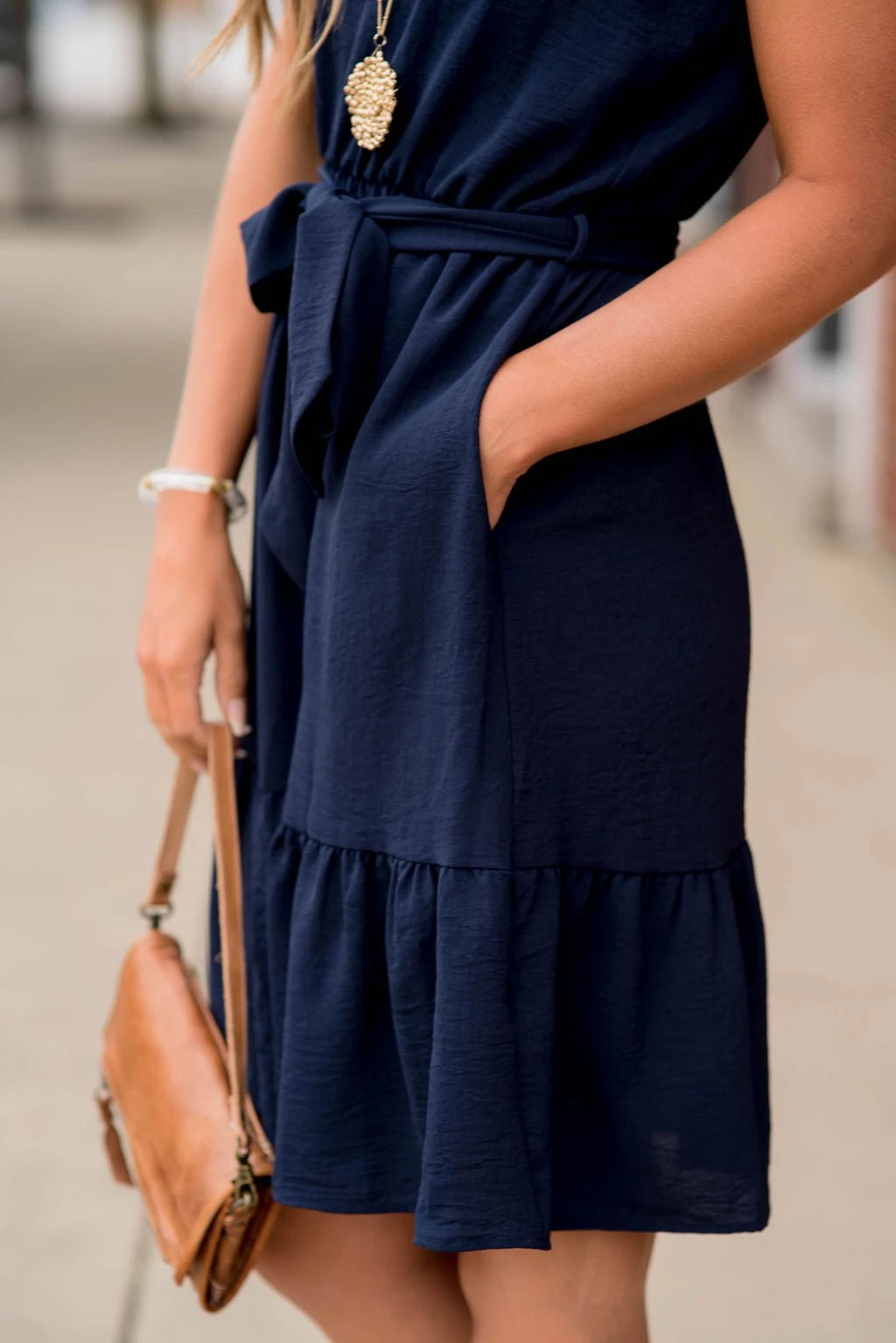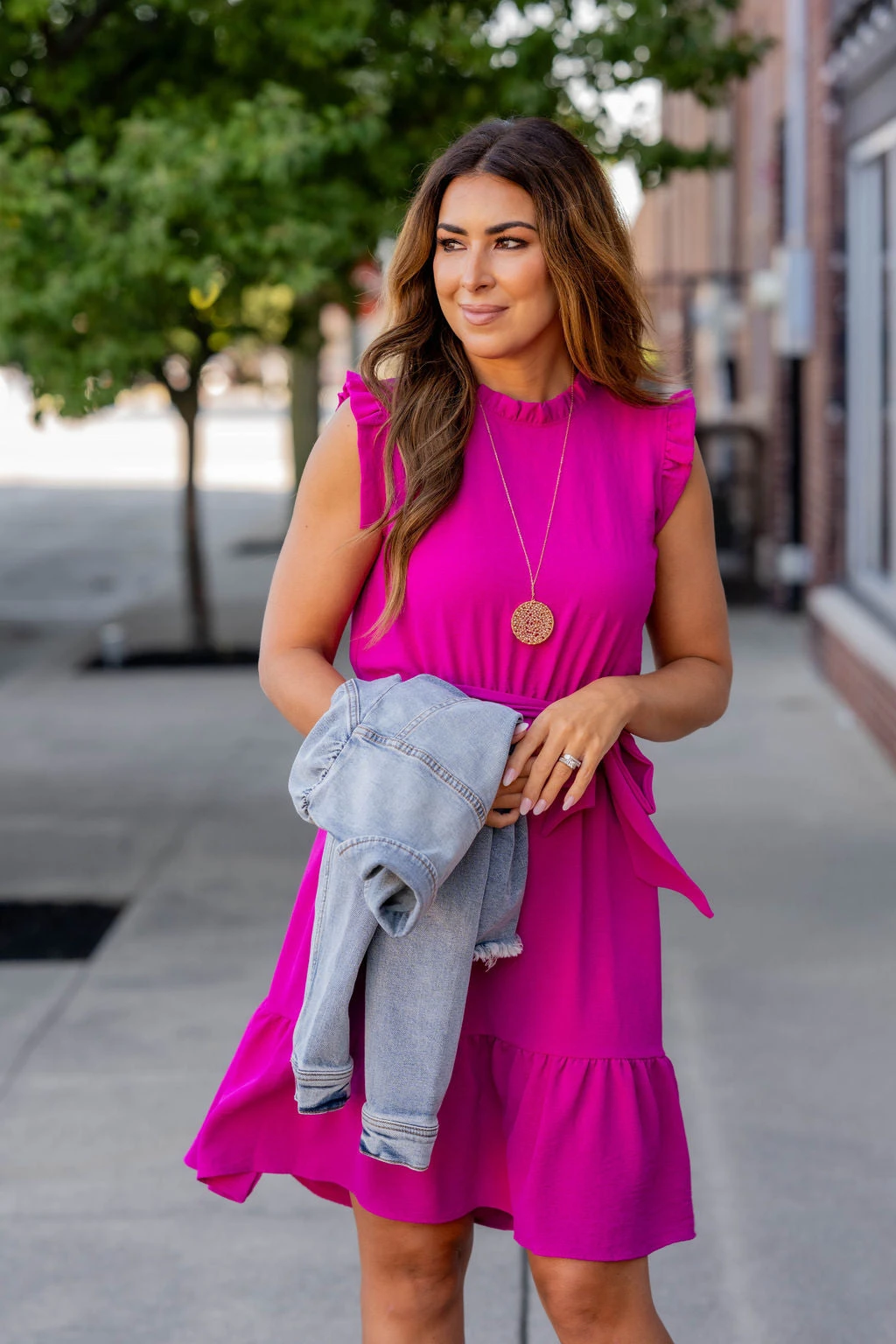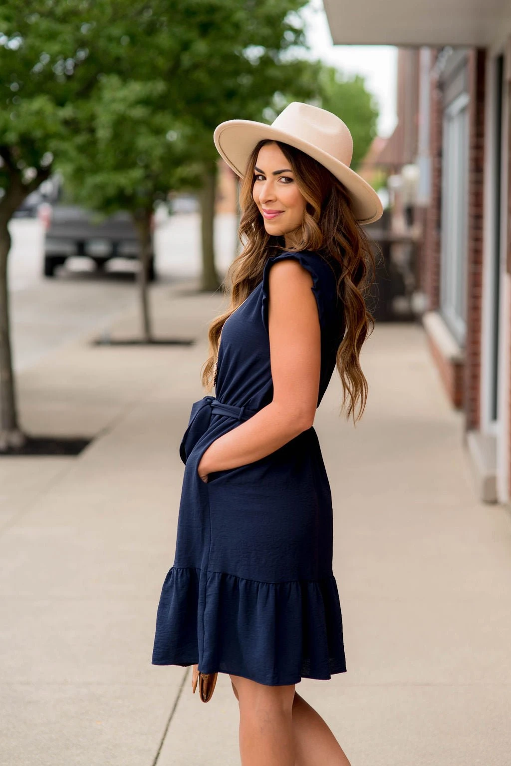 Looking for a dressy or casual outfit? Or both? This ruffled sleeve dress is the one for you. Cinched at the waist with an added tie, this outfit can be dressed up or down, depending on the mood you are in! Good for every season – add a cardigan and boots for Winter or Fall, sandals for Summer or Spring. This is a dress for all year!
