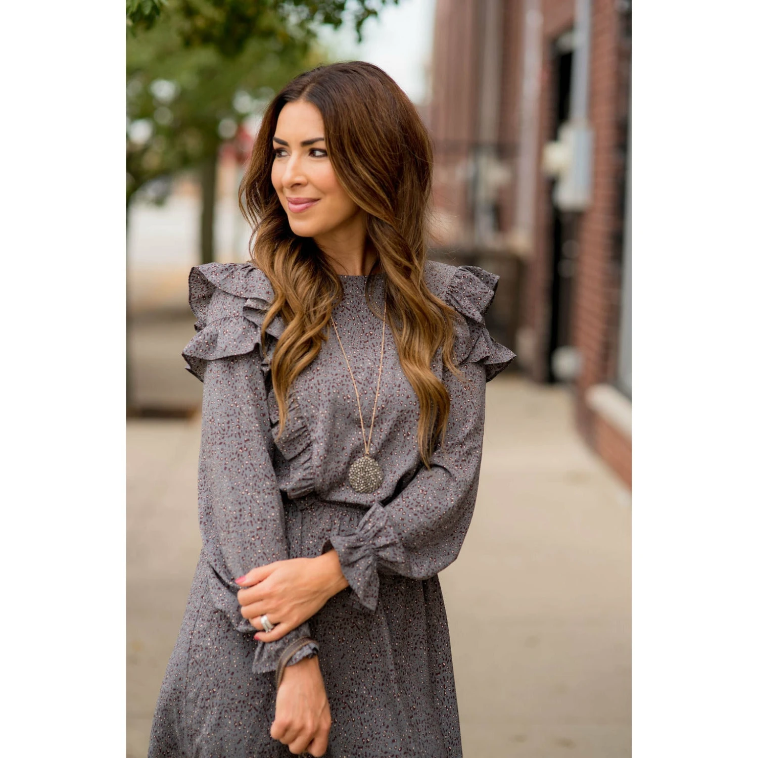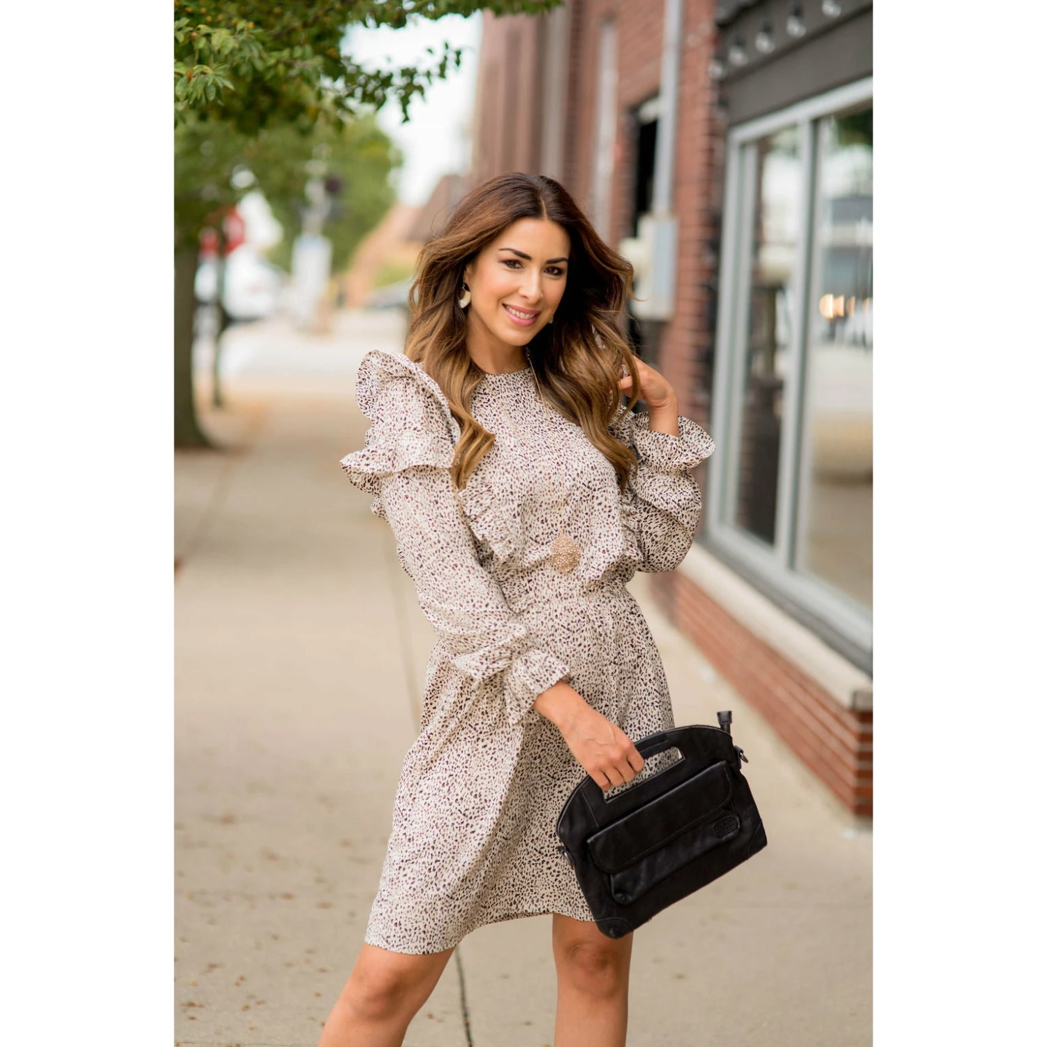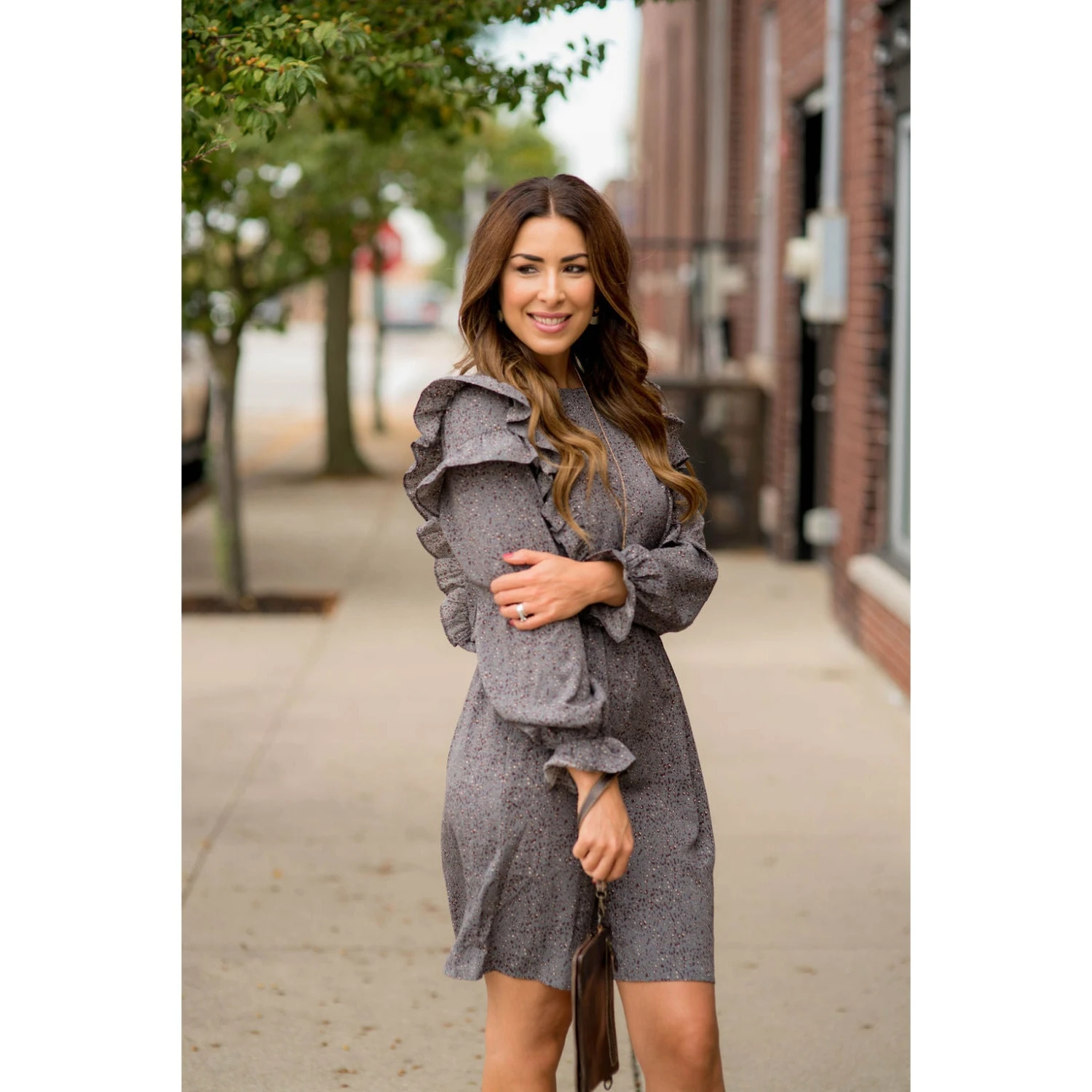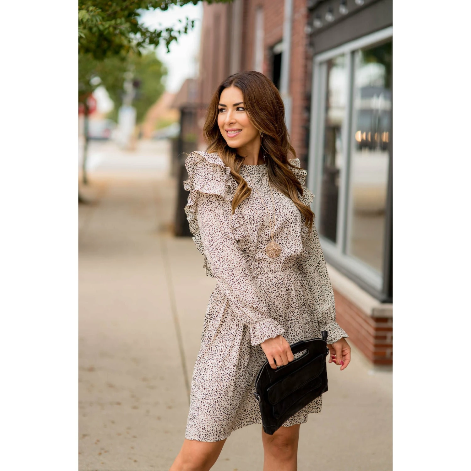 Looking for a dress that gives off a different look? This is the one! We are so in love with this patterned, long sleeved dress, with adorable ruffles around the sleeves, shoulders, and bodice!