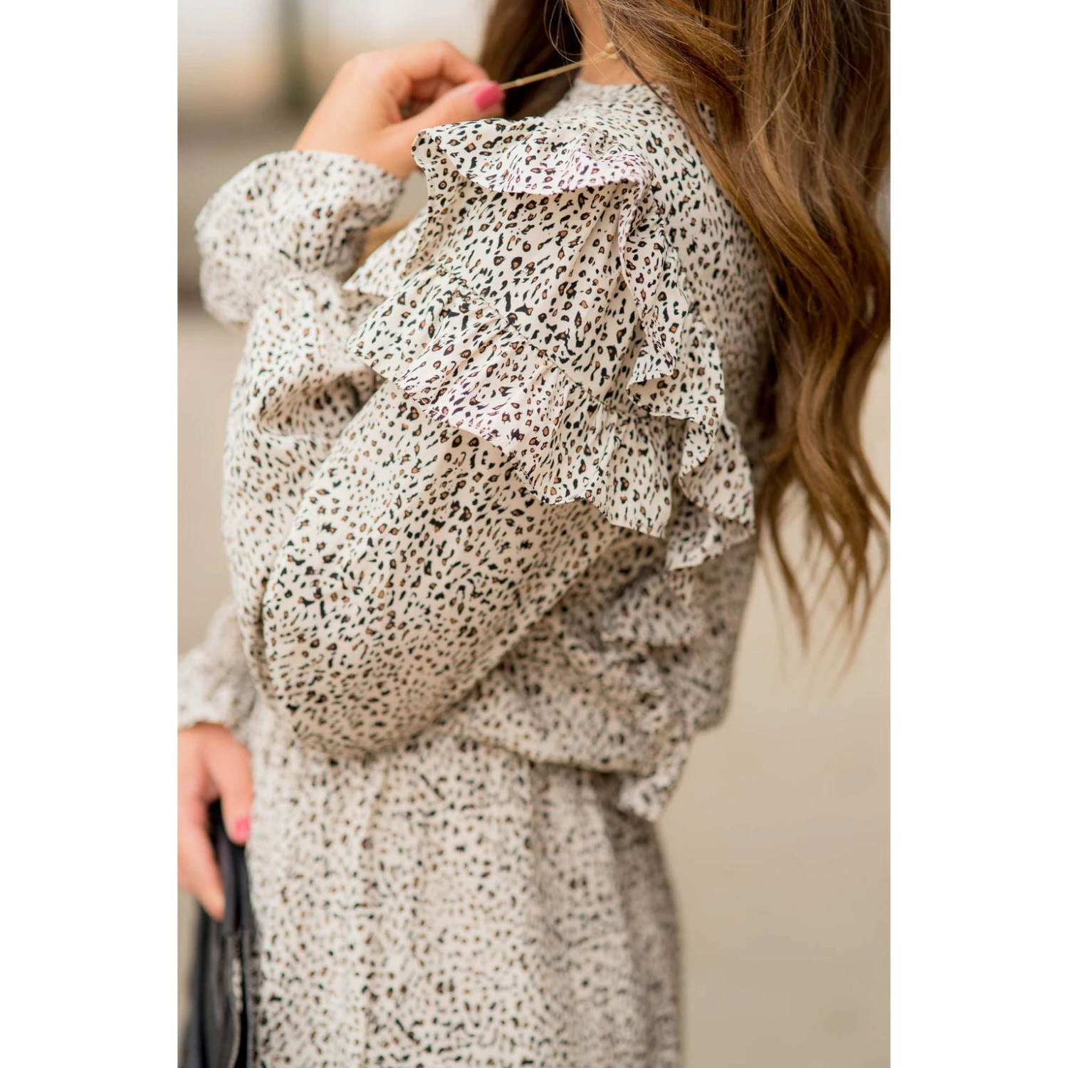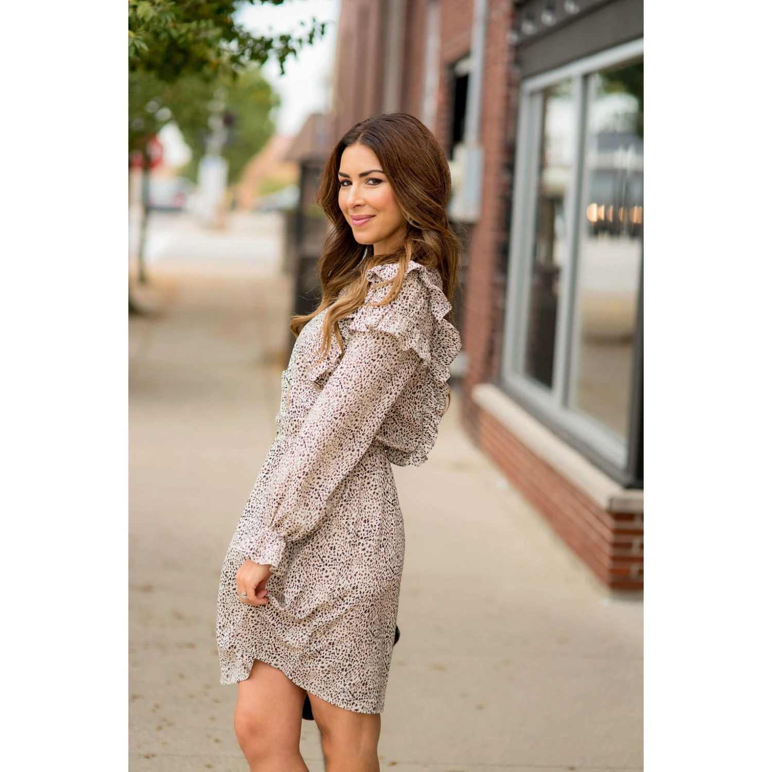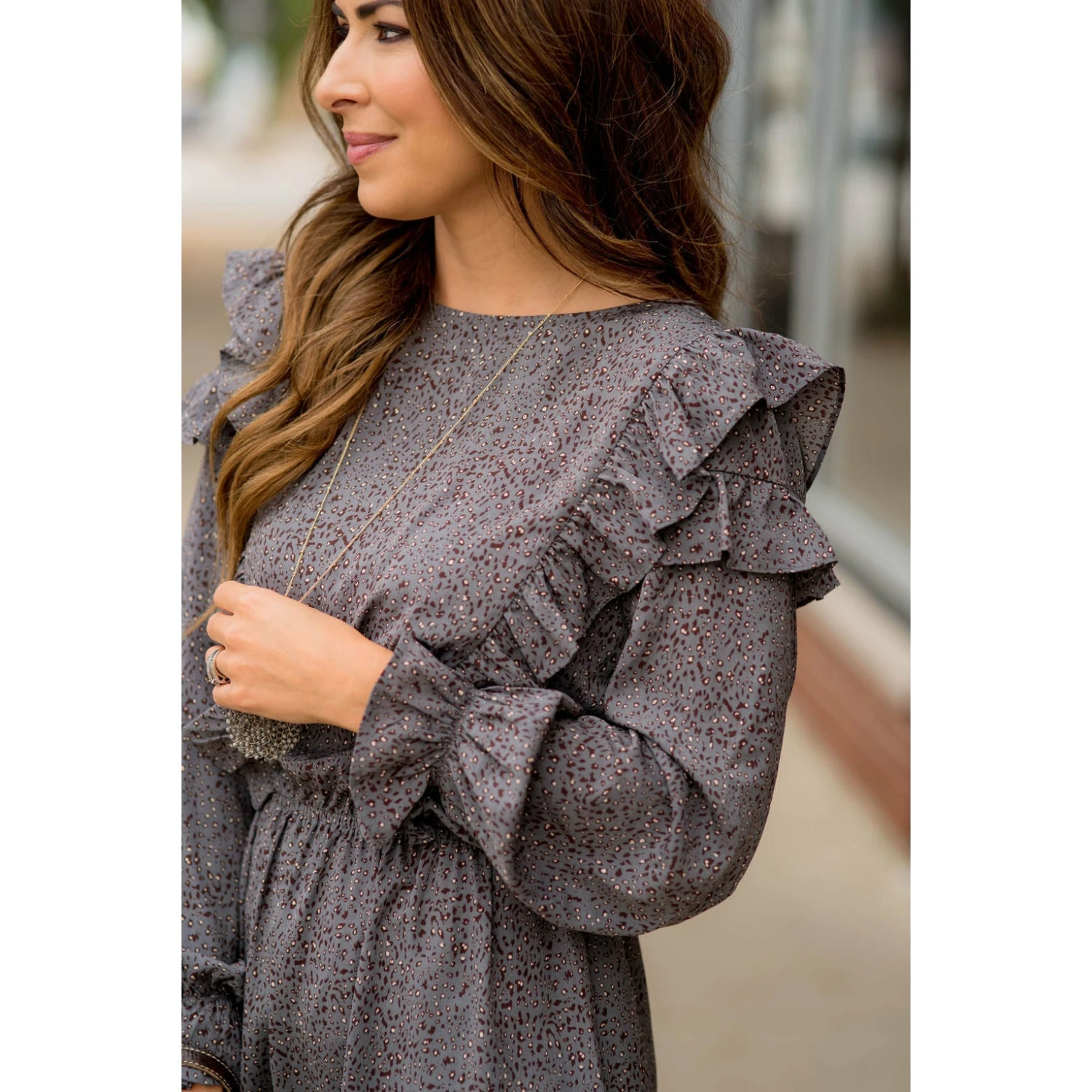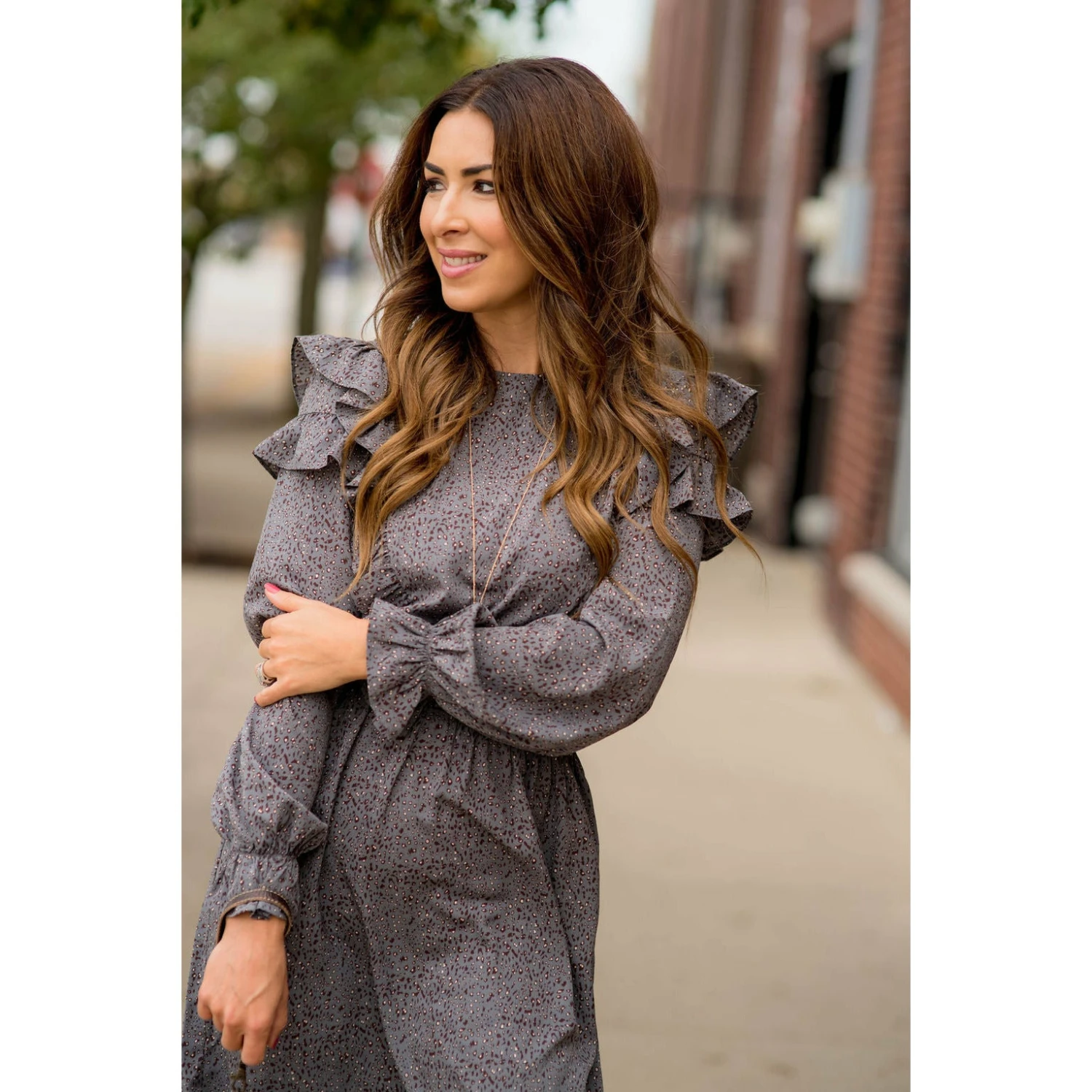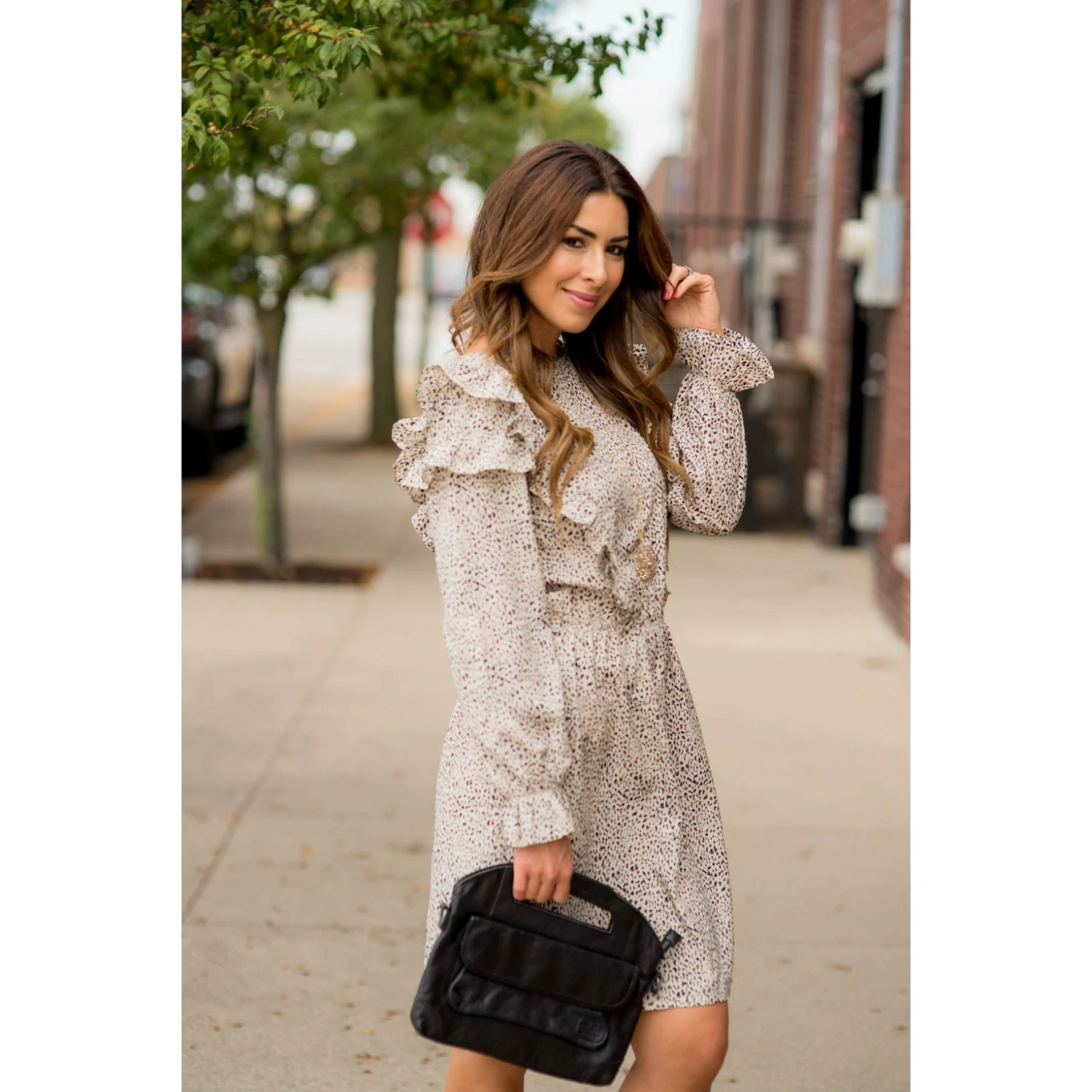 Looking for a dress that gives off a different look? This is the one! We are so in love with this patterned, long sleeved dress, with adorable ruffles around the sleeves, shoulders, and bodice!