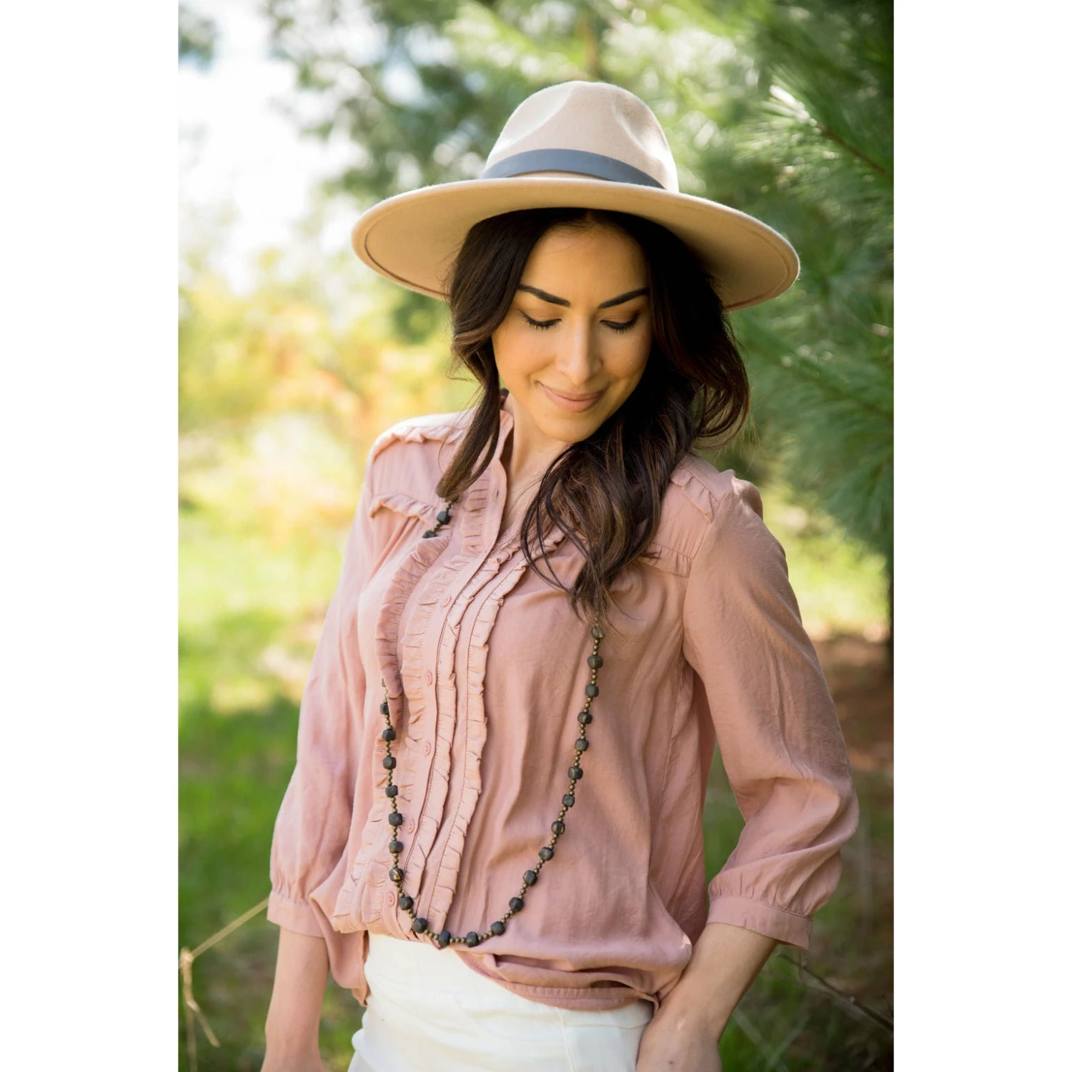 You are sure to be a beauty in this blouse! Adorable ruffle and button detailing completes this top!