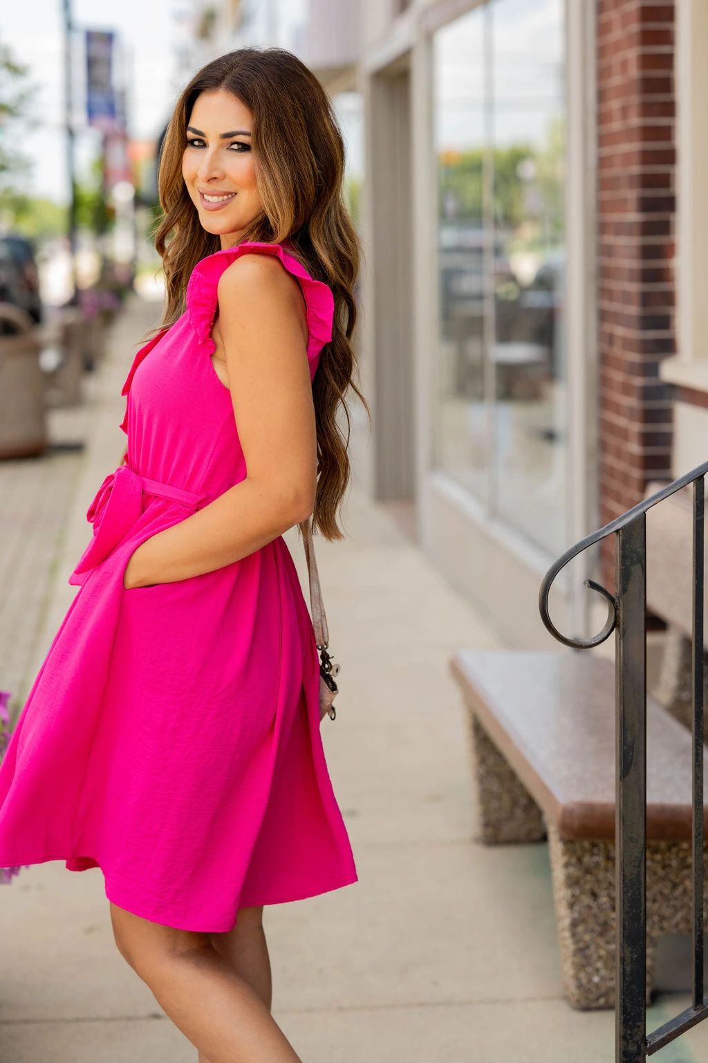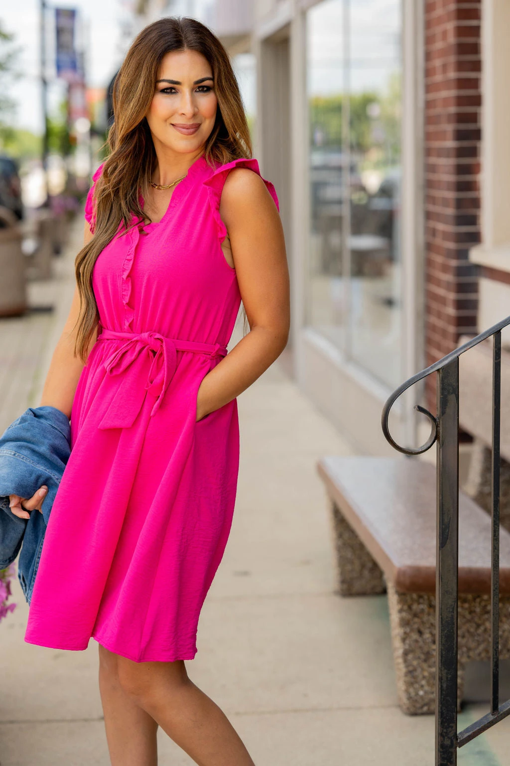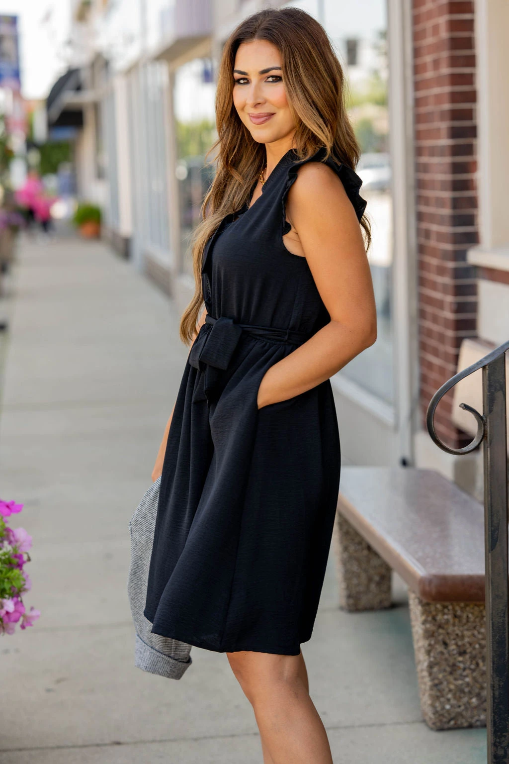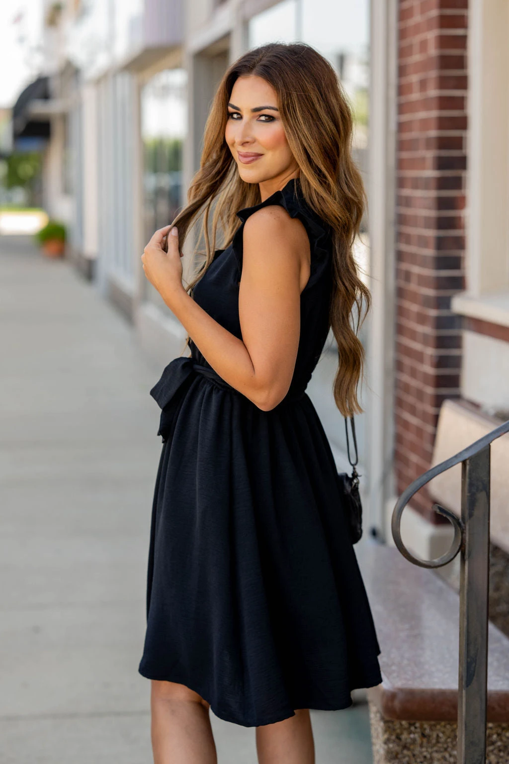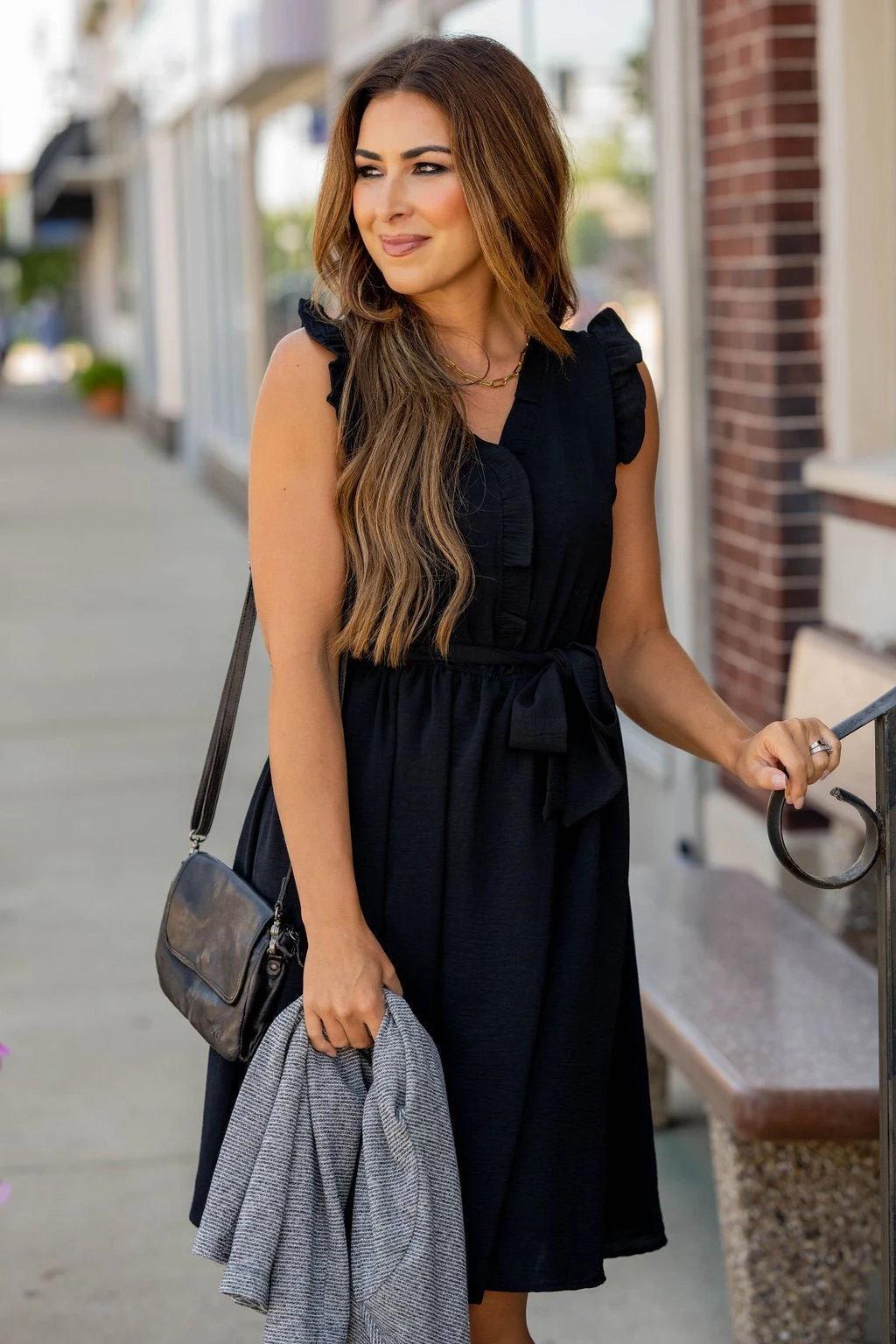 Looking for a dressy or casual dress? Or both? This ruffled trim dress is the one for you! Cinched at the waist with an added tie, this piece can be dressed up or down, depending on the mood you are in! Good for every season – add a cardigan and boots for Winter or Fall, sandals for Summer or Spring. This is a dress for all year!