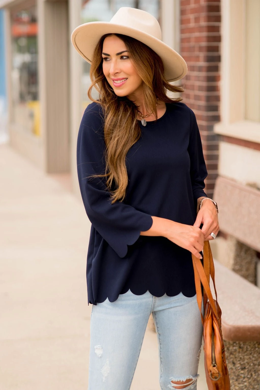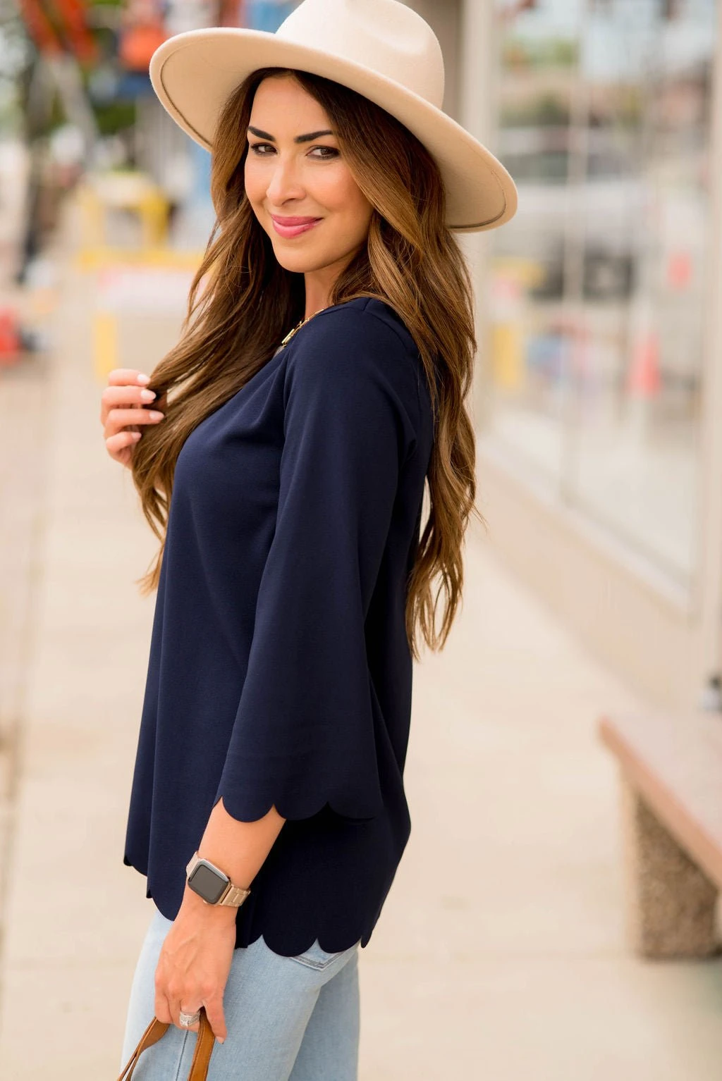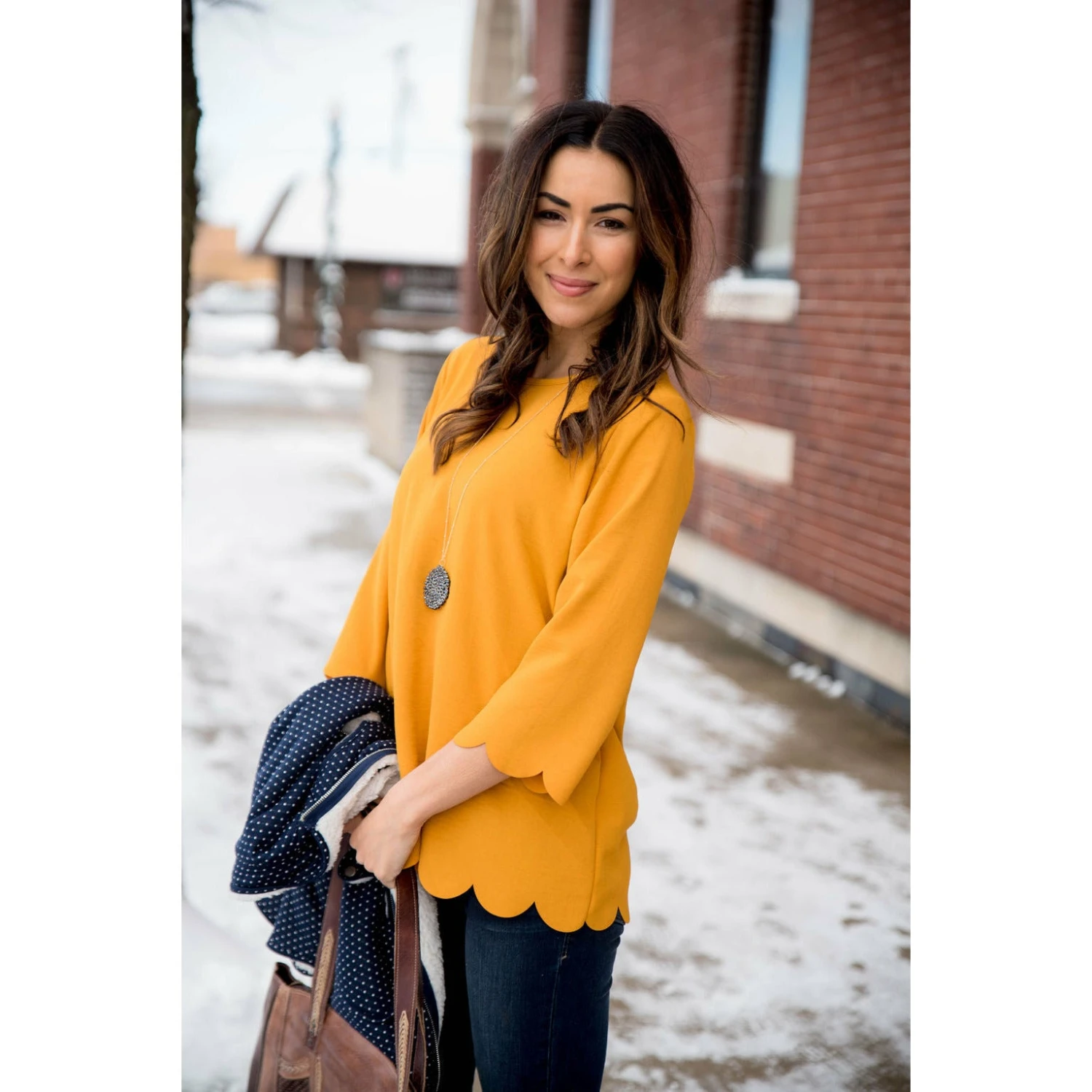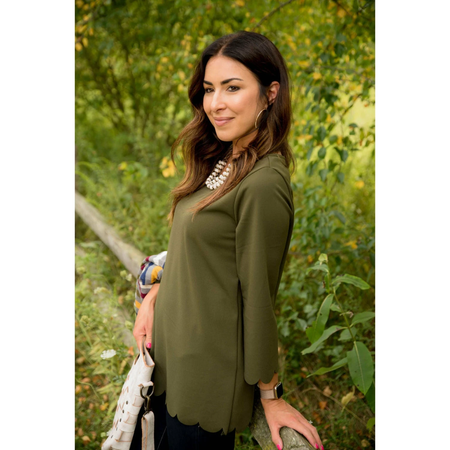 Add some color with this scalloped edge 3/4 sleeve blouse. It’s the perfect basic with a little bit of stretch!