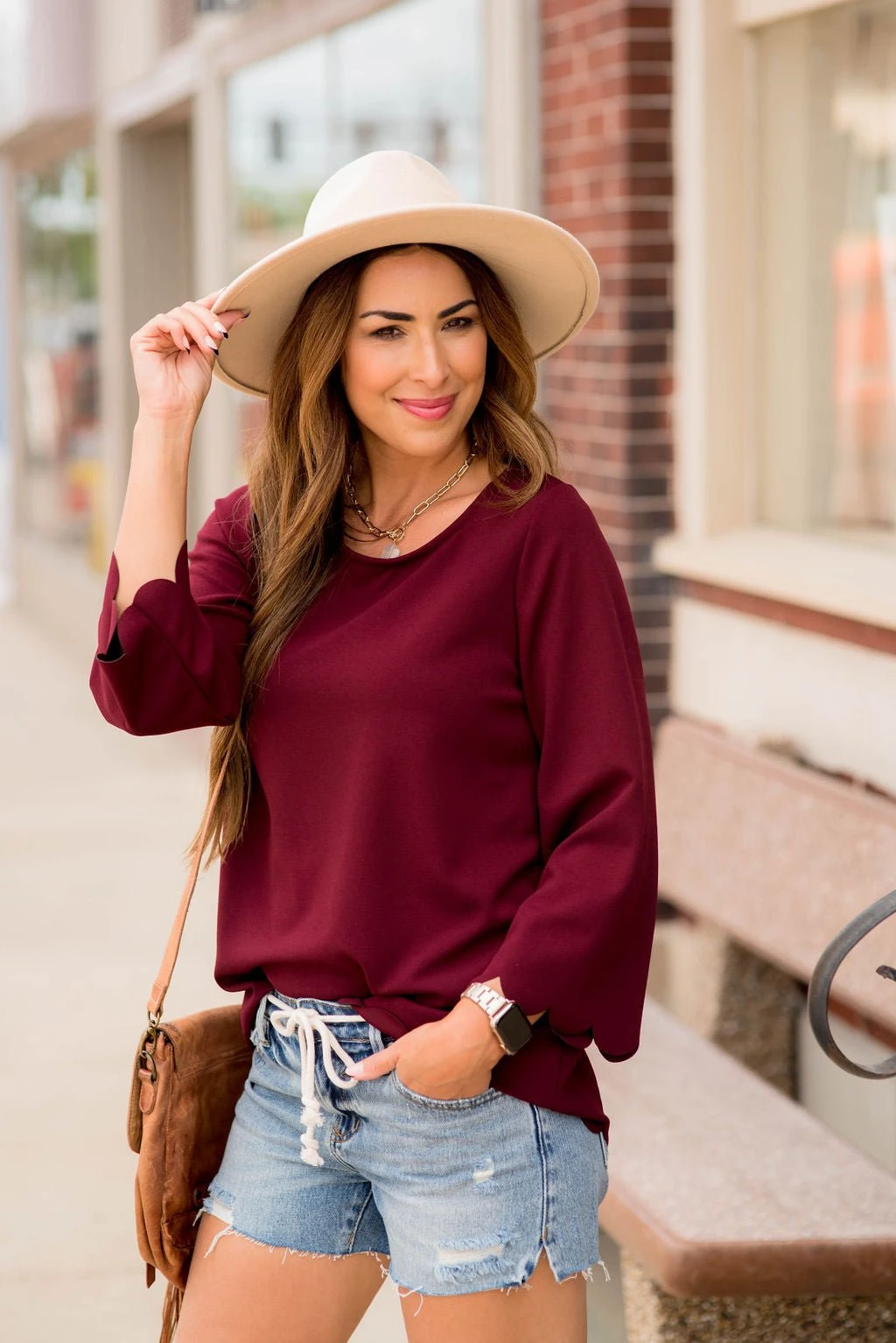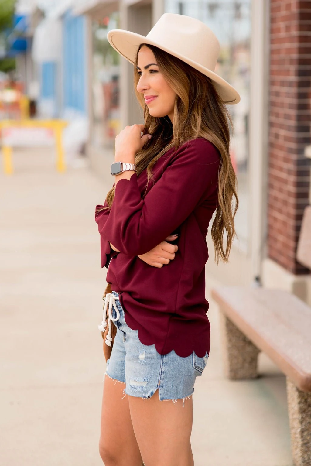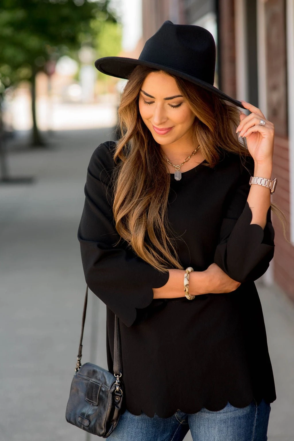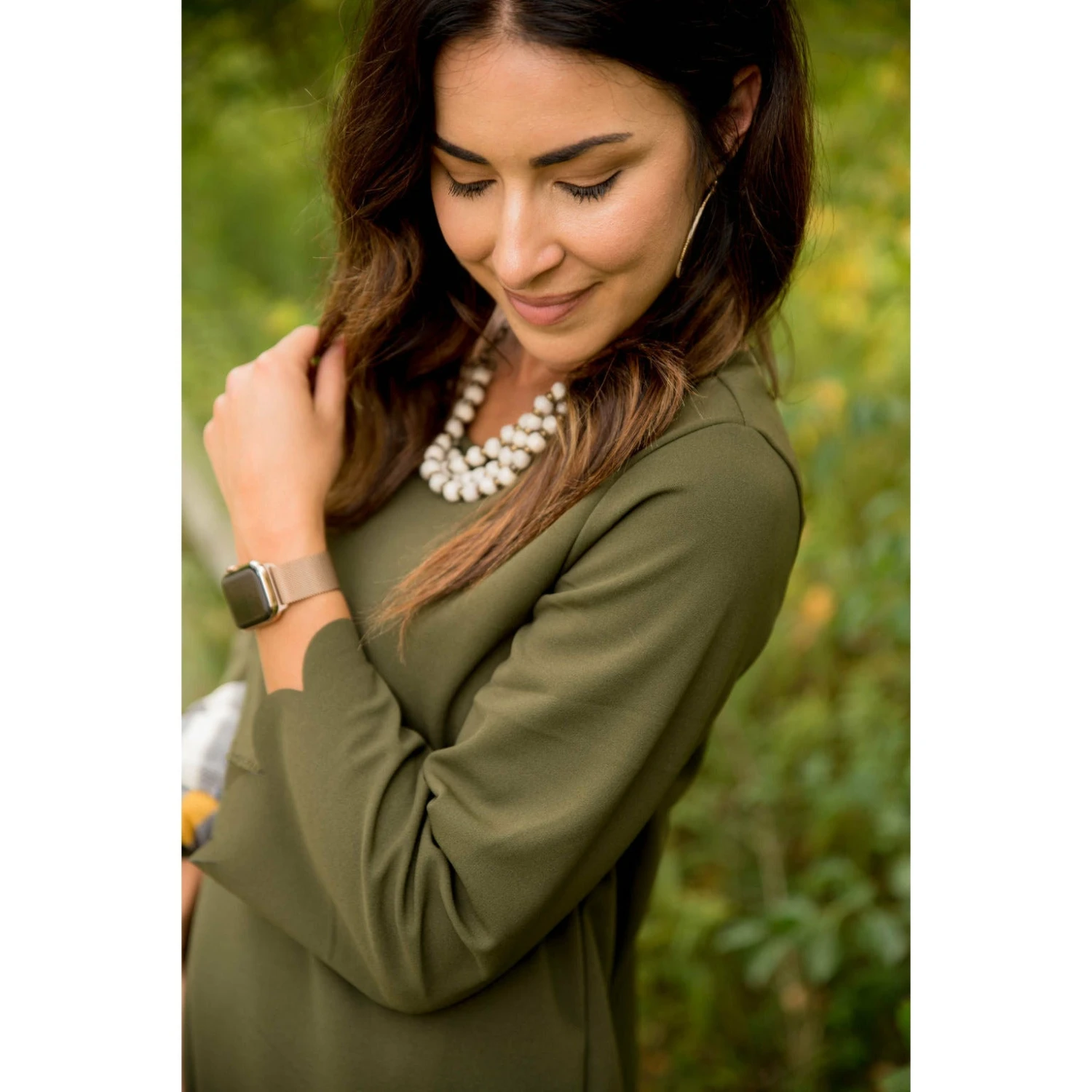 Add some color with this scalloped edge 3/4 sleeve blouse. It’s the perfect basic with a little bit of stretch!