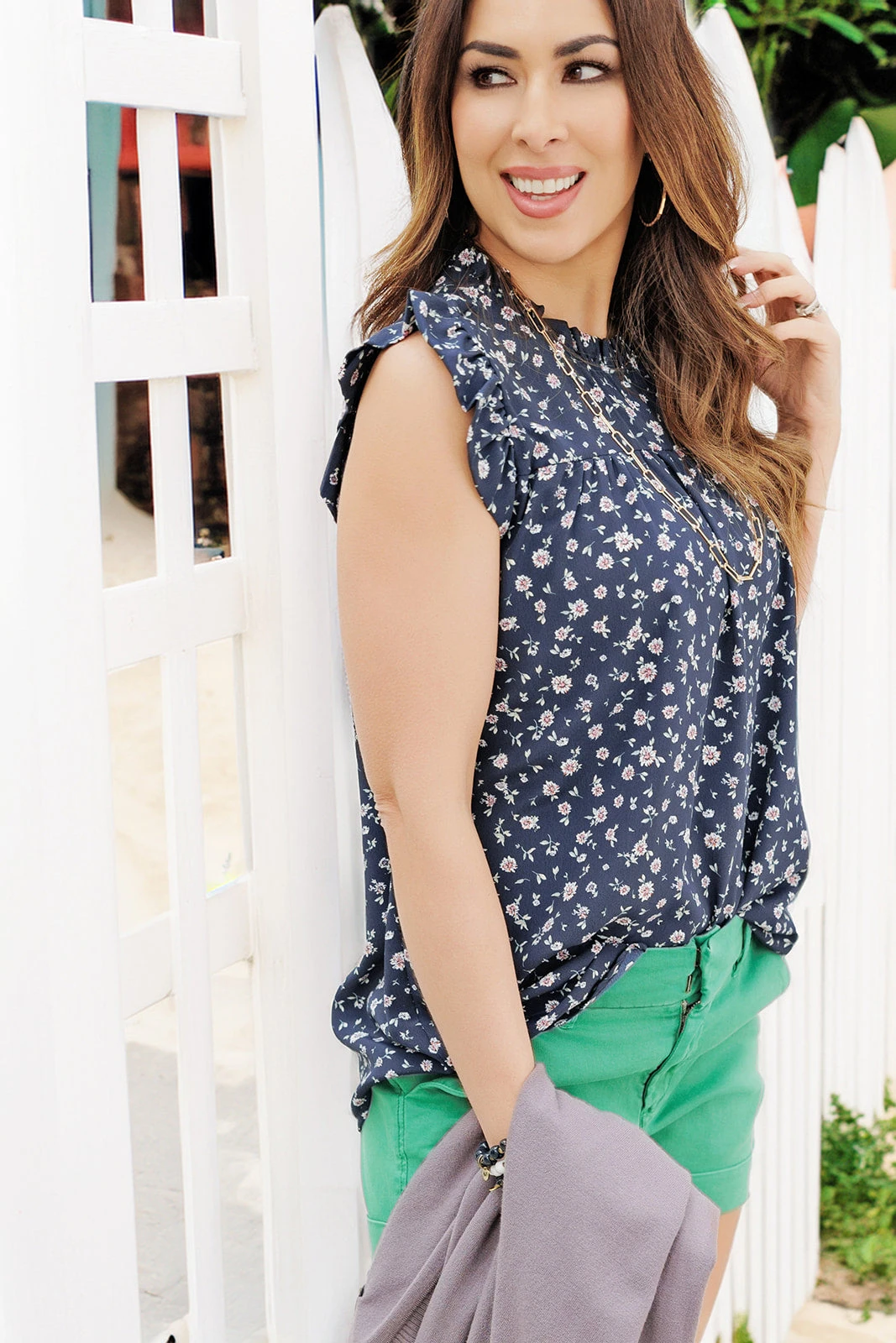 The daisy pattern of this tank with the ruffle trim and cinched neck really sets it apart from the rest! We love that you can pair this with shorts or a skirt in the warmer months or with a pair of denim and a cardigan for the cooler ones!
